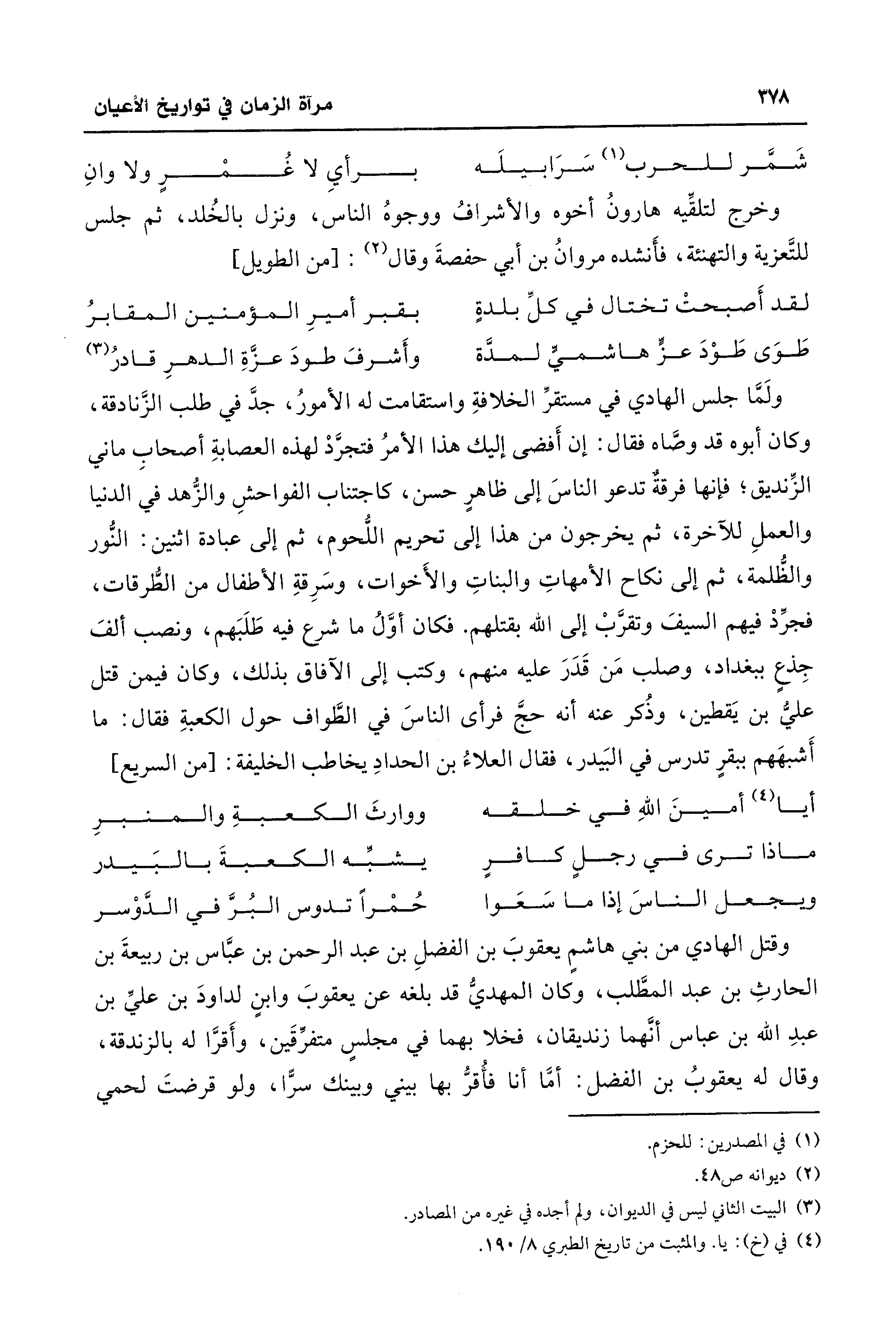 ولَمَّا جلس الهادي في مستقرِّ الخلافةِ واستقامت له الأمورُ، جدَّ في طلب الزنادقة، وكان أبوه قد وصَّاه فقال: إن أَفضى إليك هذا الأمرُ فتجرَّدْ لهذه العصابةِ أصحابِ ماني الزِّنديق؛ فإنَّها فرقةٌ تدعو النَّاسَ إلى ظاهرٍ حسن، كاجتناب الفواحشِ والزُّهد في الدنيا والعملِ للآخرة، ثم يخرجون من هذا إلى تحريم اللُّحوم، ثم إلى عبادة اثنين: النُّور والظُّلمة، ثم إلى نكاح الأمهاتِ والبناتِ والأَخوات، وسَرِقةِ الأطفال من الطُّرقات، فجرِّدْ فيهم السيفَ وتقرَّبْ إلى الله بقتلهم. فكان أوَّلُ ما شرع فيه طَلَبَهم، ونصب ألفَ جِذعٍ ببغداد، وصلب مَن قَدَرَ عليه منهم، وكتب إلى الآفاق بذلك، وكان فيمن قتل عليُّ بن يَقطين، وذُكر عنه أنَّه حجَّ فرأى النَّاسَ في الطَّواف حول الكعبةِ فقال: ما أَشبهَهم ببقرٍ تدرس في البَيدر، فقال العلاءُ بن الحدادِ يخاطب الخليفة: [من السريع]