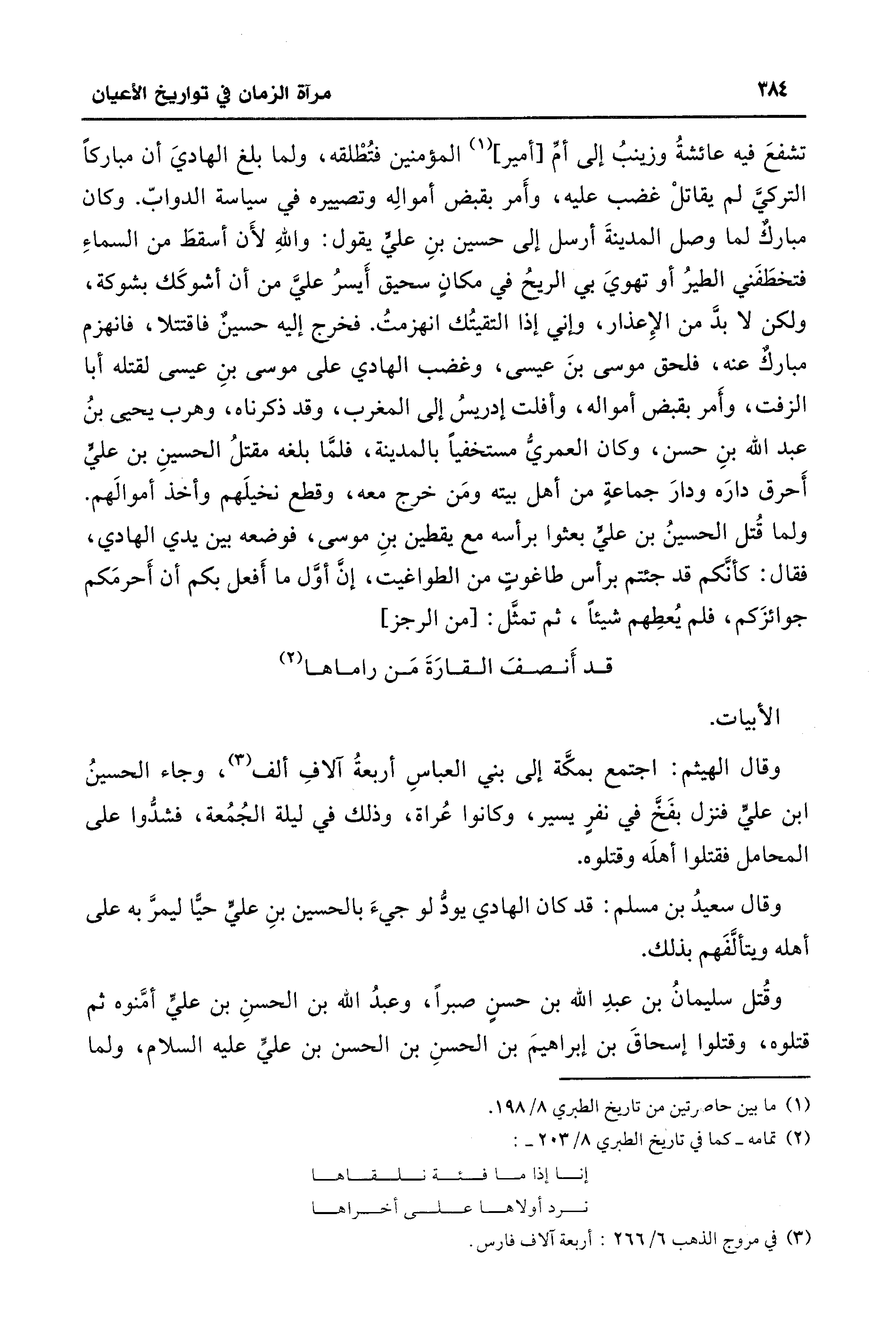 تشفعَ فيه عائشةُ وزينبُ إلى أمِّ [أمير] (¬1) المُؤْمنين فتُطْلقه، ولما بلغ الهاديَ أن مباركًا التركيَّ لم يقاتلْ غضب عليه، وأَمر بقبض أموالِه وتصييره في سياسة الدوابّ. وكان مباركٌ لما وصل المدينةَ أرسل إلى حسين بنِ على يقول: واللهِ لأَن أسقطَ من السماءِ فتخطَفَني الطيرُ أو تهويَ بي الريحُ في مكانٍ سحيق أَيسرُ عليَّ من أن أشوكَك بشوكة، ولكن لا بدَّ من الإِعذار، وإني إذا التقيتُك انهزمتُ. فخرج إليه حسينٌ فاقتتلا، فانهزم مباركٌ عنه، فلحق موسى بنَ عيسى، وغضب الهادي على موسى بنِ عيسى لقتله أَبا الزفت، وأَمر بقبض أمواله، وأفلت إدريسُ إلى المغرب، وقد ذكرناه، وهرب يحيى بنُ عبد الله بنِ حسن، وكان العمريُّ مستخفيًا بالمدينة، فلما بلغه مقتلُ الحسينِ بن عليّ أَحرق دارَه ودارَ جماعةٍ من أهل بيته ومَن خرج معه، وقطع نخيلَهم وأخذ أموالهم. ولما قُتل الحسينُ بن عليٍّ بعثوا برأسه مع يقطين بنِ موسى، فوضعه بين يدي الهادي، فقال: كأنَّكم قد جئتم برأس طاغوتٍ من الطواغيت، إنَّ أوَّل ما أَفعل بكم أن أَحرمَكم جوائزَكم، فلم يُعطِهم شيئًا، ثم تمثَّل: [من الرجز]