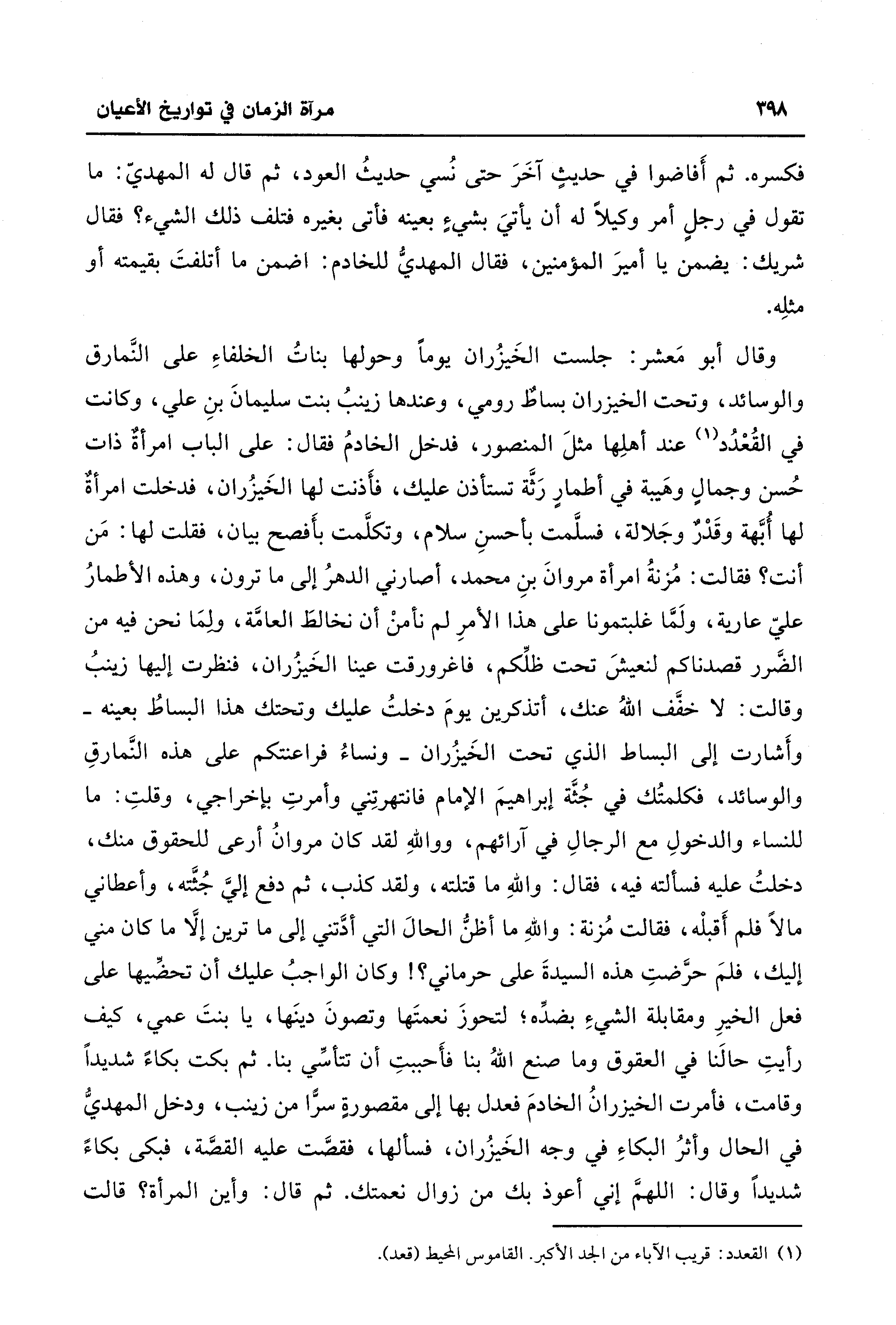 وقال أبو مَعشر: جلست الخَيزُران يومًا وحولها بناتُ الخلفاءِ على النَّمارق والوسائد، وتحت الخيزران بساطٌ رومي، وعندها زينبُ بنت سليمانَ بنِ علي، وكانت في القُعْدُد (¬1) عند أهلِها مثلَ المنصور، فدخل الخادمُ فقال: على الباب امرأةٌ ذات حُسن وجمالٍ وهَيبة في أطمارٍ رَثَّة تستأذن عليك، فأَذنت لها الخَيزُران، فدخلت امرأةٌ لها أُبَّهة وقَدْرٌ وجَلالة، فسلَّمت بأحسنِ سلام، وتكلَّمت بأَفصح بيان، فقلت لها: مَن أَنْتَ؟ فقالت: مُزنةُ امرأة مروانَ بنِ محمَّد، أصارني الدهرُ إلى ما ترون، وهذه الأطمارُ عليّ عارية، ولَمَّا غلبتمونا على هذا الأمرِ لم نأمنْ أن نخالطَ العامَّة، ولمَا نحن فيه من الضَّرر قصدناكم لنعيشَ تحت ظلِّكم، فاغرورقت عينا الخَيزُران، فنظرت إليها زينبُ وقالت: لا خفَّف اللهُ عنك، أتذكرين يومَ دخلتُ عليك وتحتك هذا البساطُ بعينه -وأَشارت إلى البساط الذي تحت الخَيزُران- ونساءُ فراعنتكم على هذه النَّمارقِ والوسائد، فكلمتُك في جُثَّة إبراهيمَ الإِمام فانتهرتِني وأمرتِ بإخراجي، وقلتِ؟ ما للنساء والدخولِ مع الرجالِ في آرائهم، وواللهِ لقد كان مروانُ أرعى للحقوق منك، دخلتُ عليه فسألته فيه، فقال: واللهِ ما قتلته، ولقد كذب، ثم دفع إليَّ جُثَّته، وأعطاني مالًا فلم أَقبلْه، فقالت مُزنة: واللهِ ما أظنُّ الحال التي أدَّتني إلى ما ترين إلَّا ما كان مني إليك، فلمَ حرَّضتِ هذه السيدةَ على حرماني؟ ! وكان الواجبُ عليك أن تحضِّيها على فعل الخيرِ ومقابلة الشيءِ بضدِّه؛ لتحوزَ نعمتَها وتصونَ دينَها، يا بنتَ عمي، كيف رأيتِ حالنا في العقوق وما صنع اللهُ بنا فأَحببتِ أن تتأسِّي بنا. ثم بكت بكاءً شديدًا وقامت، فأمرت الخيزرانُ الخادمَ فعدل بها إلى مقصورةٍ سرًّا من زينب، ودخل المهديُّ في الحال وأثرُ البكاءِ في وجه الخَيزُران، فسألها, فقصَّت عليه القصَّة، فبكى بكاءً شديدًا وقال: اللهم إنِّي أعوذ بك من زوال نعمتك. ثم قال: وأين المرأة؟ قالت