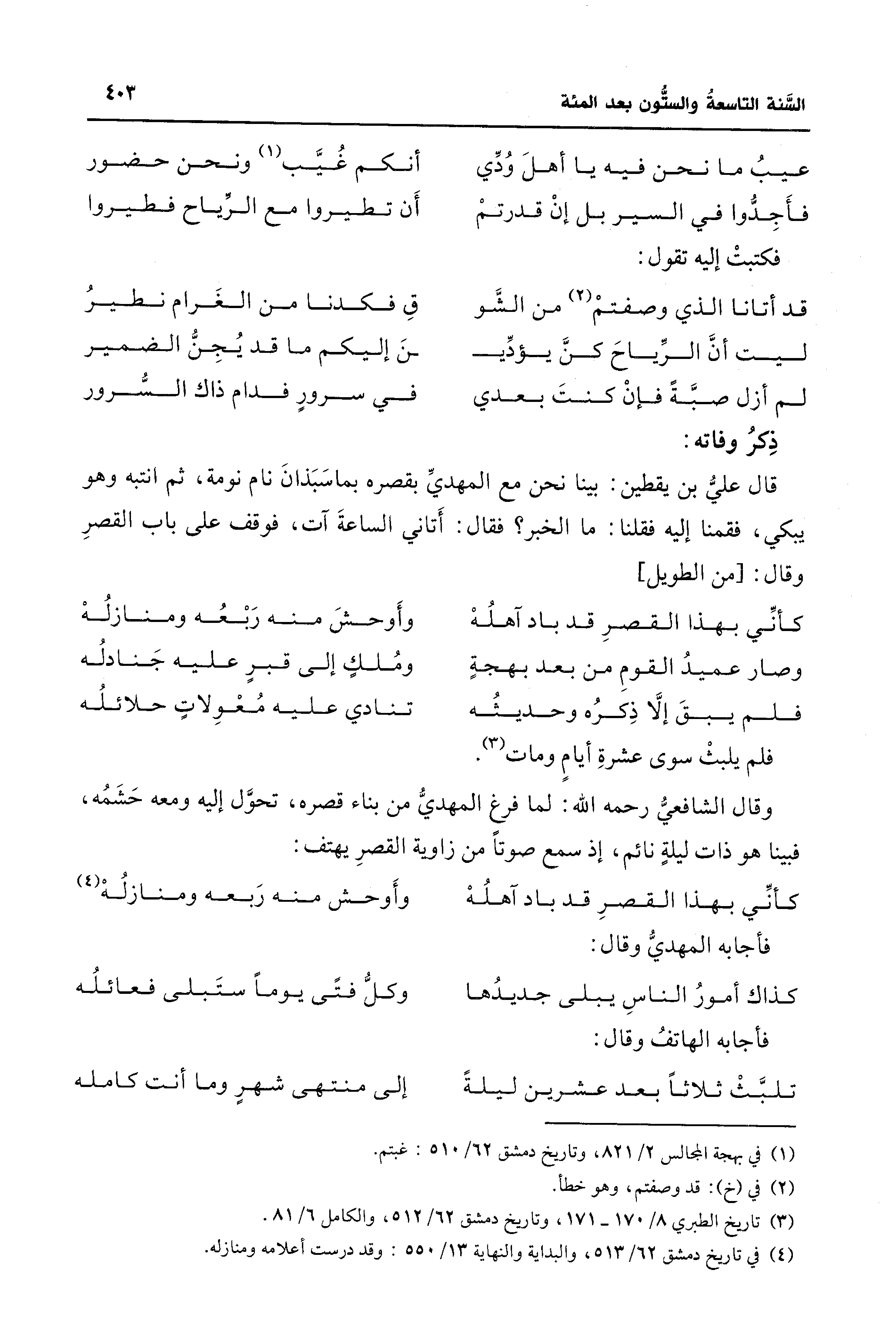وقال الشافعيُّ رحمه الله: لما فرغ المهديُّ من بناء قصره، تحوَّل إليه ومعه حَشَمُه، فبينا هو ذات ليلةٍ نائم، إذ سمع صوتًا من زاوية القصرِ يهتف: