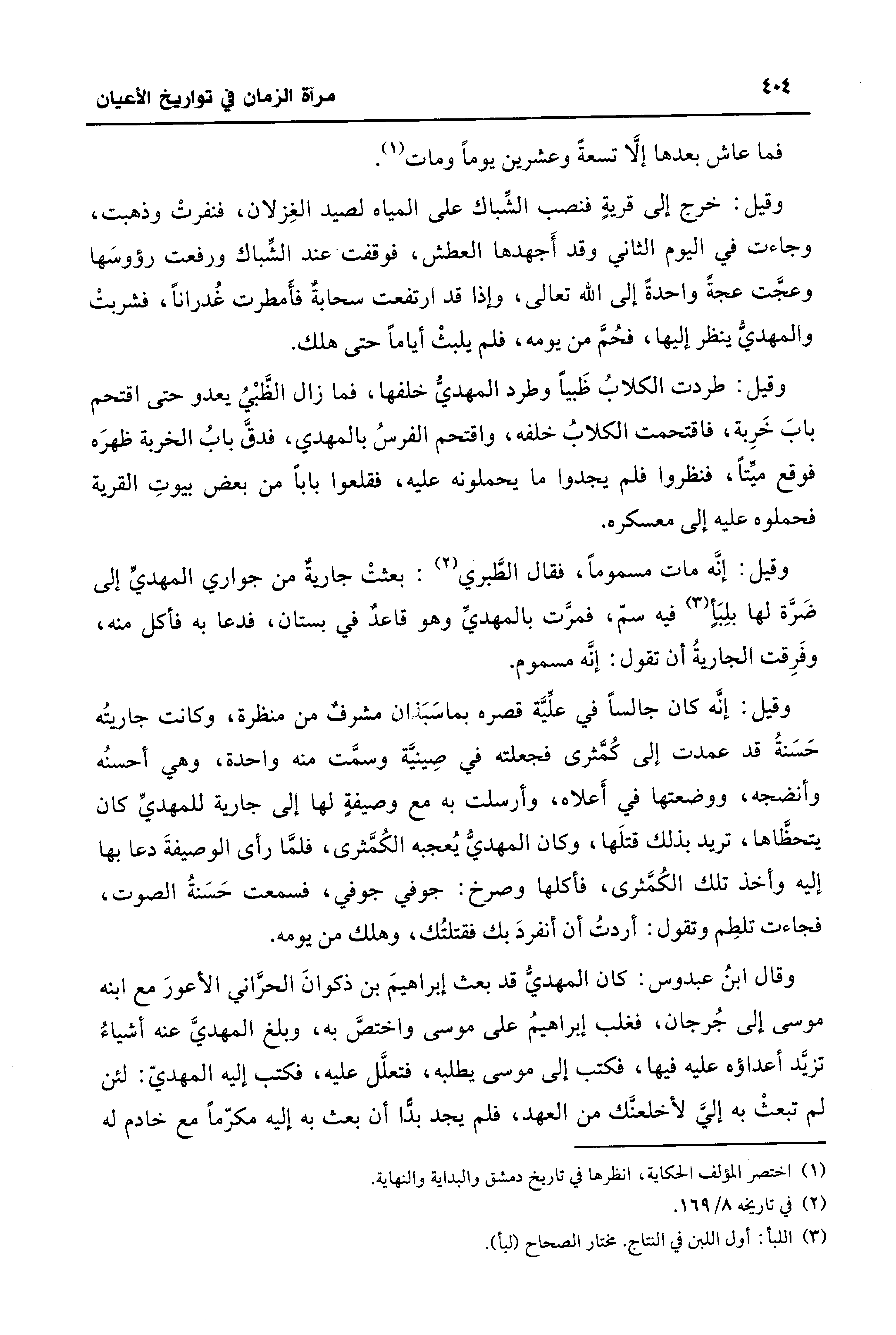 وقيل: إنَّه مات مسمومًا، فقال الطَّبري (¬2): بعثتْ جاريةٌ من جواري المهديِّ إلى ضَرَّة لها بلِبَأٍ (¬3) فيه سمّ، فمرَّت بالمهديِّ وهو قاعدٌ في بستان، فدعا به فأكل منه، وفَرِقت الجاريةُ أن تقول: إنَّه مسموم.
