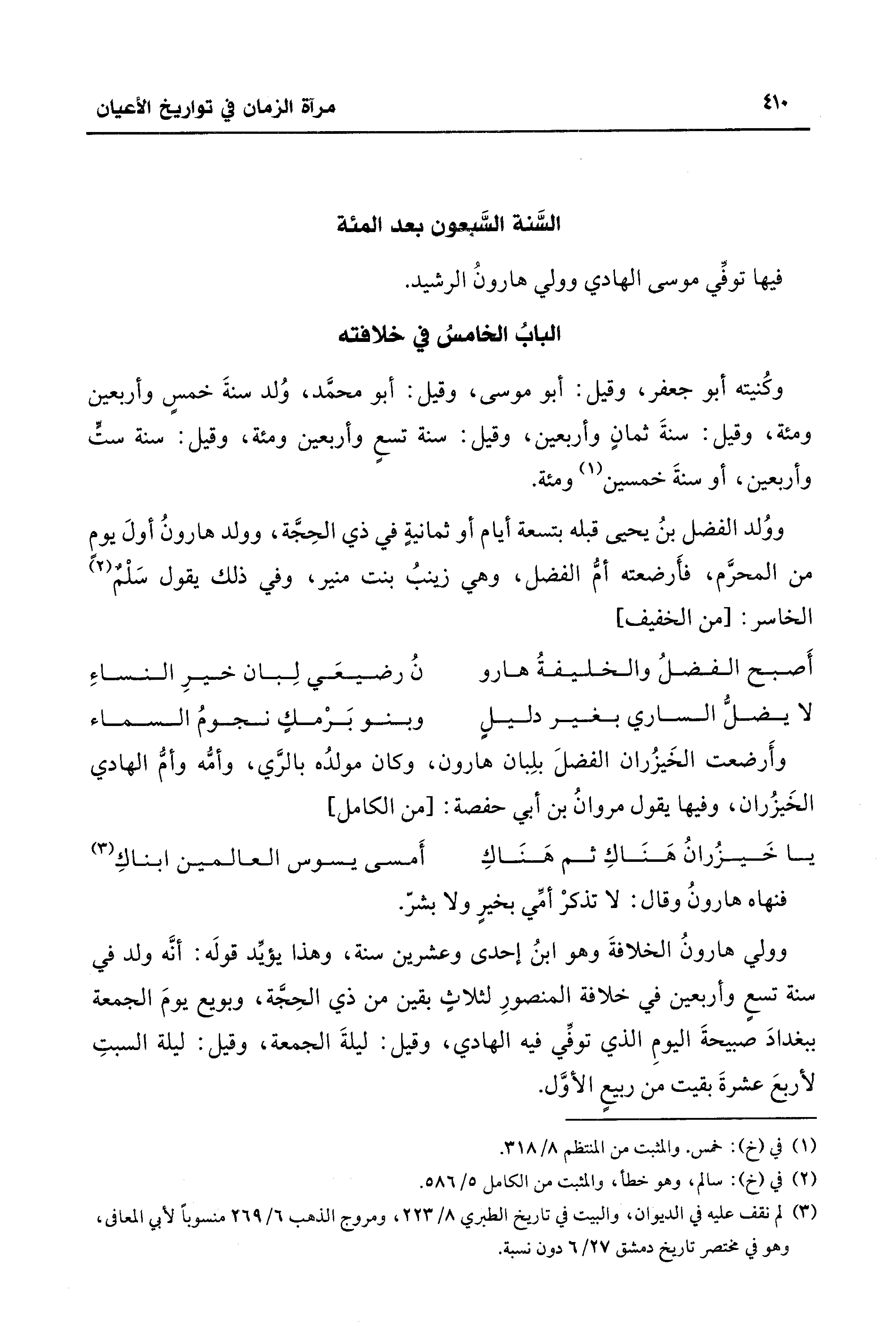 ووُلد الفضل بنُ يحيى قبله بتسعة أيام أو ثمانيةٍ في ذي الحِجَّة، وولد هارونُ أولَ يوم من المحرَّم، فأَرضعته أمُّ الفضل، وهي زينبُ بنت منير، وفي ذلك يقول سَلْمٌ (¬2) الخاسر: [من الخفيف]