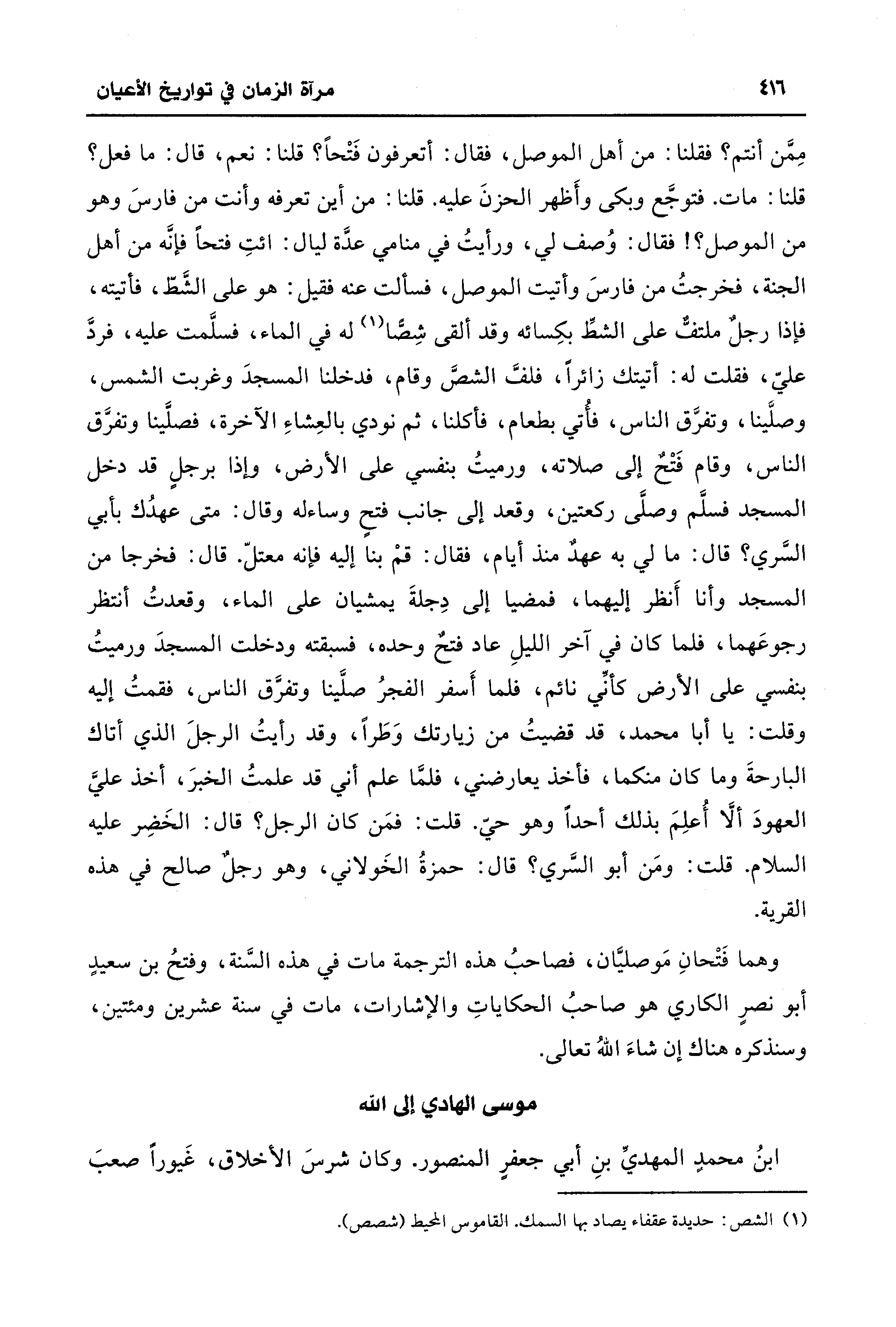 من أنتم؟ فقلنا: من أهل الموصل، فقال: أتعرفون فَتْحًا؟ قلنا: نعم، قال: ما فعل؟ قلنا: مات. فتوجَّع وبكى وأَظهر الحزنَ عليه. قلنا: من أين تعرفه وأنت من فارسَ وهو من الموصل؟ ! فقال: وُصف لي، ورأيتُ في منامي عدَّة ليال: ائتِ فتحًا فإنَّه من أهل الجنة، فخرجتُ من فارسَ وأتيت الموصل، فسألت عنه فقيل: هو على الشَّطّ، فأتيته، فإذا رجلٌ ملتفٌّ على الشطِّ بكِسائه وقد ألقى شِصًّا (¬1) له في الماء، فسلَّمت عليه، فردَّ عليّ، فقلت له: أتيتك زائرًا، فلفَّ الشصَّ وقام، فدخلنا المسجدَ وغربت الشمس، وصلَّينا، وتفرَّق الناس، فأُتي بطعام، فأكلنا، ثم نودي بالعِشاءِ الآخرة، فصلَّينا وتفرَّق الناس، وقام فَتْحٌ إلى صلاته، ورميتُ بنفسي على الأرض، وإذا برجلٍ قد دخل المسجد فسلَّم وصلَّى ركعتين، وقعد إلى جانب فتحٍ وساءله وقال: متى عهدُك بأبي السَّري؟ قال: ما لي به عهدٌ منذ أيام، فقال: قمْ بنا إليه فإنه معتلّ. قال: فخرجا من المسجد وأنا أَنظر إليهما، فمضيا إلى دِجلةَ يمشيان على الماء، وقعدتُ أنتظر رجوعَهما، فلما كان في آخر الليلِ عاد فتحٌ وحده، فسبقته ودخلت المسجدَ ورميتُ بنفسي على الأرض كأنِّي نائم، فلما أَسفر الفجرُ صلَّينا وتفرَّق الناس، فقمتُ إليه وقلت: يا أبا محمد، قد قضيتُ من زيارتك وَطَرًا، وقد رأيتُ الرجلَ الذي أتاك البارحةَ وما كان منكما، فأخذ يعارضني، فلمَّا علم أني قد علمتُ الخبرَ، أخذ عليَّ العهودَ ألا أُعلِمَ بذلك أحدًا وهو حيّ. قلت: فمَن كان الرجل؟ قال: الخَضِر عليه السلام. قلت: ومَن أبو السَّري؟ قال: حمزةُ الخَولاني، وهو رجلٌ صالح في هذه القرية.
