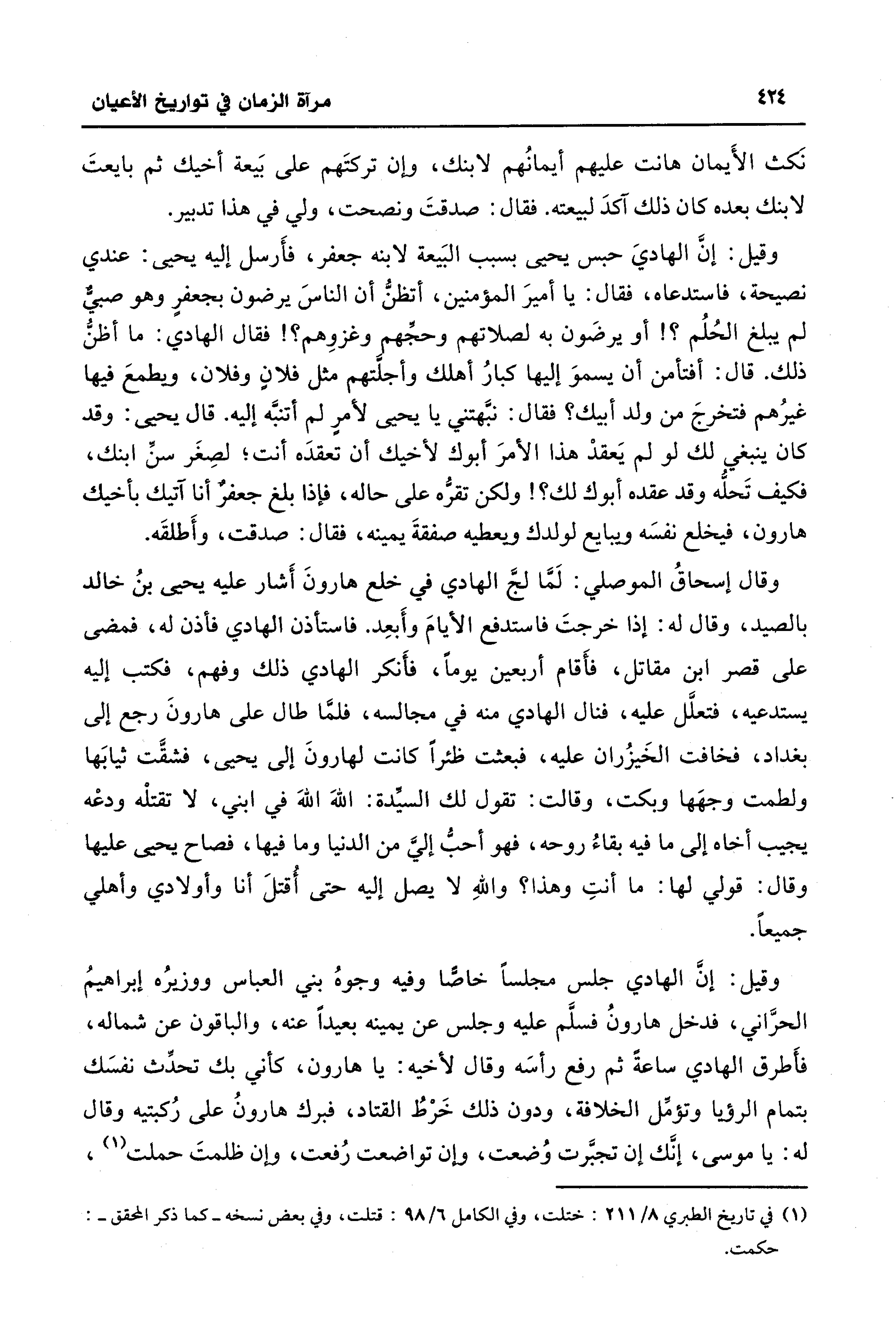 وقال إسحاقُ الموصلي: لَمَّا لجَّ الهادي في خلع هارونَ أَشار عليه يحيى بنُ خالد بالصيد، وقال له: إذا خرجتَ فاستدفع الأيامَ وأَبعِد. فاستأذن الهادي فأذن له، فمضى على قصر ابن مقاتل، فأَقام أربعين يومًا، فأَنكر الهادي ذلك وفهم، فكتب إليه يستدعيه، فتعلَّل عليه، فنال الهادي منه في مجالسه، فلمَّا طال على هارونَ رجع إلى بغداد، فخافت الخَيزُران عليه، فبعثت ظئرًا كانت لهارونَ إلى يحيى، فشقَّت ثيابَها ولطمت وجهَها وبكت، وقالت: تقول لك السيِّدة: اللهَ اللهَ في ابني، لا تقتلْه ودعْه يجيب أخاه إلى ما فيه بقاءُ روحه، فهو أحبُّ إليَّ من الدنيا وما فيها، فصاح يحيى عليها وقال: قولي لها: ما أنتِ وهذا؟ واللهِ لا يصل إليه حتى أُقتلَ أنا وأولادي وأهلي جميعًا.