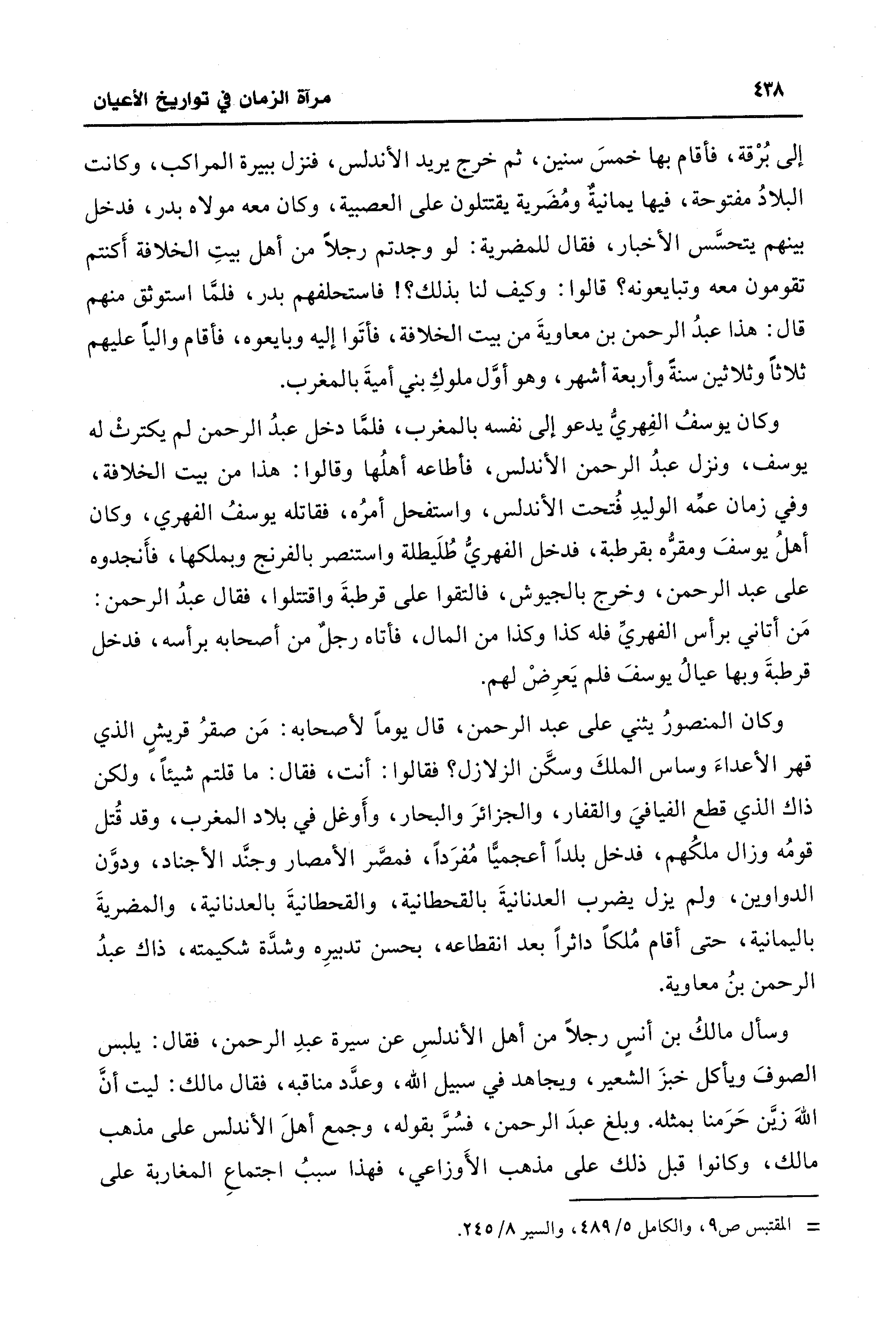 إلى بُرْقة، فأقام بها خمسَ سنين، ثم خرج يريد الأندلس، فنزل ببيرة المراكب، وكانت البلادُ مفتوحة، فيها يمانيةٌ ومُضَرية يقتتلون على العصبية، وكان معه مولاه بدر، فدخل بينهم يتحسَّس الأخبار، فقال للمضرية: لو وجدتم رجلًا من أهل بيتِ الخلافة أَكنتم تقومون معه وتبايعونه؟ قالوا: وكيف لنا بذلك؟ ! فاستحلفهم بدر، فلمَّا استوثق منهم قال: هذا عبدُ الرحمن بن معاويةَ من بيت الخلافة، فأتَوا إليه وبايعوه، فأقام واليًا عليهم ثلاثًا وثلاثين سنةً وأربعة أشهر، وهو أوَّل ملوكِ بني أميةَ بالمغرب.