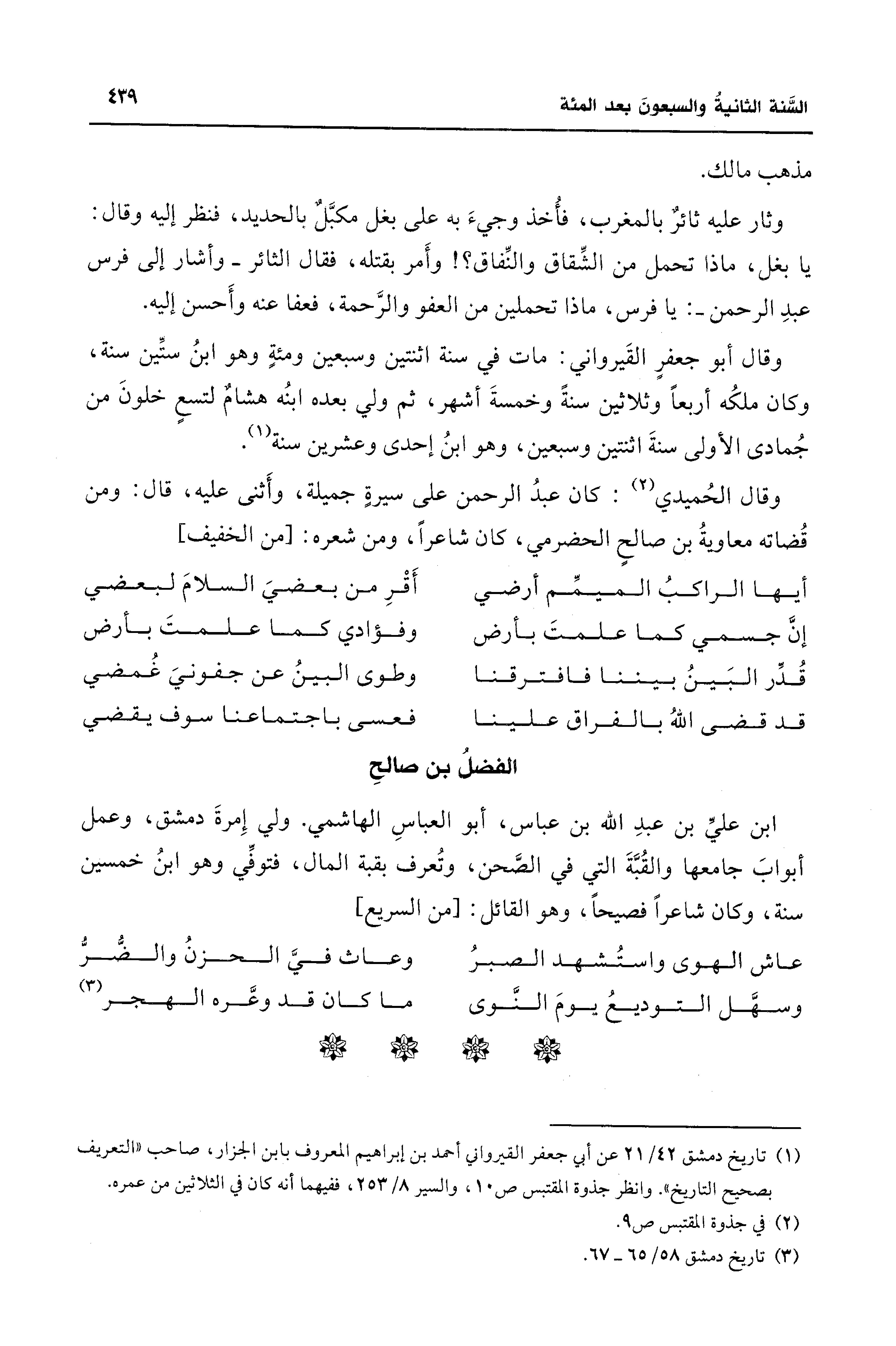 (¬1) تاريخ دمشق 42/ 21 عن أبي جعفر القيرواني أحمد بن إبراهيم المعروف بابن الجزار، صاحب "التعريف بصحيح التاريخ". وانظر جذوة المقتبس ص 10، والسير 8/ 253، ففيهما أنه كان في الثلاثين من عمره.