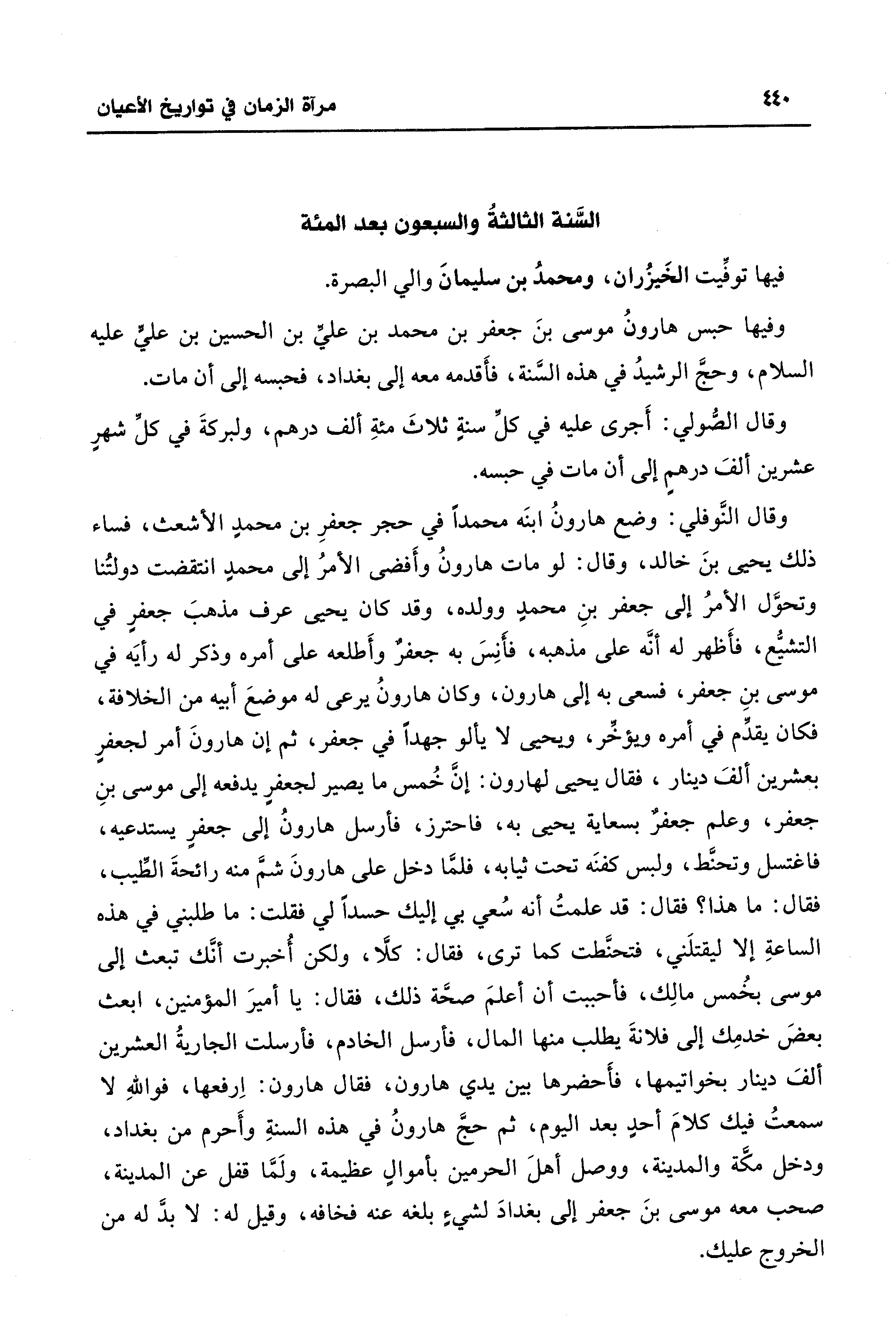 وفيها حبس هارونُ موسى بنَ جعفر بن محمد بن عليِّ بن الحسين بن عليٍّ عليه السلام، وحجَّ الرشيدُ في هذه السَّنة، فأَقدمه معه إلى بغداد، فحبسه إلى أن مات.