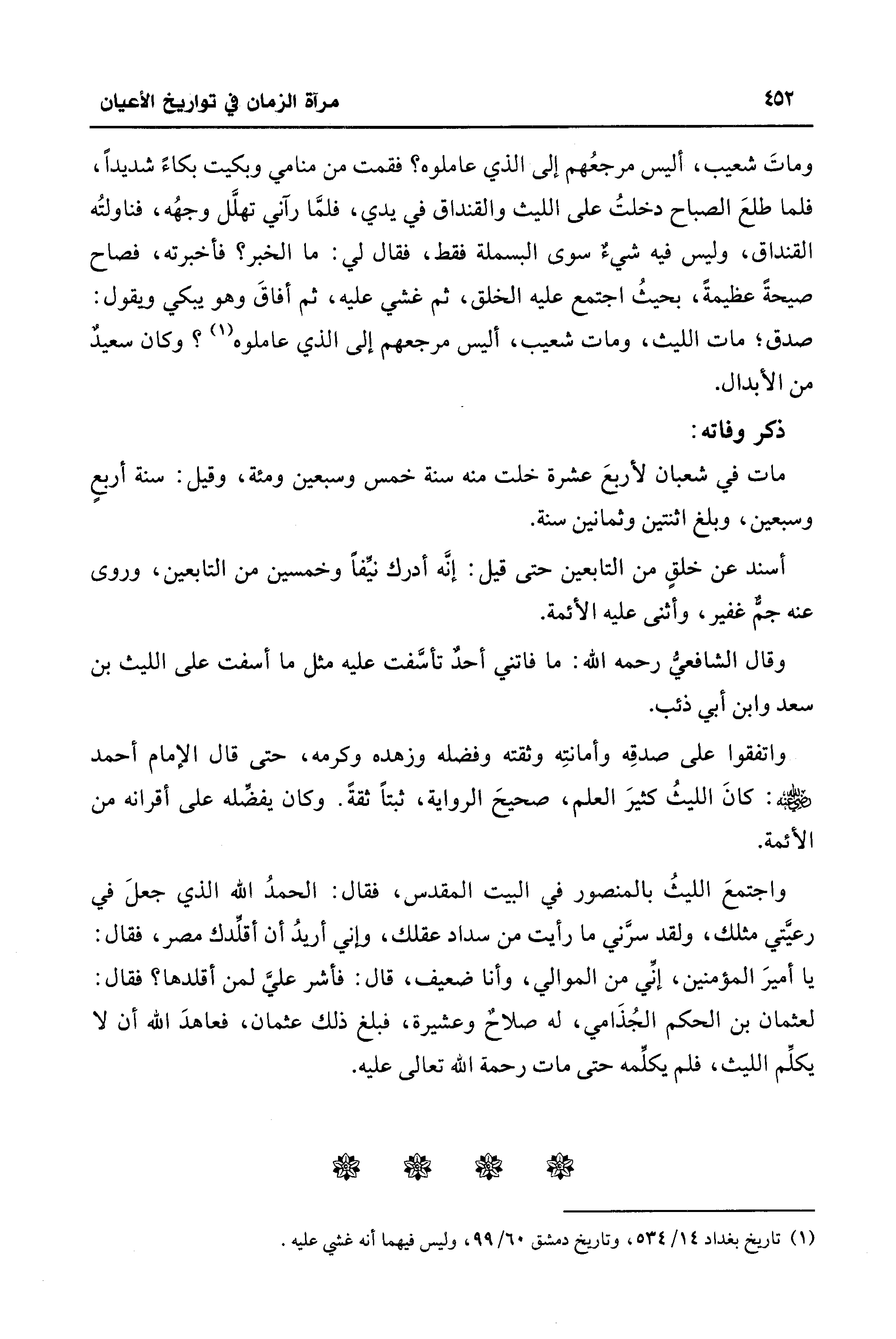 وماتَ شعيب، أليس مرجعُهم إلى الذي عاملوه؟ فقمت من منامي وبكيت بكاءً شديدًا، فلما طلعَ الصباح دخلتُ على الليث والقنداق في يدي، فلمَّا رآني تهلَّل وجهُه، فناولتُه القنداق، وليس فيه شيءٌ سوى البسملة فقط، فقال لي: ما الخبر؟ فأخبرته، فصاح صيحةً عظيمةً، بحيثُ اجتمع عليه الخلق، ثم غشي عليه، ثم أفاقَ وهو يبكي ويقول: صدق؛ مات الليث، ومات شعيب، أليس مرجعهم إلى الذي عاملوه (¬1)؛ وكان سعيدٌ من الأبدال.