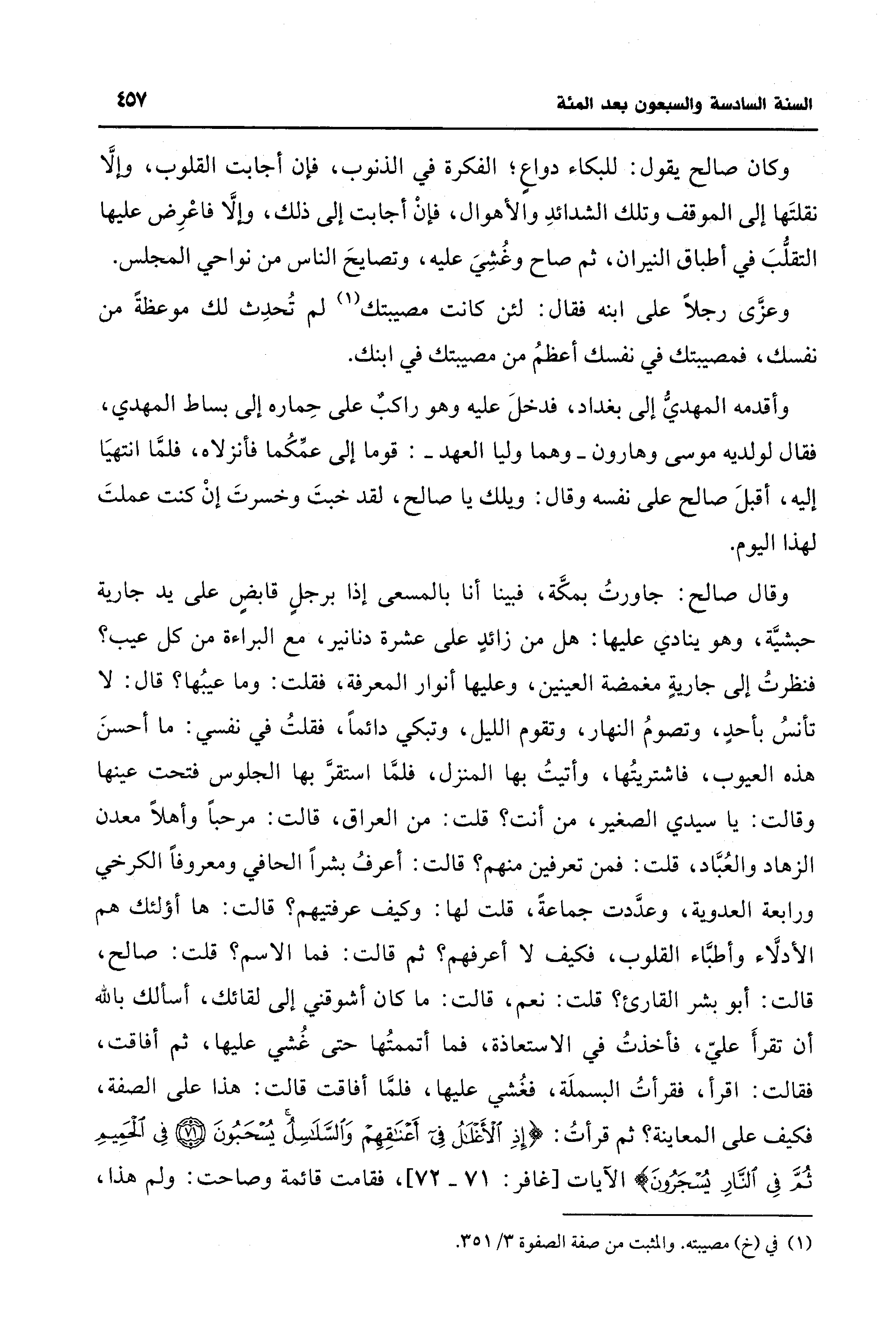 وقال صالح: جاورتُ بمكَّة، فبينا أنا بالمسعى إذا برجلٍ قابضٍ على يد جارية حبشيَّة، وهو ينادي عليها: هل من زائدٍ على عشرة دنانير، مع البراءة من كل عيب؟ فنظرتُ إلى جاريةٍ مغمضة العينين، وعليها أنوار المعرفة، فقلت: وما عيبُها؟ قال: لا تأنسُ بأحدٍ، وتصومُ النهار، وتقوم الليل، وتبكي دائمًا، فقلتُ في نفسي: ما أحسنَ هذه العيوب، فاشتريتُها، وأتيتُ بها المنزل، فلمَّا استقرَّ بها الجلوس فتحت عينها وقالت: يَا سيدي الصغير, من أثبت؟ قلت: من العراق، قالت: مرحبًا وأهلًا معدن الزهاد والعُبَّاد، قلت: فمن تعرفين منهم؟ قالت: أعرفُ بشرًا الحافي ومعروفًا الكرخي ورابعة العدوية، وعدَّدت جماعةً، قلت لها: وكيف عرفتيهم؟ قالت: ها أولئك هم الأدلَّاء وأطبَّاء القلوب، فكيف لا أعرفهم؟ ثم قالت: فما الاسم؟ قلت: صالح، قالت: أبو بشر القارئ؟ قلت: نعم، قالت: ما كان أشوقني إلى لقائك، أسألك بالله أن تقرأَ عليّ، فأخذتُ في الاستعاذة، فما أتممتُها حتَّى غُشي عليها، ثم أفاقت، فقالت: اقرأ، فقرأتُ البسملَة، فغُشي عليها، فلمَّا أفاقت قالت: هذا على الصفة، فكيف على المعاينة؟ ثم قرأتُ: {إِذِ الْأَغْلَالُ فِي أَعْنَاقِهِمْ وَالسَّلَاسِلُ يُسْحَبُونَ (71) فِي الْحَمِيمِ ثُمَّ فِي النَّارِ يُسْجَرُونَ} الآيات [غافر: 71 - 72] فقامت قائمة وصاحت: ولم هذا،