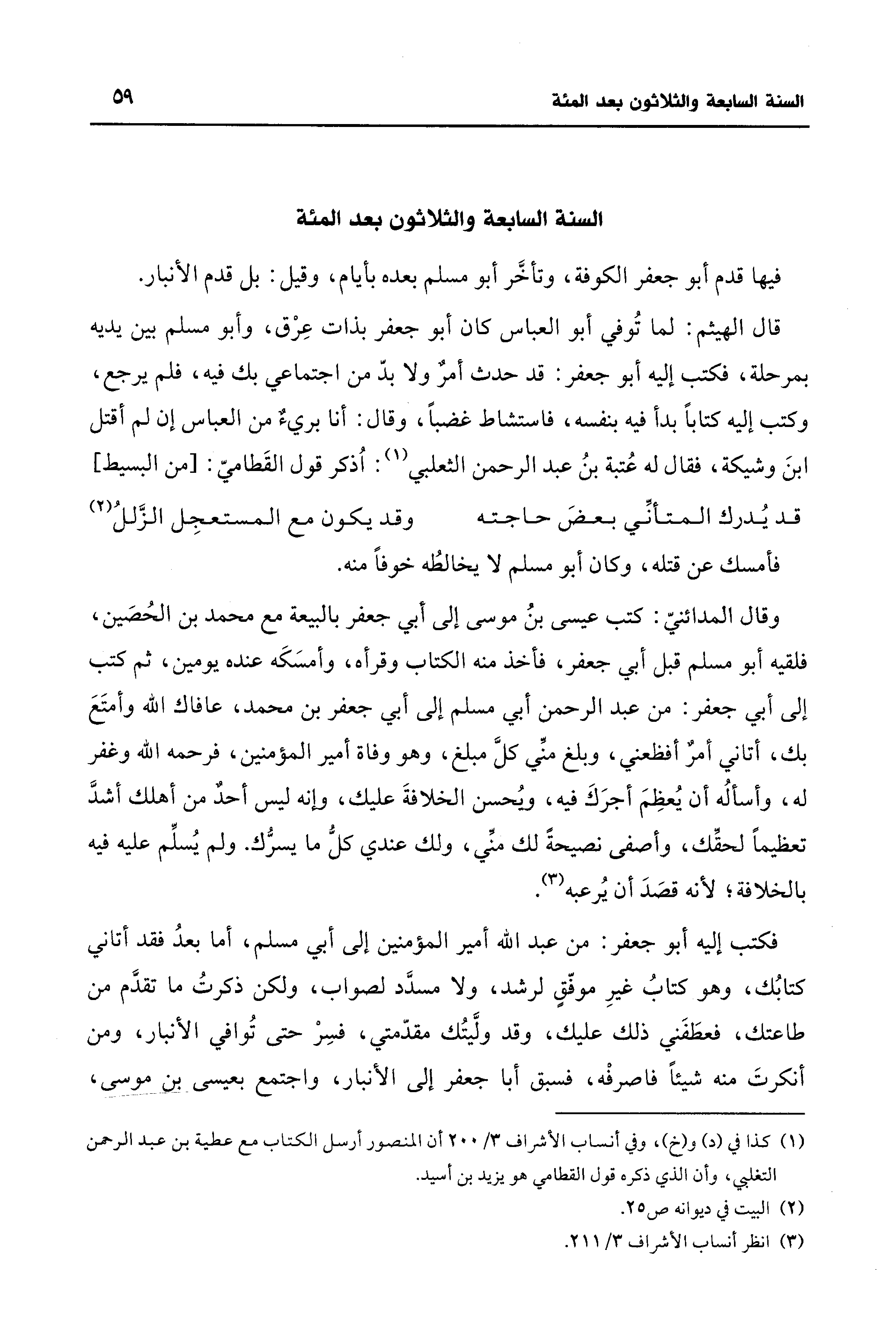 (¬1) كذا في (د) و (خ)، وفي أنساب الأشراف 3/ 200 أن المنصور أرسل الكتاب مع عطية بن عبد الرحمن التغلبي، وأن الذي ذكره قول القطامي هو يزيد بن أسيد.