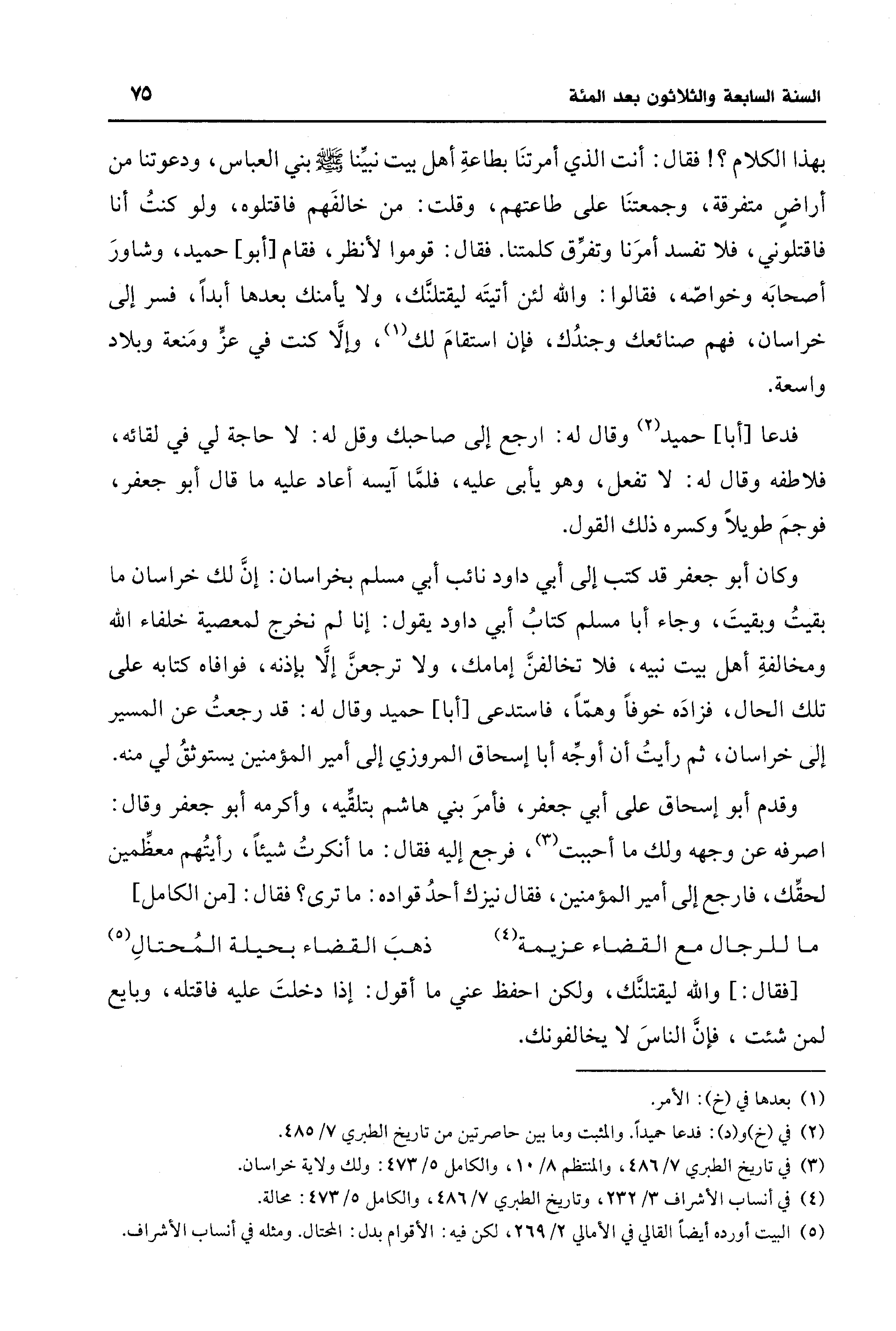 وكان أبو جعفر قد كتب إلى أبي داود نائب أبي مسلم بخراسان: إنَّ لك خراسان ما بقيتُ وبقيتَ، وجاء أبا مسلم كتابُ أبي داود يقول: إنا لم نخرج لمعصية خلفاء الله ومخالفةِ أهل بيت نبيه، فلا تخالفنَّ إمامك، ولا ترجعنَّ إلا بإذنه، فوافاه كتابه على تلك الحال، فزادَه خوفًا وهمًّا، فاستدعى [أبا] حميد وقال له: قد رجعتُ عن المسير إلى خراسان، ثم رأيتُ أن أوجِّه أبا إسحاق المروزي إلى أمير المؤمنين يستوثقُ لي منه.