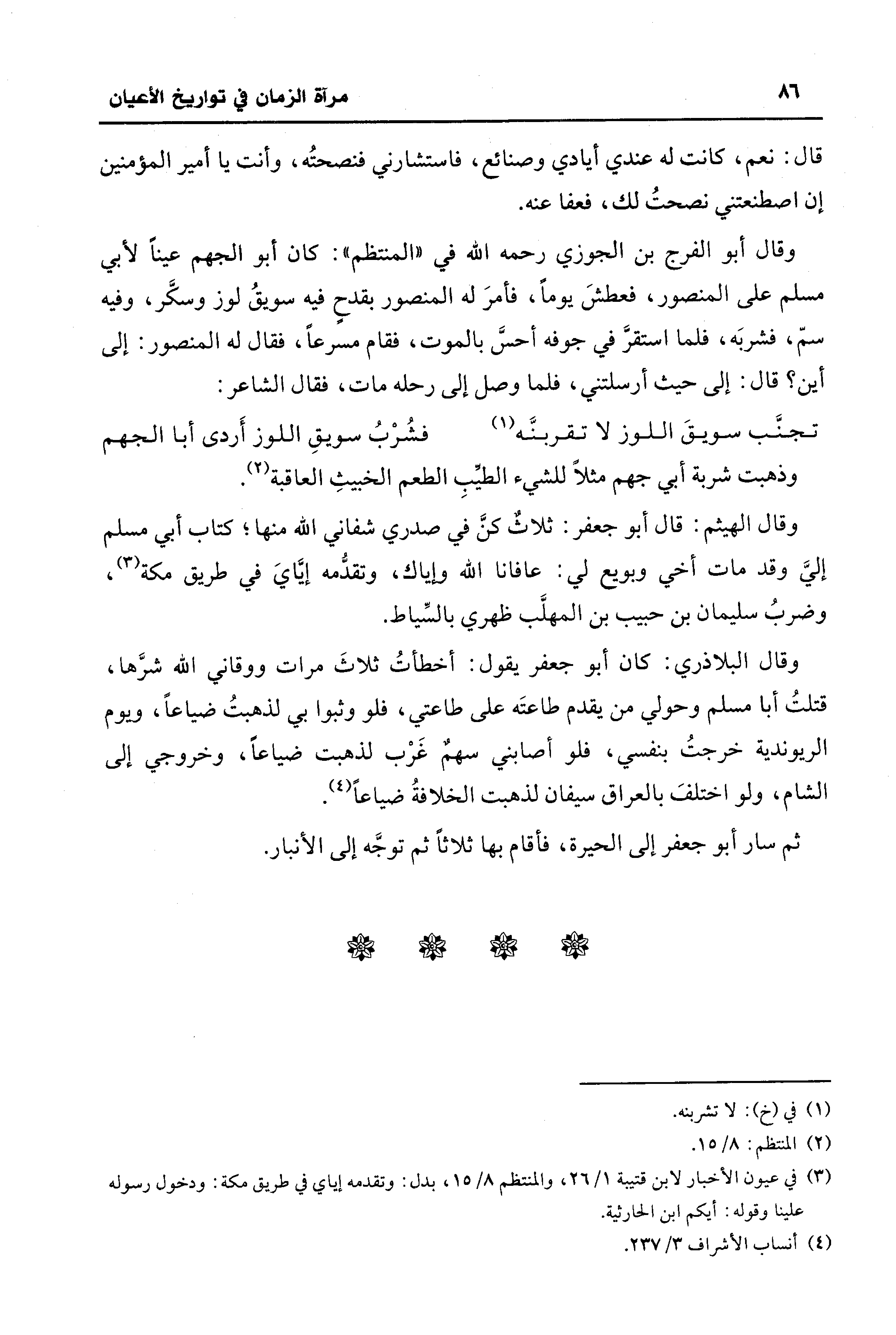 وقال الهيثم: قال أبو جعفر: ثلاثٌ كنَّ في صدري شفاني الله منها؛ كتاب أبي مسلم إليَّ وقد مات أخي وبويع في: عافانا الله وإياك، وتقدُّمه إيايَ في طريق مكة (¬3)، وضربُ سليمان بن حبيب بن المهلَّب ظهري بالسِّياط.