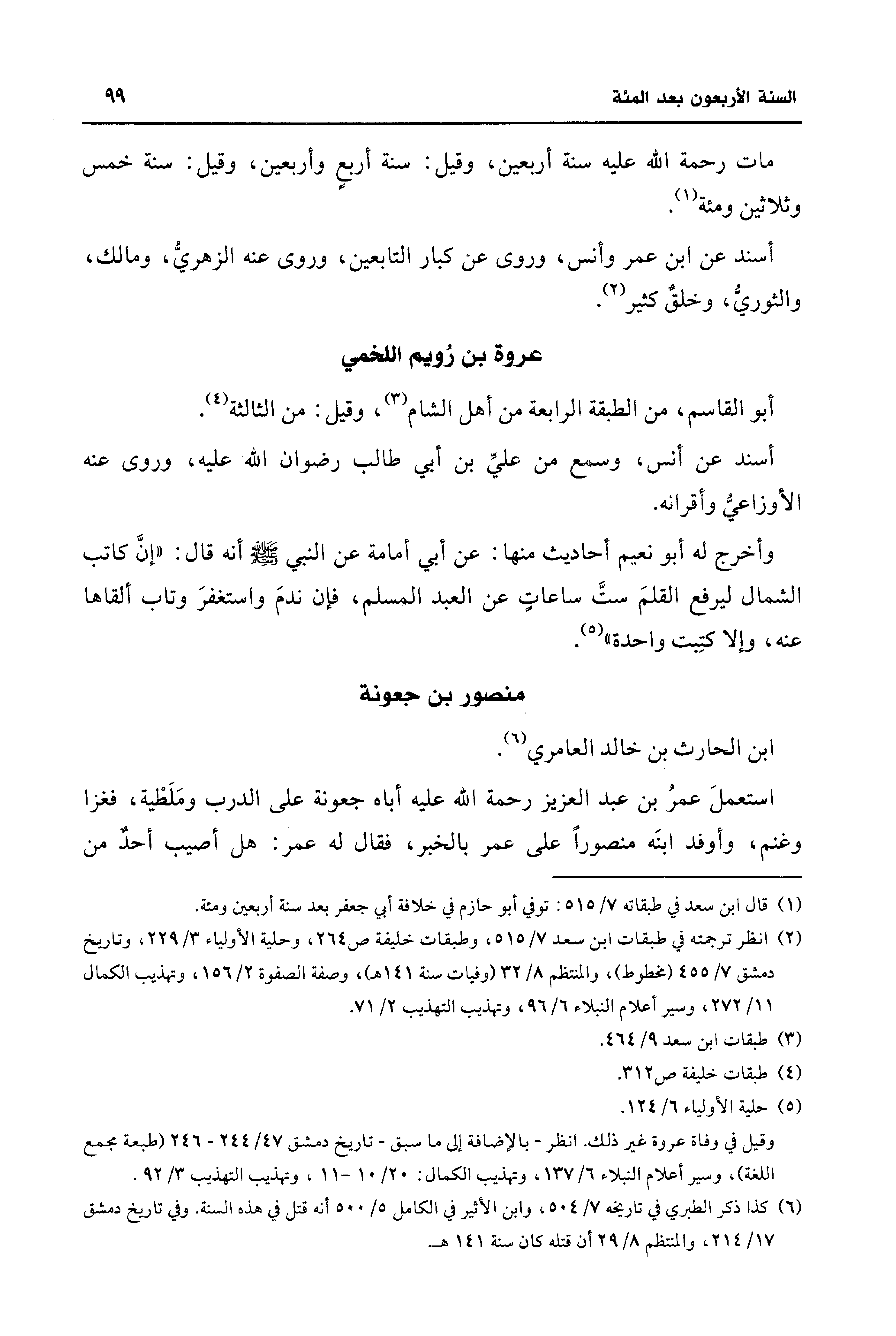 وقيل في وفاة عروة غير ذلك. انظر -بالإضافة إلى ما سبق- تاريخ دمشق 47/ 244 - 246 (طبعة مجمع اللغة)، وسير أعلام النبلاء 6/ 137، وتهذيب الكمال: 20/ 10 - 11، وتهذيب التهذيب 3/ 92.