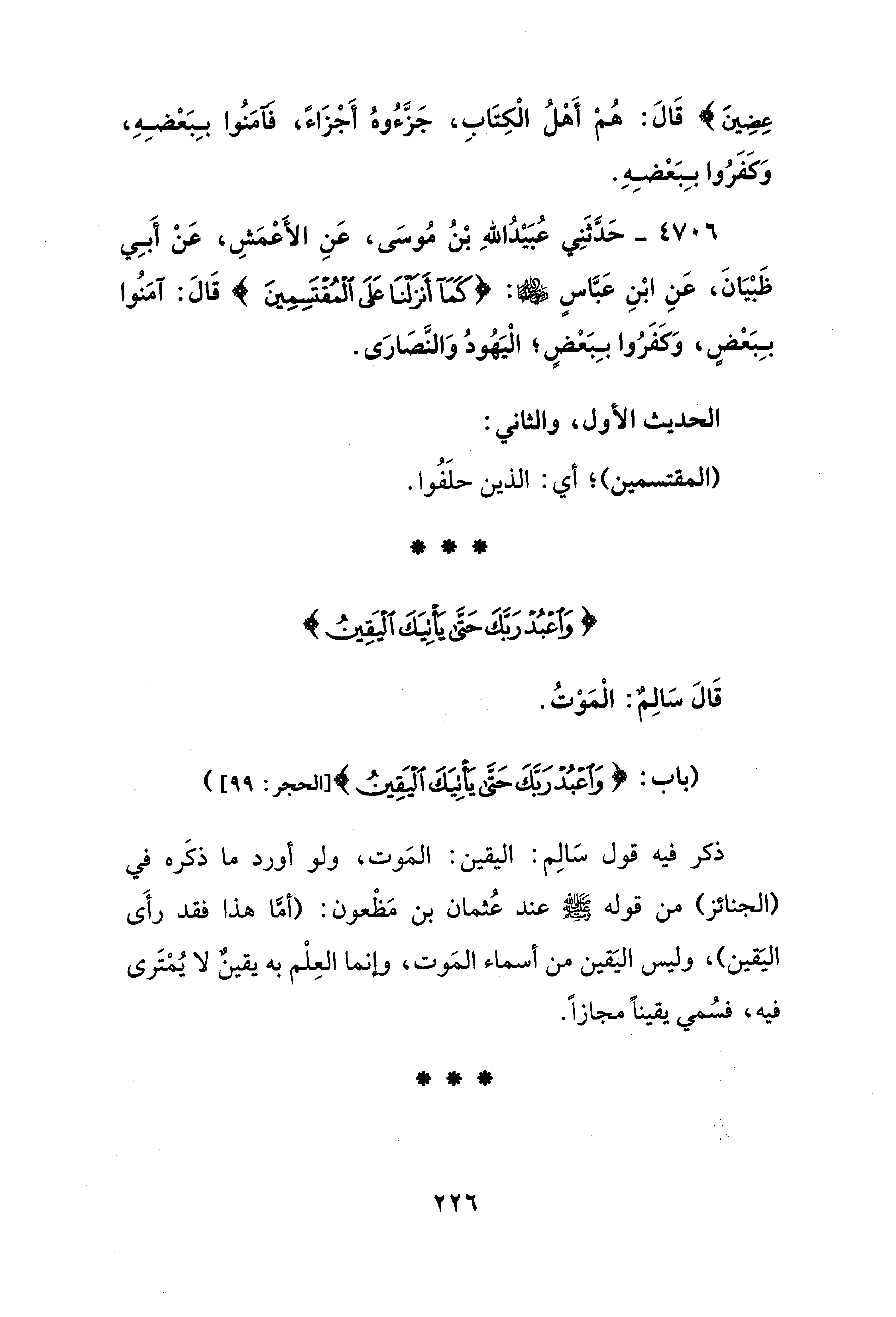 ذكر فيه قول سَالِم: اليقين: المَوت، ولو أورد ما ذكَره في (الجنائز) من قوله - صلى الله عليه وسلم - عند عُثمان بن مَظْعون: (أمَّا هذا فقد رأَى اليَقين)، وليس اليَقين من أسماء المَوت، وإنما العِلْم به يقينٌ لا يمتَرى فيه، فسُمي يقينًا مجازًا.
