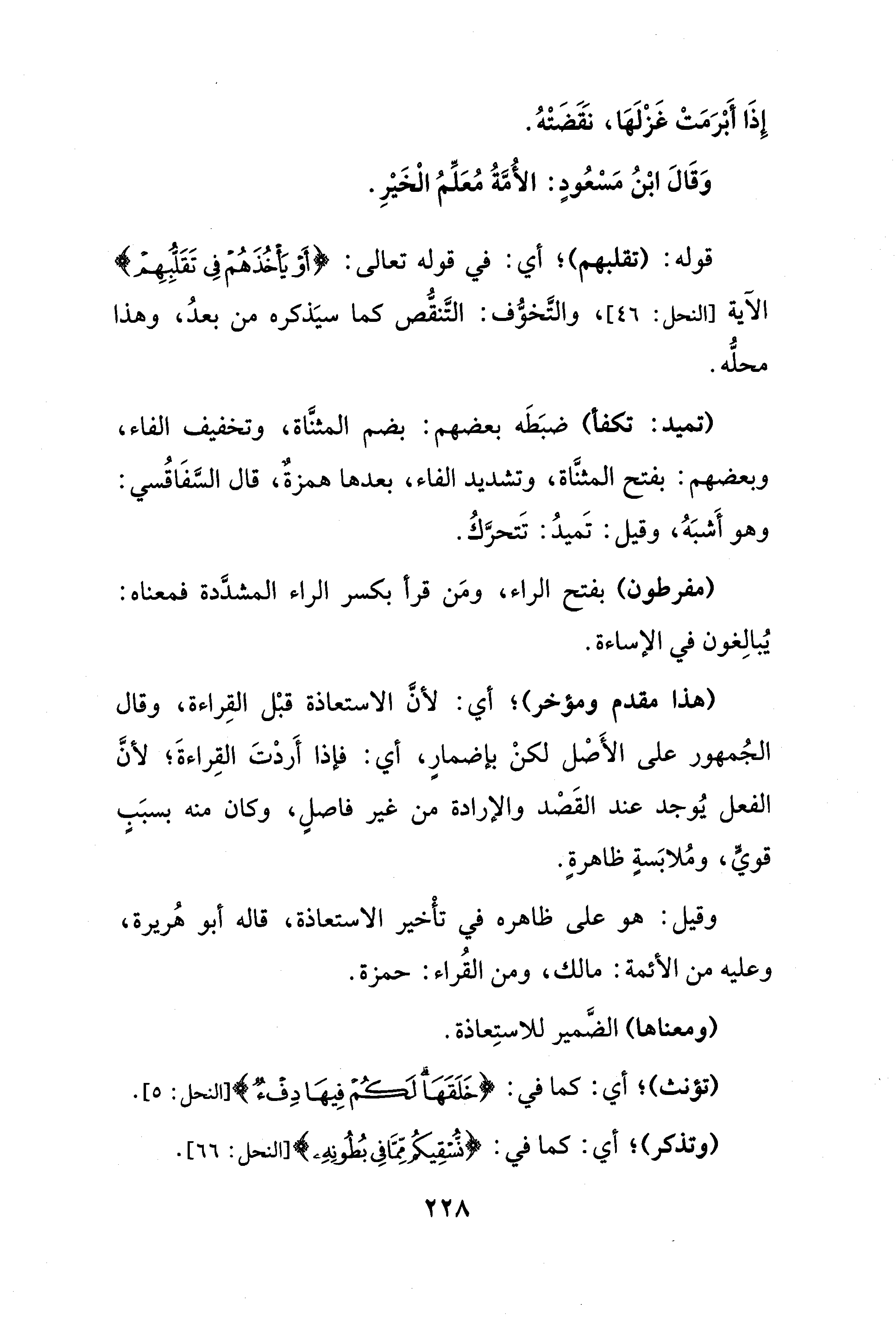 (هذا مقدم ومؤخر)؛ أي: لأنَّ الاستعاذة قبْل القِراءة، وقال الجُمهور على الأَصْل لكنْ بإضمارٍ، أي: فإذا أَردتَ القِراءةَ؛ لأنَّ الفعل يُوجد عند القصْد والإرادة من غير فاصلٍ، وكان منه بسبَبٍ قويٍّ، ومُلابَسةٍ ظاهرة.