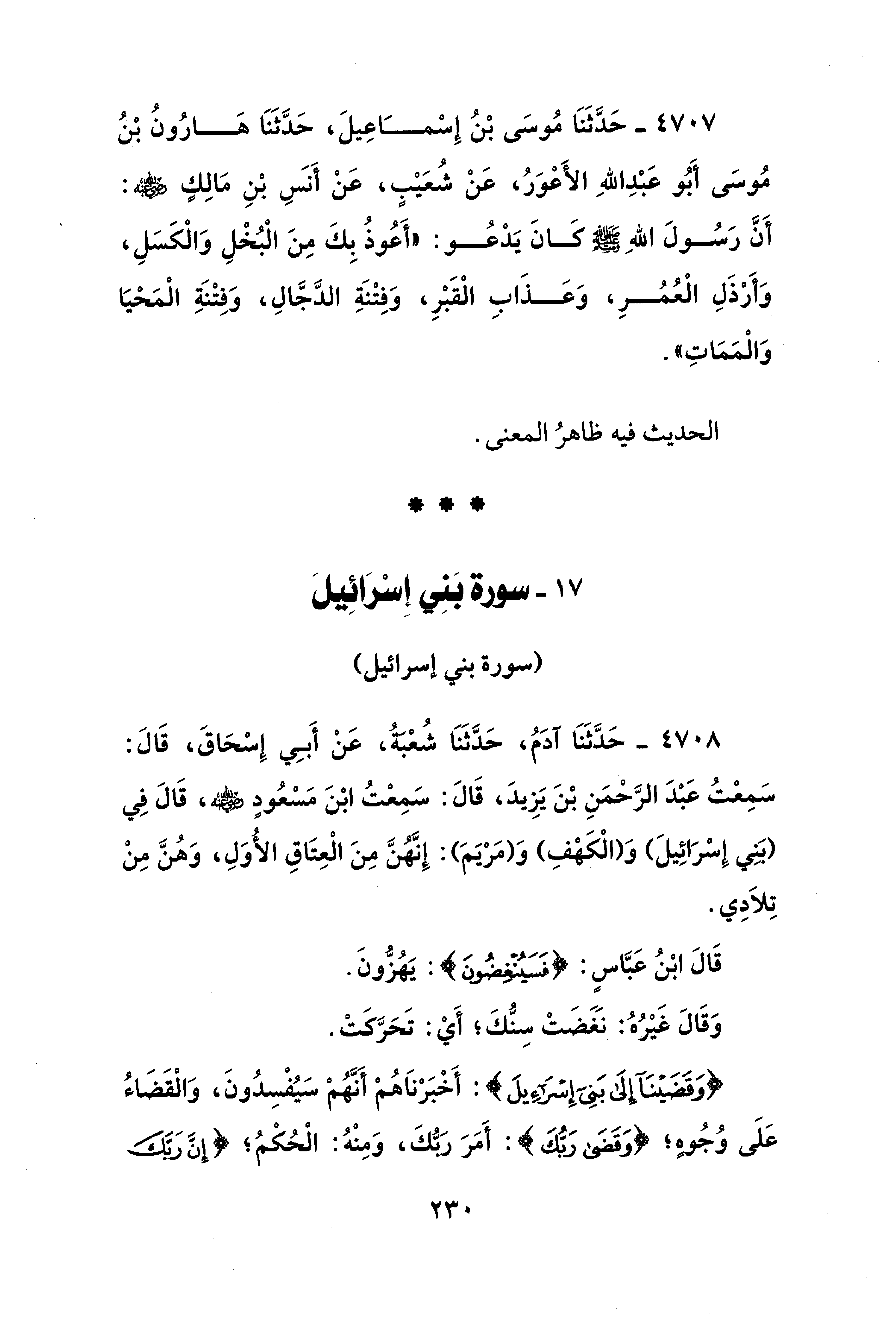 4707 - حَدَّثَنَا مُوسَى بْنُ إِسْمَاعِيلَ، حَدَّثَنَا هارُونُ بْنُ مُوسَى أَبُو عَبْدِ اللهِ الأَعْوَرُ، عَنْ شُعَيْبٍ، عَنْ أَنس بْنِ مَالِكٍ - رضي الله عنه -: أَنَّ رَسُولَ اللهِ - صلى الله عليه وسلم - كانَ يَدعُو: "أَعُوذُ بِكَ مِنَ الْبُخْلِ وَالْكَسَلِ، وَأَرْذَلِ الْعُمُرِ، وَعَذَابِ الْقَبْرِ، وَفِتْنَةِ الدَّجَّالِ، وَفِتْنَةِ الْمَحيَا وَالْمَمَاتِ".