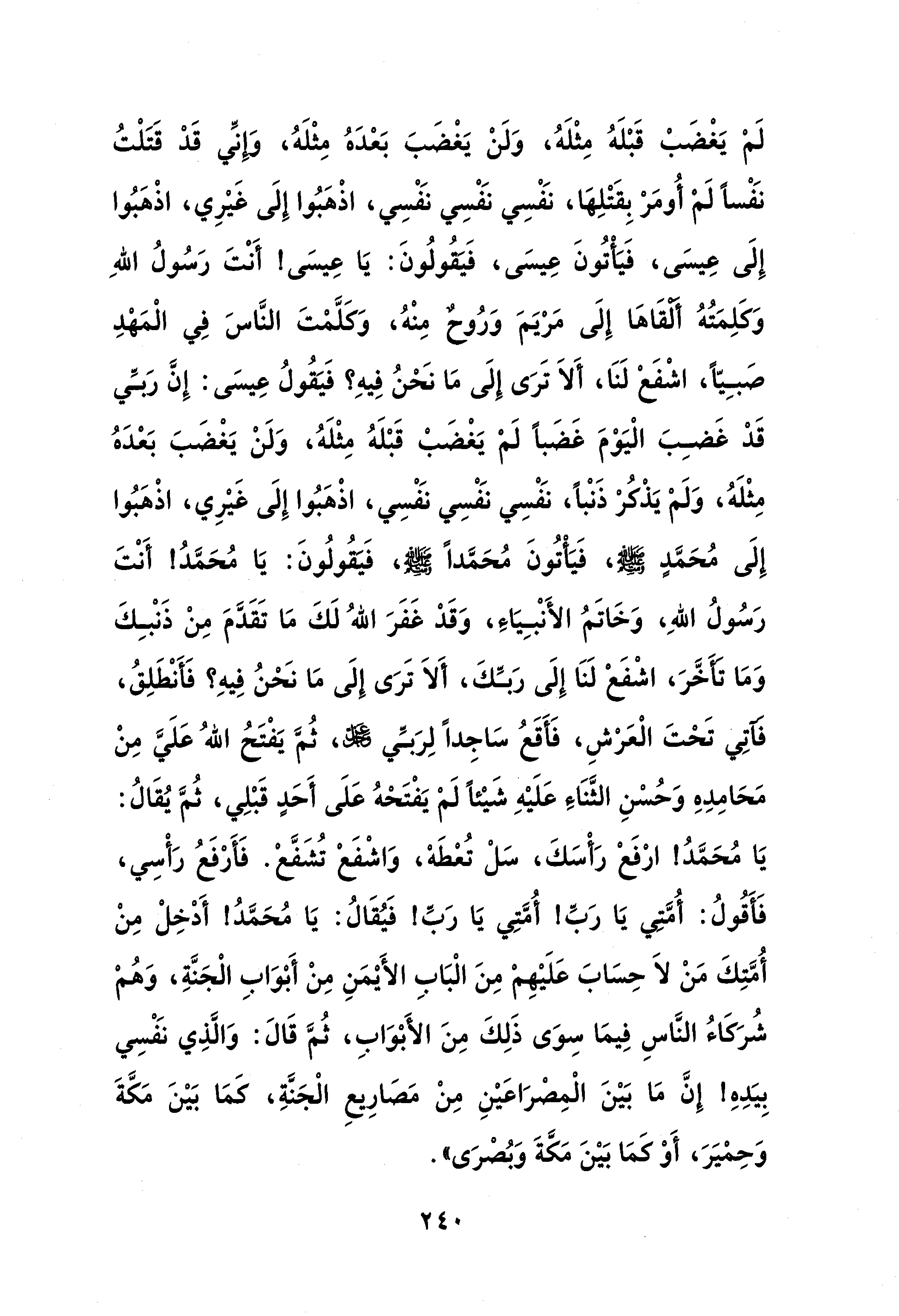 لم يَغْضَبْ قَبْلَهُ مِثْلَهُ، وَلَنْ يَغْضَبَ بَعْدَهُ مِثْلَهُ، وَإِنِّي قَدْ قَتَلْتُ نَفْسًا لَمْ أُومَرْ بِقَتْلِها، نَفْسِي نَفْسِي نَفْسِي، اذْهبُوا إِلَى غَيْرِي، اذْهبُوا إِلَى عِيسَى، فَيَأتُونَ عِيسَى، فَيقُولُونَ: يَا عِيسَى! أَنْتَ رَسُولُ اللهِ وَكَلِمَتُهُ ألقَاها إِلَى مَريَمَ وَرُوحٌ مِنْهُ، وَكَلَّمْتَ النَّاسَ فِي الْمَهْدِ صَبِيًّا، اشْفَغ لَنَا، أَلاَ تَرَى إِلَى مَا نَحْنُ فِيهِ؟ فَيقُولُ عِيسَى: إِنَّ رَبِّي قَدْ غَضِبَ الْيَوْمَ غَضَبًا لَمْ يَغْضَبْ قَبْلَهُ مِثْلَهُ، وَلَنْ يَغْضَبَ بَعْدَهُ مِثْلَهُ، وَلَم يَذْكُر ذَنْبًا، نَفْسِي نَفْسِي نَفْسِي، اذْهبُوا إِلَى غَيْرِي، اذْهبُوا إِلَى مُحَمَّدٍ - صلى الله عليه وسلم -، فَيَأتُونَ مُحَمَّدًا - صلى الله عليه وسلم -، فَيقُولُونَ: يَا مُحَمَّدُ! أَنْتَ رَسُولُ اللهِ، وَخَاتَمُ الأَنْبِيَاءِ، وَقَد غَفَرَ اللهُ لَكَ مَا تَقَدَّمَ مِنْ ذَنْبِكَ وَمَا تأخَّرَ، اشْفَعْ لَنَا إِلَى رَبِّكَ، أَلاَ تَرَى إِلَى مَا نَحْنُ فِيه؟ فَأَنْطَلِقُ، فآتِي تَحتَ الْعَرْشِ، فَأَقَعُ سَاجِدًا لِرَبِّي - عز وجل -، ثُمَّ يَفْتَحُ اللهُ عَلَيَّ مِنْ مَحَامِدِهِ وَحُسْنِ الثَّنَاءِ عَلَيْهِ شَيْئًا لَمْ يَفْتحهُ عَلَى أَحَدٍ قَبْلِي، ثُمَّ يُقَالُ: يَا مُحَمَّدُ! ارْفعْ رَأْسَكَ، سَلْ تُعْطَهْ، وَاشْفَع تُشَفَّعْ. فَأرْفَعُ رَأْسِي، فَأَقُولُ: أُمَّتِي يَا رَبِّ! أُمَّتِي يَا رَبِّ! فَيُقَالُ: يَا مُحَمَّدُ! أَدخِلْ مِنْ أمُّتِكَ مَنْ لاَ حِسَابَ عَلَيْهمْ مِنَ الْبَابِ الأَيْمَنِ مِنْ أَبْوَابِ الْجَنَّةِ، وَهُمْ شُرَكَاءُ النَّاسِ فِيمَا سِوَى ذَلِكَ مِنَ الأَبْوَابِ، ثُمَّ قَالَ: وَالَّذِي نَفْسِي بِيَدِهِ! إِنَّ مَا بَيْنَ الْمِصْرَاعَيْنِ مِنْ مَصَارِيعِ الْجَنَّةِ، كَمَا بَيْنَ مَكَّةَ وَحِمْيَرَ، أَوْ كَمَا بَيْنَ مَكَّةَ وَبُصْرَى".