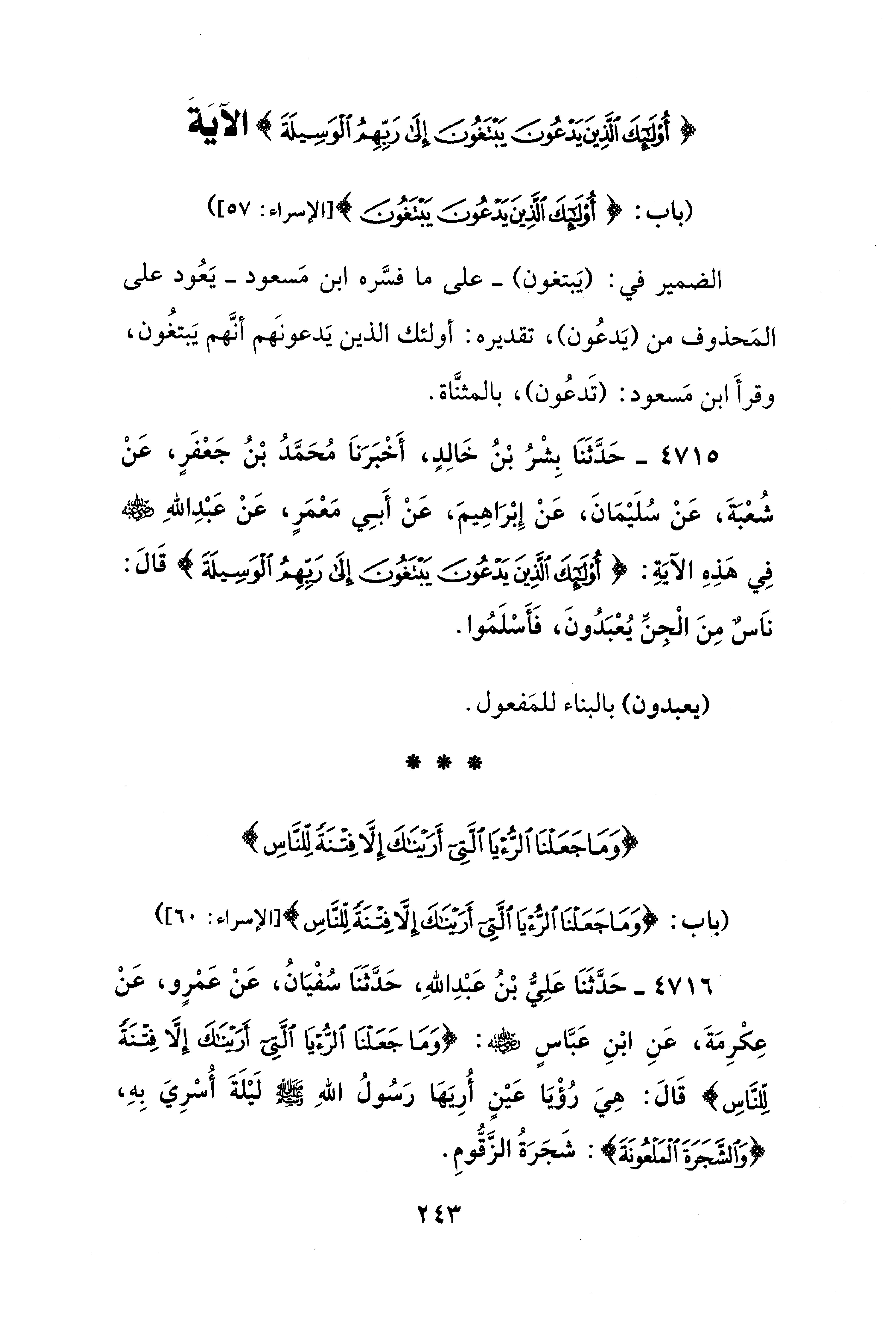 4715 - حَدَّثَنَا بِشْرُ بْنُ خَالِدٍ، أَخْبَرَنَا مُحَمَّدُ بْنُ جَعْفَرٍ، عَنْ شُعْبة، عَنْ سُلَيْمَانَ، عَنْ إِبْرَاهِيمَ، عَنْ أَبِي مَعمَرٍ، عَنْ عَبْدِ اللهِ - رضي الله عنه - فِي هذه الآيَةِ: {أُولَئِكَ الَّذِينَ يَدْعُونَ يَبْتَغُونَ إِلَى رَبِّهِمُ الْوَسِيلَةَ} قَالَ: نَاسٌ مِنَ الْجنِّ يُعْبَدُونَ، فَأَسْلَمُوا.