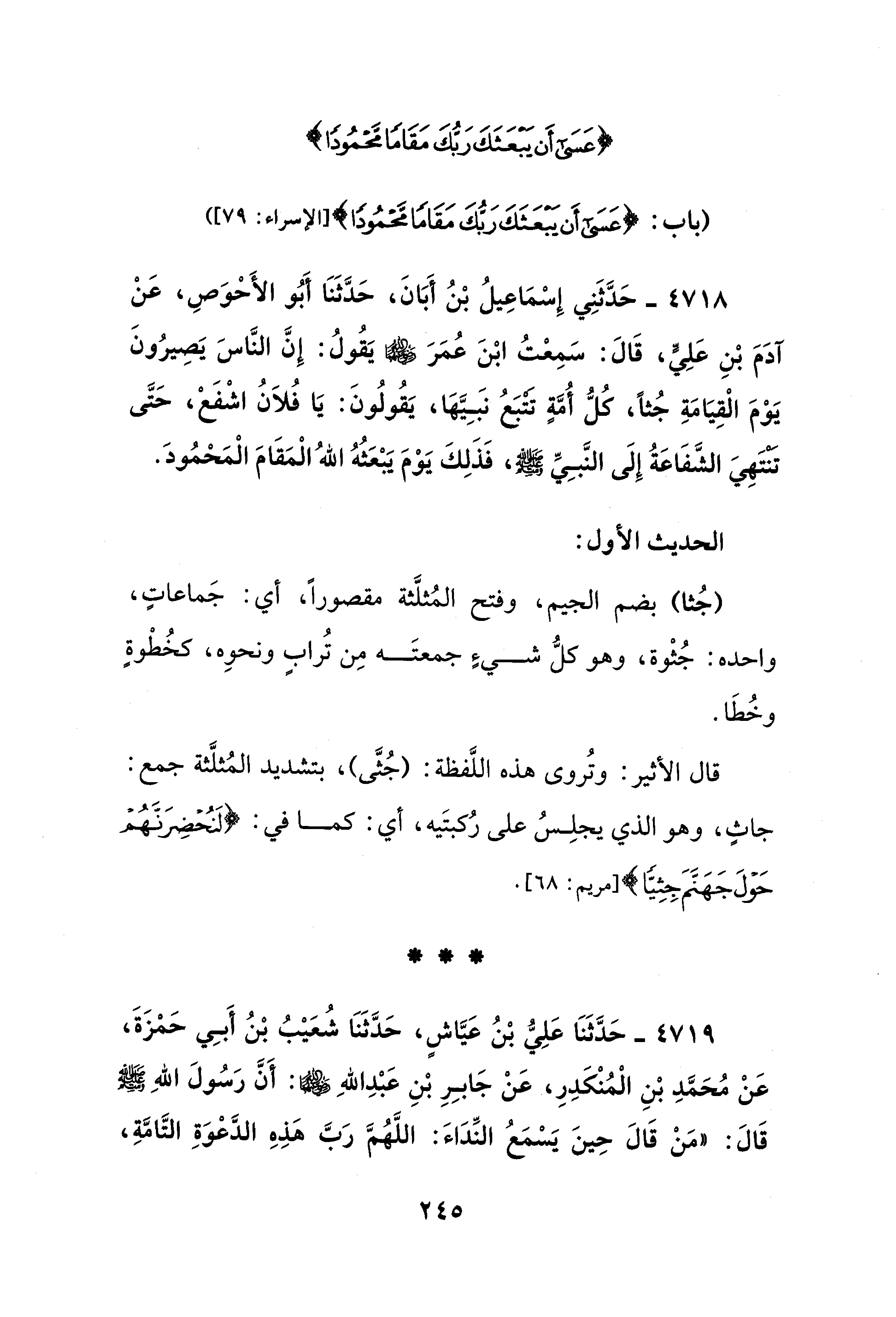 4718 - حَدَّثَنِي إِسْمَاعِيلُ بْنُ أَبَانَ، حَدَّثَنَا أَبُو الأَحوَصِ، عَنْ آدَمَ بْنِ عَلِي، قَالَ: سَمِعْتُ ابْنَ عُمَرَ - رضي الله عنهما - يَقُولُ: إِنَّ النَّاسَ يَصِيرُونَ يَومَ الْقِيَامَةِ جُثًا، كُلّ أُمَّةٍ تتبَعُ نَبِيَّها، يَقُولُونَ: يَا فُلاَنُ اشْفَع، حَتَّى تنتَهِيَ الشَّفَاعَةُ إِلَى النَّبِيِّ - رضي الله عنه -، فَذَلِكَ يَومَ يَبْعَثُهُ اللهُ الْمَقَامَ الْمَحمُودَ.