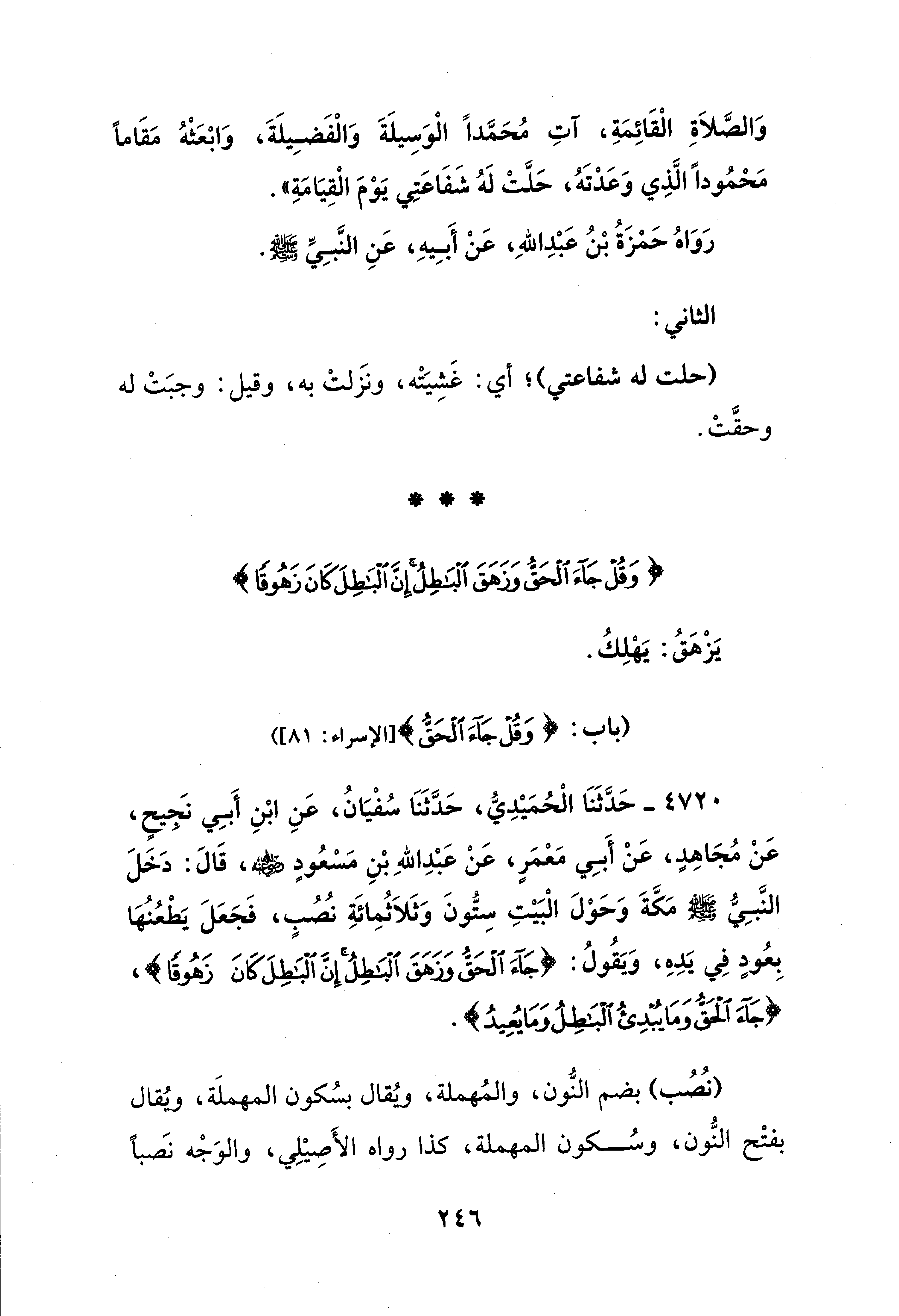 4720 - حَدَّثَنَا الْحُمَيْدِيُّ، حَدَّثَنَا سُفْيَانُ، عَنِ ابْنِ أَبِي نَجيحٍ، عَنْ مُجَاهِدٍ، عَنْ أَبِي معمَرٍ، عَنْ عَبْدِ اللهِ بْنِ مَسْعُودٍ - رضي الله عنه -، قَالَ: دَخَلَ النَّبِيُّ - صلى الله عليه وسلم - مَكَّةَ وَحَوْلَ الْبَيْتِ سِتُّونَ وَثَلاَثُمِائَةِ نُصُبٍ، فَجَعَلَ يَطْعُنها بِعُودٍ فِي يَدِهِ، وَيَقُولُ: {جَاءَ الْحَقُّ وَزَهَقَ الْبَاطِلُ إِنَّ الْبَاطِلَ كَانَ زَهُوقًا}، {قُلْ جَاءَ الْحَقُّ وَمَا يُبْدِئُ الْبَاطِلُ وَمَا يُعِيدُ}.