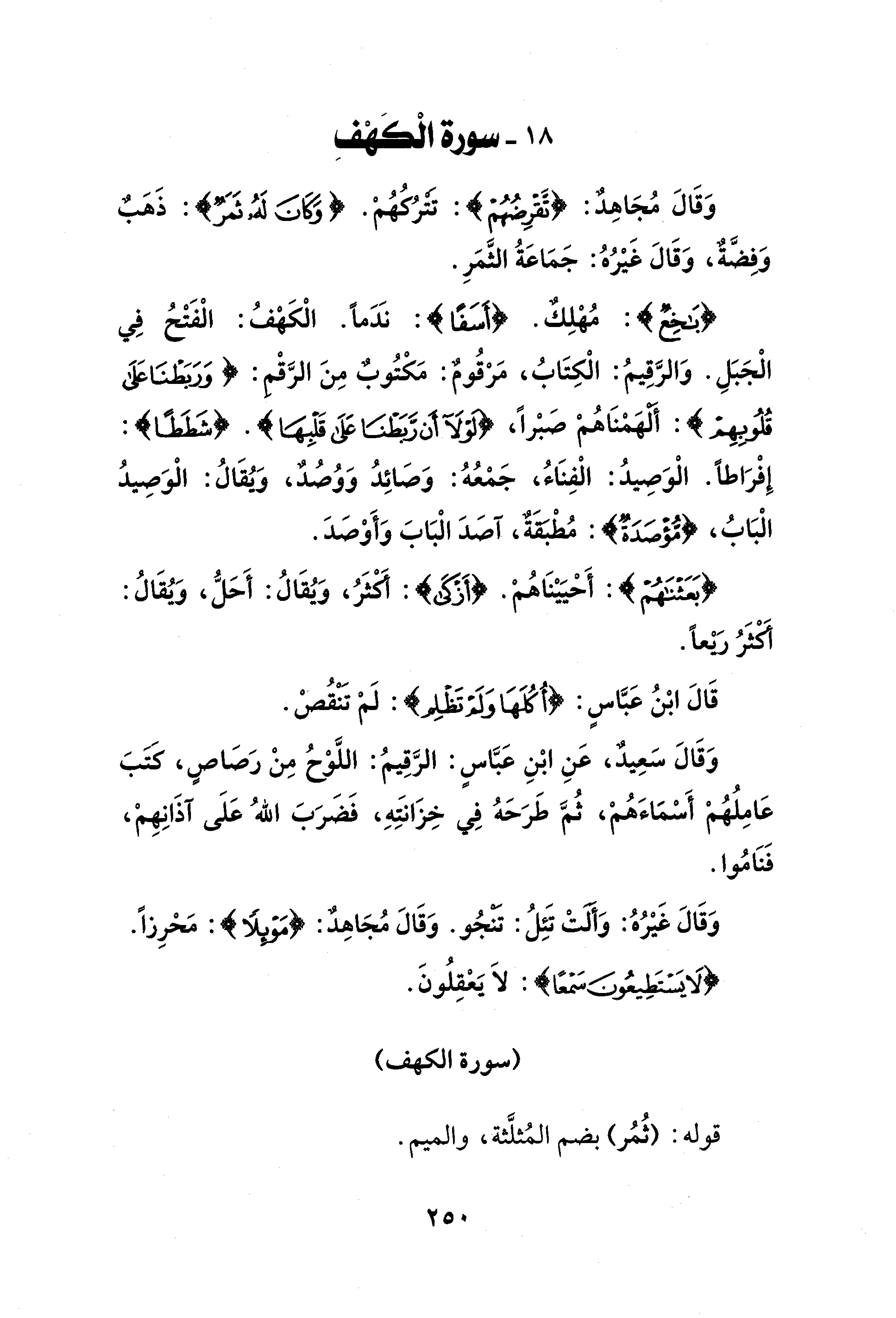 {باخِعٌ}: مُهْلِكٌ. {أسَفًا}: نَدَمًا. الْكَهْفُ: الْفَتْحُ فِي الْجَبَلِ. وَالرَّقِيمُ: الْكِتَابُ، مَرْقُومٌ: مَكْتُوبٌ مِنَ الرَّقْم: {وَرَبَطنَا علىَ قُلُوبِهم}: ألهمنَاهم صبْرًا، {لَوْلَا أَنْ رَبَطْنَا عَلَى قَلْبِهَا}. {شَطَطًا}: إِفْرَاطًا. الْوَصِيدُ: الْفِنَاءُ، جَمْعُهُ: وَصَائِدُ وَوُصُدٌ، وَيُقَالُ: الْوَصِيدُ الْبَابُ، {مُؤصدَةٌ}: مُطْبقَةٌ، آصَدَ الْبَابَ وَأَوْصَدَ.