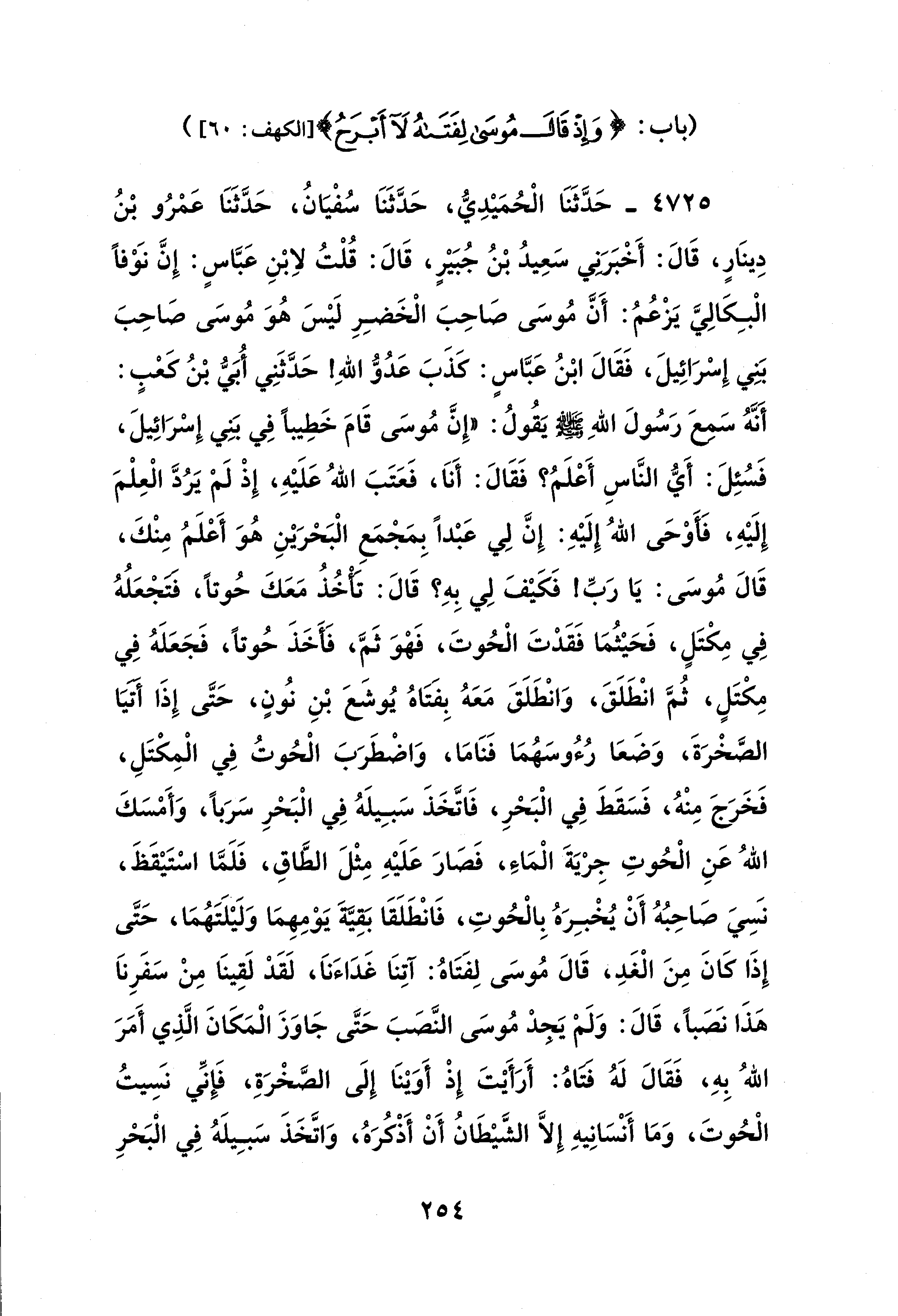 4725 - حَدَّثَنَا الْحُمَيْدِيُّ، حَدَّثَنَا سُفْيَانُ، حَدَّثَنَا عَمرُو بْنُ دِينَارٍ، قَالَ: أَخْبَرَني سَعِيدُ بْنُ جُبَيْرٍ، قَالَ: قُلْتُ لاِبْنِ عَبَّاسٍ: إِن نوفًا الْبِكَالِيَّ يَزْعُمُ: أَنَّ مُوسَى صَاحِبَ الْخَضِرِ لَيْسَ هُوَ مُوسَى صَاحِبَ بَنِي إِسْرَائِيلَ، فَقَالَ ابْنُ عَبَّاسٍ: كَذَبَ عَدُوُّ اللهِ! حَدَّثَنِي أُبَيُّ بْنُ كعبٍ: أَنَّهُ سَمِعَ رَسُولَ اللهِ - صلى الله عليه وسلم - يَقُولُ: "إِنَّ مُوسَى قَامَ خَطِيبًا فِي بَنِي إِسْرَائِيلَ، فَسُئِلَ: أَيُّ النَّاسِ أَعلَمُ؟ فَقَالَ: أَنَا، فَعَتَبَ اللهُ عَلَيْهِ، إِذْ لَم يَرُدَّ الْعِلْمَ إِلَيْهِ، فَأَوْحَى اللهُ إِلَيْهِ: إِنَّ لِي عَبْدًا بِمَجْمَعِ الْبَحرَيْنِ هُوَ أَعلَمُ مِنْكَ، قَالَ مُوسَى: يَا رَب! فَكَيْفَ لِي بِهِ؟ قَالَ: تأخُذُ مَعَكَ حُوتًا، فتجْعَلُهُ فِي مِكْتَلٍ، فَحَيْثُمَا فَقدتَ الْحُوتَ، فَهْوَ ثَمَّ، فَأَخَذَ حُوتًا، فَجَعَلَهُ فِي مِكْتَلٍ، ثُمَّ انْطَلَقَ، وَانْطَلَقَ مَعَهُ بِفَتَاهُ يُوشَعَ بْنِ نُونٍ، حَتَّى إِذَا أتيَا الصَّخْرَةَ، وَضَعَا رُءُوسَهُمَا فَنَامَا، وَاضْطَرَبَ الْحُوتُ فِي الْمِكْتَلِ، فَخَرَجَ مِنْهُ، فَسَقَطَ فِي الْبَحرِ، فَاتَّخَذَ سَبِيلَهُ فِي الْبَحرِ سَرَبًا، وَأَمسَكَ اللهُ عَنِ الْحُوتِ جِريَةَ الْمَاءِ، فَصَارَ عَلَيْهِ مِثْلَ الطَّاقِ، فَلَمَّا اسْتَيْقَظَ، نَسِيَ صَاحِبُهُ أَنْ يُخْبِرَهُ بِالْحُوتِ، فَانْطَلَقَا بَقيةَ يَوْمِهِمَا وَلَيْلَتَهُمَا، حَتَّى إِذَا كانَ مِنَ الْغَدِ، قَالَ مُوسَى لِفَتَاهُ: آتِنَا غَدَاءَنَا، لَقَد لَقِينَا مِنْ سَفَرِنَا هذَا نَصَبًا، قَالَ: وَلَم يَجد مُوسَى النَّصَبَ حَتَّى جَاوَزَ الْمَكَانَ الَّذِي أَمَرَ اللهُ بِهِ، فَقَالَ لَهُ فتاهُ: أَرَأَيْتَ إِذْ أَوينَا إِلَى الصَّخْرَةِ، فَإِنِّي نسِيتُ الْحُوتَ، وَمَا أَنْسَانِيهِ إِلَّا الشَّيْطَانُ أَنْ أَذْكُرَهُ، وَاتَّخَذَ سَبِيلَهُ فِي الْبَحْرِ