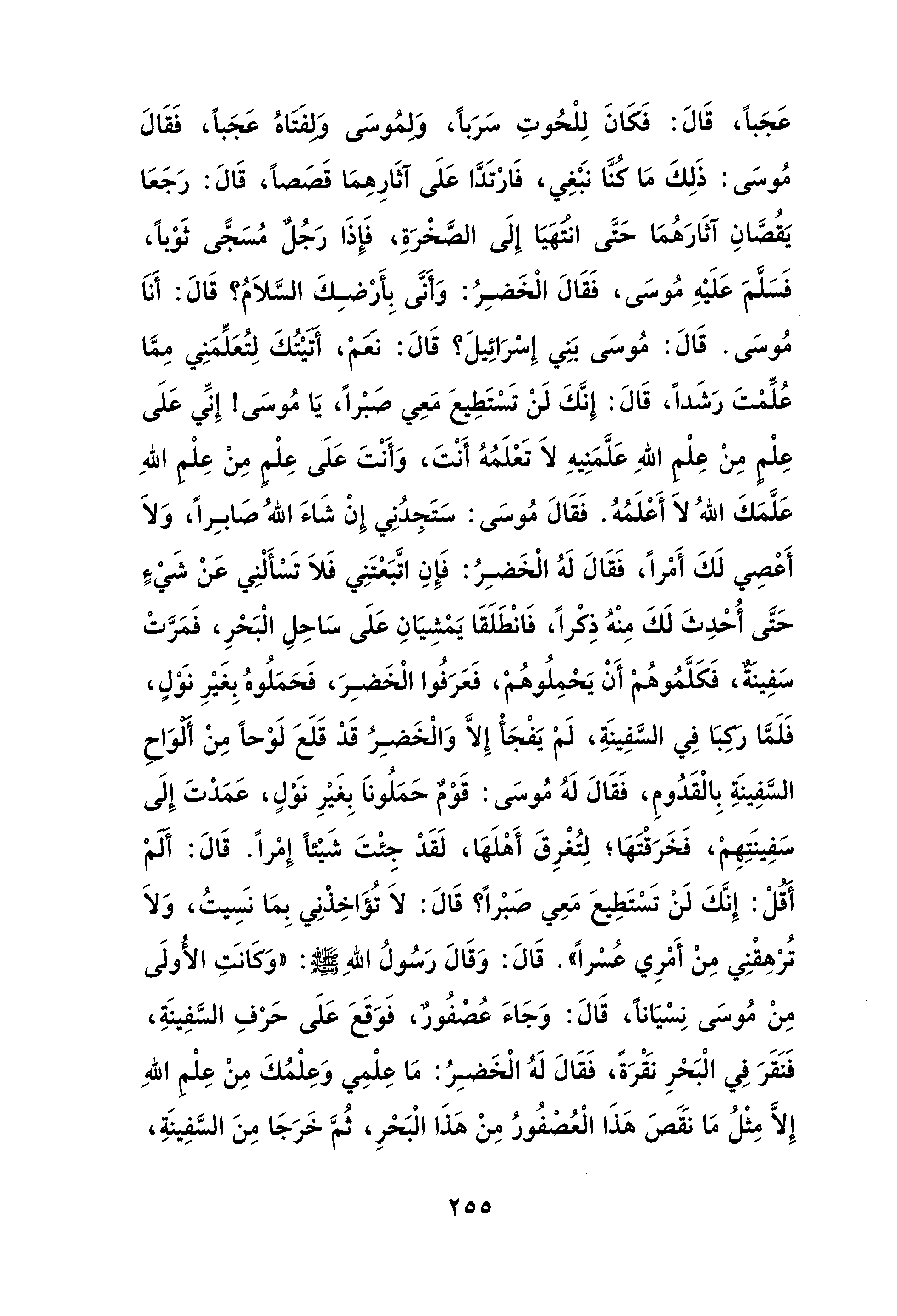 عَجَبًا، قَالَ: فَكَانَ لِلْحُوتِ سَرَبًا، وَلِمُوسَى وَلفَتَاهُ عَجَبًا، فَقَالَ مُوسَى: ذَلِكَ مَا كُنَّا نبغِي، فَارْتَدَّا عَلَى آثَارِهِمَا قَصَصًا، قَالَ: رَجَعَا يَقُصَّانِ آثَارَهُمَا حَتَّى انتهيَا إِلَى الصَّخْرَةِ، فَإِذَا رَجُلٌ مُسَجًّى ثَوْبًا، فَسَلَّمَ عَلَيْهِ مُوسَى، فَقَالَ الْخَضِرُ: وَأَنَّى بِأَرْضِكَ السَّلاَمُ؟ قَالَ: أَنَا مُوسَى. قَالَ: مُوسَى بَنِي إِسْرَائِيلَ؟ قَالَ: نعم، أتيْتُكَ لِتُعَلِّمَنِي مِمَّا عُلِّمْتَ رَشَدًا، قَالَ: إِنَّكَ لَنْ تَسْتَطِيعَ مَعِي صَبْرًا، يَا مُوسَى! إِنِّي عَلَى عِلْم مِنْ عِلْم اللهِ عَلَّمَنِيهِ لَا تَعْلَمُهُ أَنْتَ، وَأَنْتَ عَلَى عِلْمٍ مِنْ عِلْم اللهِ عَلَّمَكَ اللهُ لَا أَعْلَمُهُ. فَقَالَ مُوسَى: سَتَجدُنِي إِنْ شَاءَ اللهُ صَابِرًا، وَلَا أَعْصِي لَكَ أَمْرًا، فَقَالَ لَهُ الْخَضِرُ: فَإِنِ اتَّبَعْتَنِي فَلَا تَسْأَلْنِي عَنْ شَيْء حَتَّى أُحْدِثَ لَكَ مِنْهُ ذِكْرًا، فَانْطَلَقَا يَمشِيَانِ عَلَى سَاحِلِ الْبَحْرِ، فَمَرَّتْ سَفِينةٌ، فَكَلَّمُوهُم أَنْ يَحْمِلُوهُمْ، فَعَرَفُوا الْخَضِرَ، فَحَمَلُوهُ بِغَيْرِ نَوْلٍ، فَلَمَّا ركِبَا فِي السَّفِينَةِ، لَم يَفْجَأ إلا وَالْخَضِرُ قَدْ قَلَعَ لَوْحًا مِنْ ألوَاحِ السَّفِينَةِ بِالْقَدُومِ، فَقَالَ لَهُ مُوسَى: قَوْمٌ حَمَلُونَا بِغَيْرِ نَوْلٍ، عَمَدتَ إِلَى سَفِينَتِهمْ، فَخَرَقْتها؛ لِتُغْرِقَ أَهْلها، لَقَد جِئْتَ شَيْئًا إِمْرًا. قَالَ: ألمْ أقلْ: إِنَّكَ لَنْ تَسْتَطِيعَ مَعِي صَبْرًا؟ قَالَ: لَا تُؤَاخِذْنِي بِمَا نسَيتُ، وَلَا تُرْهِقْنِي مِنْ أَمْرِي عُسْرًا". قَالَ: وَقَالَ رَسُولُ اللهِ - صلى الله عليه وسلم -: "وَكَانَتِ الأُولَى مِنْ مُوسَى نِسْيَانًا، قَالَ: وَجَاءَ عُصْفُورٌ، فَوَقَعَ عَلَى حَرْفِ السَّفِينَةِ، فَنَقَرَ فِي الْبَحْرِ نَقْرَةً، فَقَالَ لَهُ الْخَضِرُ: مَا عِلْمِي وَعِلْمُكَ مِنْ عِلْم اللهِ إلا مِثْلُ مَا نَقَصَ هذَا الْعُصْفُورُ مِنْ هذَا الْبحْرِ، ثُمَّ خَرَجَا مِنَ السَّفِينَةِ،