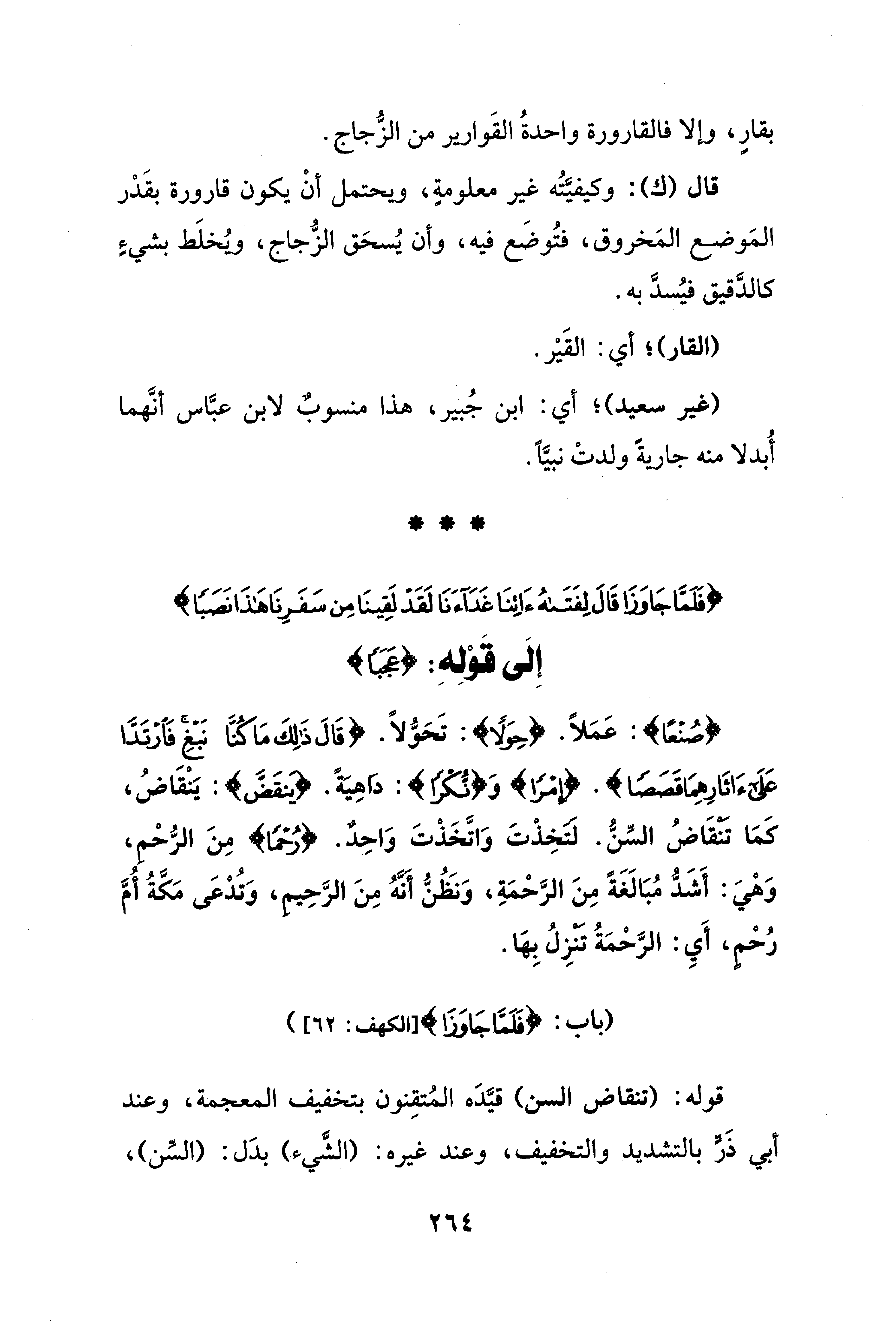 {صُنعًا}: عَمَلًا. {حِوَلًا}: تَحَوُّلًا. {قَالَ ذَلِكَ مَا كُنَّا نَبْغِ فَارْتَدَّا عَلَى آثَارِهِمَا قَصَصًا}. {إمرًا} وَ {نُكرًا}: داهِيَةً. {ينقَضَّ}: يَنْقَاضُ، كَمَا تنقَاضُ السِّنُّ. لتخِذْتَ وَاتَّخَذْتَ وَاحِدٌ. {رُحْمًا} مِنَ الرُّحْم، وَهْيَ: أَشَدُّ مُبَالَغَةً مِنَ الرَّحْمَةِ، وَنظُنُّ أَنَّهُ مِنَ الرَّحِيم، وَتُدعَى مَكَّةُ أُمَّ رُحم، أَيِ: الرَّحْمَةُ تنزِلُ بِها.