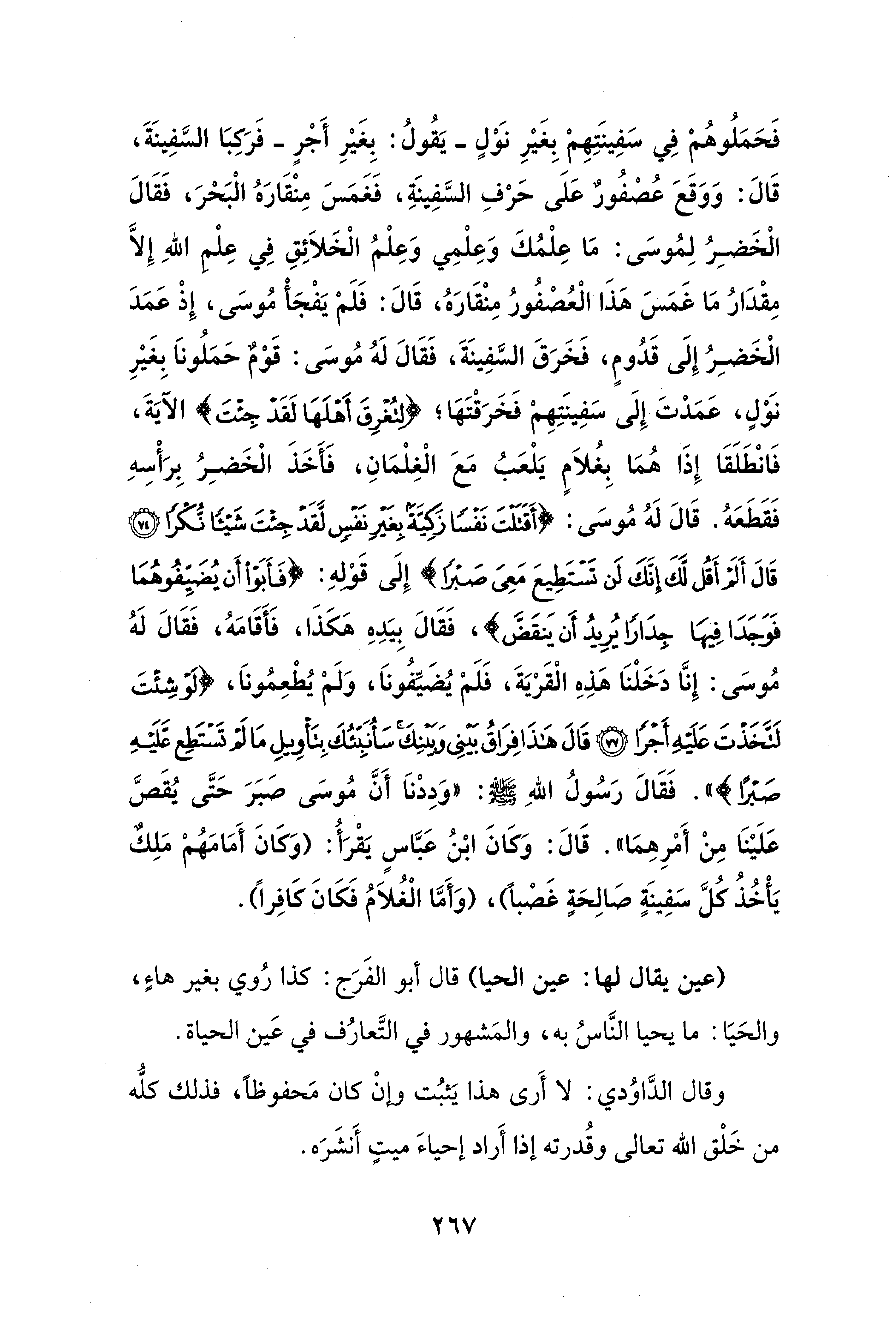 فَحَمَلُوهُم فِي سَفِينَتِهِم بِغَيْرِ نولٍ -يَقُولُ: بِغَيْرِ أَجْرٍ- فَرَكبَا السَّفِينَةَ، قَالَ: وَوَقَعَ عُصْفُورٌ عَلَى حَرْفِ السَّفِينَةِ، فَغَمَسَ مِنْقَارَهُ الْبحْرَ، فَقَالَ الْخَضِرُ لِمُوسَى: مَا عِلْمُكَ وَعِلْمِي وَعِلْمُ الْخَلَائِقِ فِي عِلْم اللهِ إِلَّا مِقْدَارُ مَا غَمَسَ هذَا الْعصْفُورُ مِنْقَارَهُ، قَالَ: فَلَم يَفْجَأْ مُوسَى، إِذْ عَمَدَ الْخَضِرُ إِلَى قَدُومٍ، فَخَرَقَ السَّفِينَةَ، فَقَالَ لَهُ مُوسَى: قَوْمٌ حَمَلُونَا بِغَيْرِ نَوْلٍ، عَمَدتَ إِلَى سَفِينَتِهم فَخَرَقْتَها؛ {لِتُغْرِقَ أَهْلَهَا لَقَدْ جِئْتَ} الآيَةَ، فَانْطَلَقَا إِذَا هُمَا بِغُلاَمٍ يَلْعَبُ مَعَ الْغِلْمَانِ، فَأَخَذَ الْخَضِرُ بِرَأْسِهِ فَقَطَعَهُ. قَالَ لَهُ مُوسَى: {أَقَتَلْتَ نَفْسًا زَكِيَّةً بِغَيْرِ نَفْسٍ لَقَدْ جِئْتَ شَيْئًا نُكْرًا (74) قَالَ أَلَمْ أَقُلْ لَكَ إِنَّكَ لَنْ تَسْتَطِيعَ مَعِيَ صَبْرًا} إِلَى قولهِ: {فَأَبَوْا أَنْ يُضَيِّفُوهُمَا فَوَجَدَا فِيهَا جِدَارًا يُرِيدُ أَنْ يَنْقَضَّ}، فَقَالَ بِيَدِهِ هكَذَا، فَأَقَامَهُ، فَقَالَ لَهُ مُوسَى: إِنَّا دَخَلْنَا هذهِ الْقَرْيَةَ، فَلَم يُضَيِّفُونَا، وَلَم يُطْعِمُونَا، {لَوْ شِئْتَ لَاتَّخَذْتَ عَلَيْهِ أَجْرًا (77) قَالَ هَذَا فِرَاقُ بَيْنِي وَبَيْنِكَ سَأُنَبِّئُكَ بِتَأْوِيلِ مَا لَمْ تَسْتَطِعْ عَلَيْهِ صَبْرًا}. فَقَالَ رَسُولُ اللهِ - صلى الله عليه وسلم -: "وَدِدْنَا أَنَّ مُوسَى صَبَرَ حَتَّى يُقَصَّ عَلَيْنَا مِنْ أَمْرِهِمَا". قَالَ: وَكَانَ ابْنُ عَبَّاسٍ يَقْرَأُ: (وَكَانَ أَمَامَهُمْ مَلِكٌ يَأخُذُ كُلَّ سَفِينَةٍ صَالِحَةٍ غَصْبًا)، (وَأَمَّا الْغُلاَمُ فَكَانَ كَافِرًا).