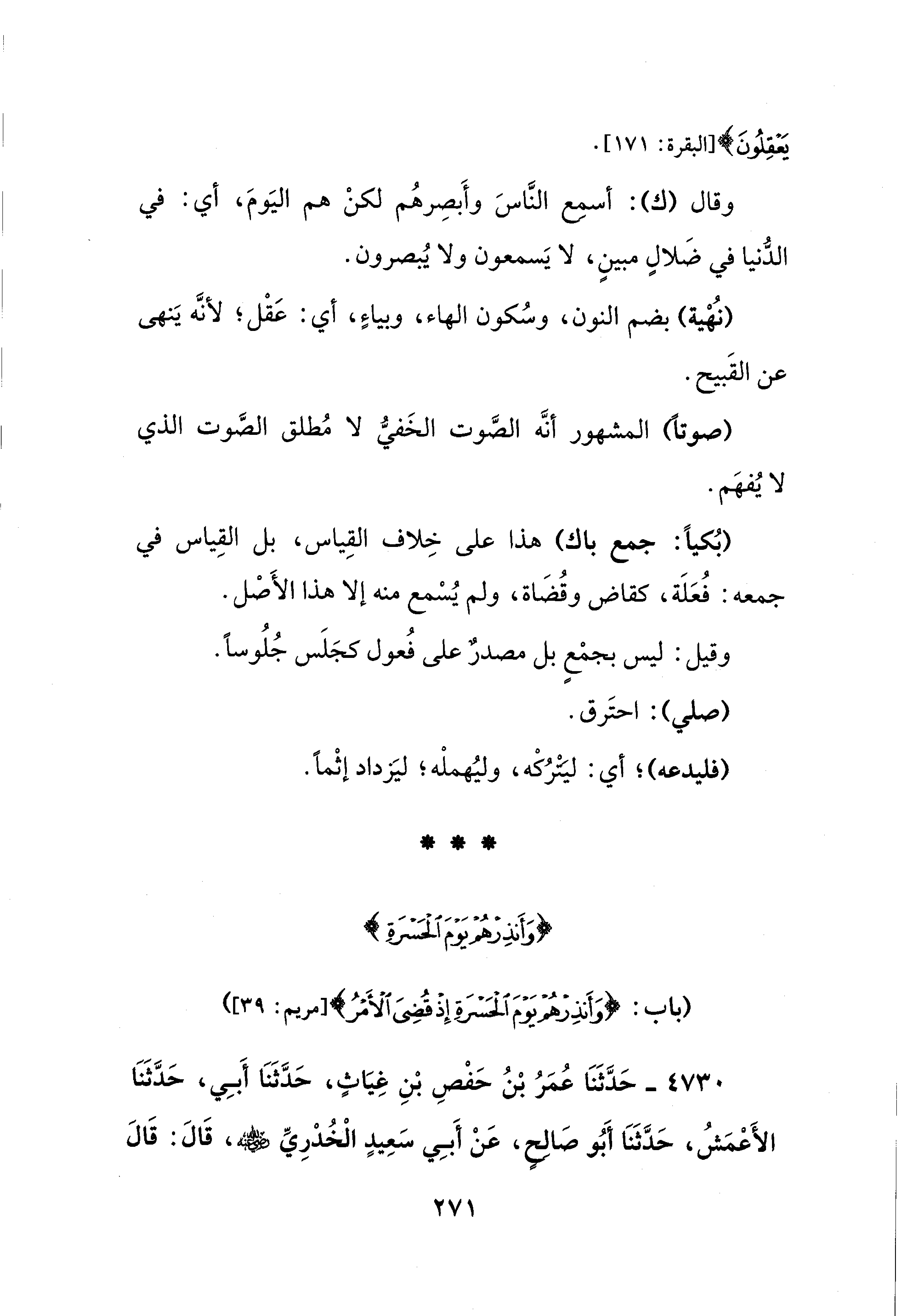 (بُكيًّا: جمع باك) هذا على خِلاف القِياس، بل القِياس في جمعه: فُعَلَة، كقاض وقُضَاة، ولم يُسْمع منه إلا هذا الأصْل.