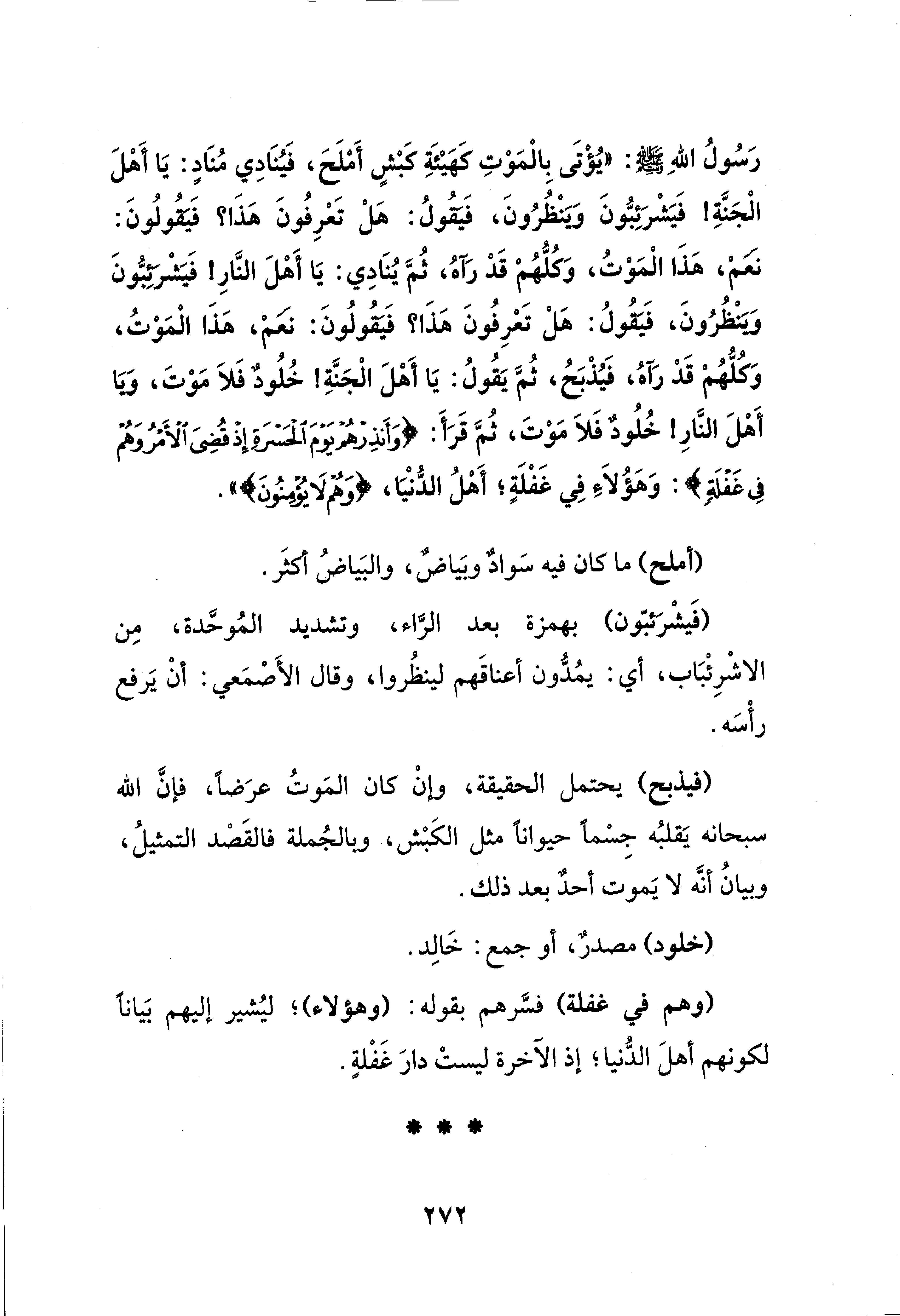 رَسُولُ اللهِ - صلى الله عليه وسلم -: "يُؤْتَى بِالْمَؤتِ كهيئَةِ كبشٍ أَملَحَ، فَيُنَادِي مُنَادٍ: يَا أَهْلَ الْجَنَّة! فَيَشْرَئِبُّونَ وَيَنْظُرُونَ، فَيقُولُ: هلْ تَعْرِفُونَ هذَا؟ فَيقُولُونَ: نعم، هذَا الْمَوْتُ، وَكلُّهُم قَدْ رَآهُ، ثُمَّ يُنَادِي: يَا أَهْلَ النَّارِ! فَيَشْرَئِبُّونَ وَيَنْظُرُونَ، فَيقُولُ: هلْ تَعرِفُونَ هذَا؟ فَيقُولُونَ: نعم، هذَا الْمَوْتُ، وَكلُّهُم قَدْ رآهُ، فَيُذْبَحُ، ثُمَّ يَقُولُ: يَا أَهْلَ الْجَنَّةِ! خُلُودٌ فَلَا مَوْتَ، وَيَا أَهْلَ النَّارِ! خُلُودٌ فَلَا مَوْتَ، ثُمَّ قَرَأَ: {وَأَنْذِرْهُمْ يَوْمَ الْحَسْرَةِ إِذْ قُضِيَ الْأَمْرُ وَهُمْ فِي غَفْلَةٍ}: وهؤُلاَءِ فِي غَفْلَةٍ؛ أَهْلُ الدُّنْيَا، {وَهُمْ لَا يُؤْمِنُونَ} ".