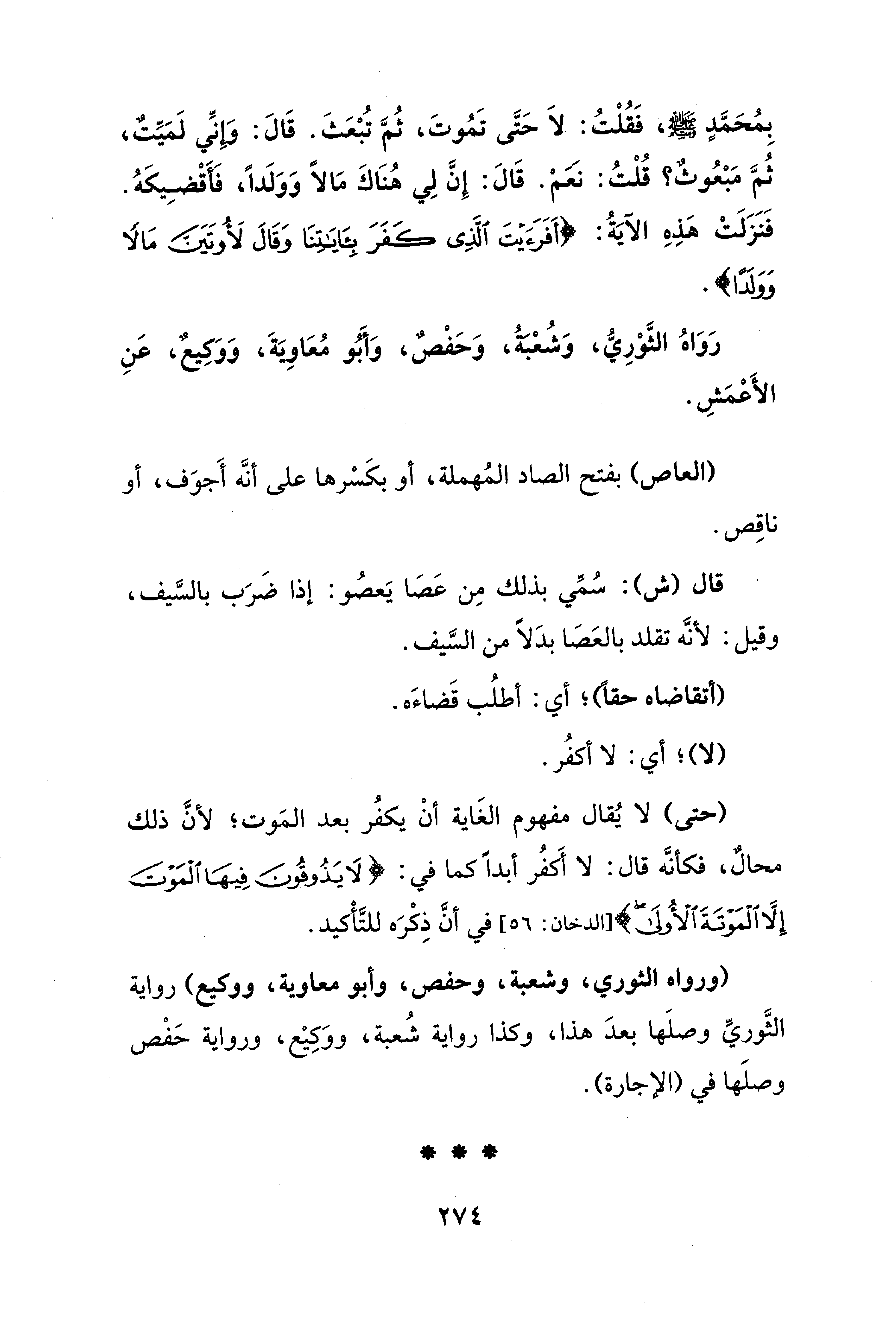 بِمُحَمَّدٍ - صلى الله عليه وسلم -، فَقُلْتُ: لَا حَتَّى تَمُوتَ، ثُمَّ تُبْعَثَ. قَالَ: وإنِّي لَمَيِّتٌ، ثُمَّ مَبْعُوثٌ؟ قُلْتُ: نعم. قَالَ: إِنَّ لِي هُنَاكَ مَالًا وَوَلَدًا، فَأَقْضِيكَهُ. فَنَزَلَتْ هذِهِ الآيَةُ: {أَفَرَأَيْتَ الَّذِي كَفَرَ بِآيَاتِنَا وَقَالَ لَأُوتَيَنَّ مَالًا وَوَلَدًا}.