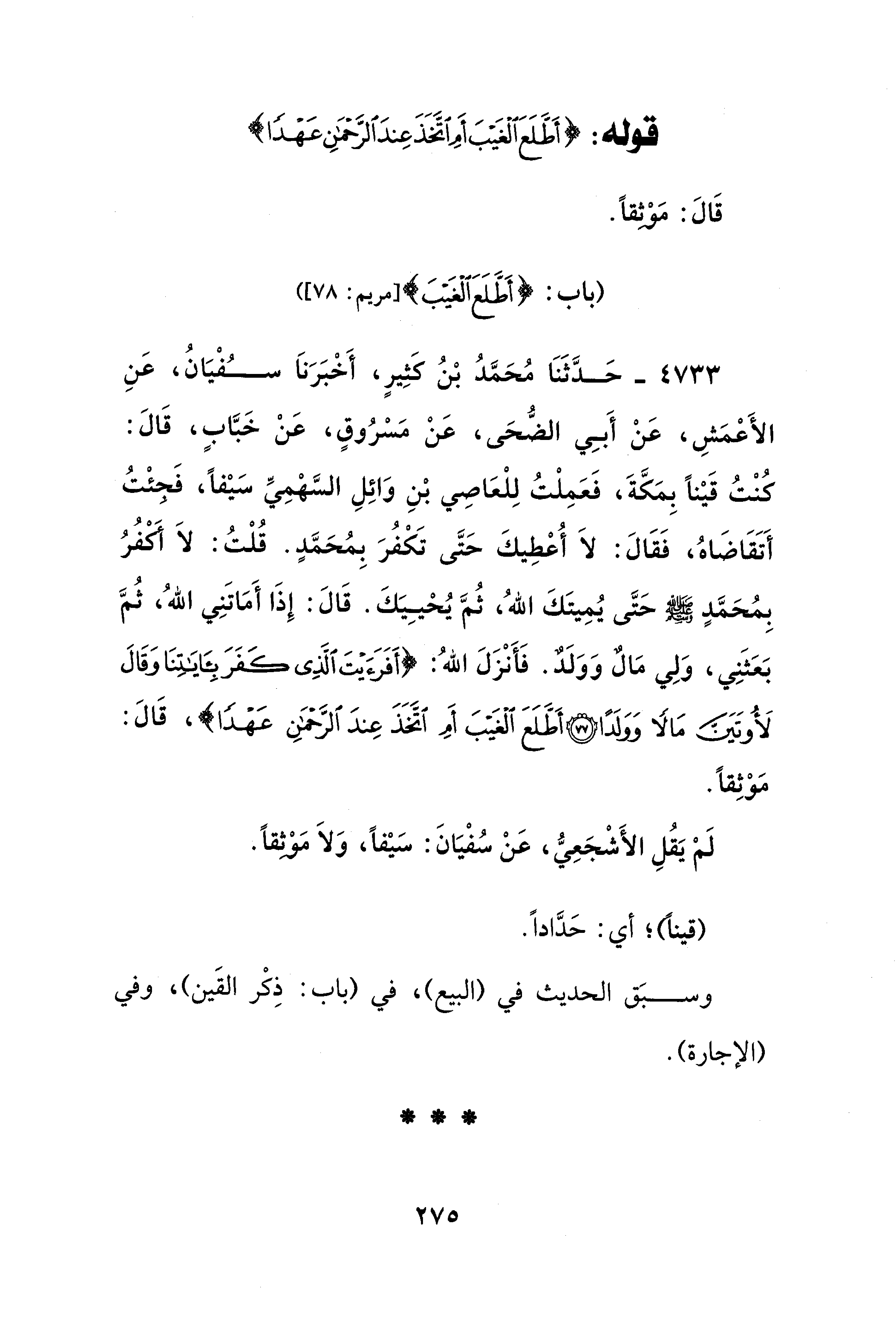 4733 - حَدَّثَنَا مُحَمَّدُ بْنُ كَثِيرٍ، أَخْبَرَنَا سُفْيَانُ، عَنِ الأَعْمَشِ، عَنْ أَبِي الضُّحَى، عَنْ مَسْرُوقٍ، عَنْ خَبَّابٍ، قَالَ: كُنْتُ قَيْنًا بِمَكَّةَ، فَعَمِلْتُ لِلْعَاصِي بْنِ وَائِلِ السَّهْمِيِّ سَيْفًا، فَجئْتُ أَتَقَاضَاهُ، فَقَالَ: لَا أُعْطِيكَ حَتَّى تَكْفُرَ بِمُحَمَّدٍ. قُلْتُ: لَا أكفرٌ بِمُحَمَّدٍ - رضي الله عنه - حَتَّى يُمِيتَكَ اللهُ، ثُمَّ يُحْيِيَكَ. قَالَ: إِذَا أَمَاتَنِي اللهُ، ثُمَّ بَعَثَنِي، وَلِي مَالٌ وَوَلدٌ. فَأَنْزَلَ اللهُ: {أَفَرَأَيْتَ الَّذِي كَفَرَ بِآيَاتِنَا وَقَالَ لَأُوتَيَنَّ مَالًا وَوَلَدًا (77) أَطَّلَعَ الْغَيْبَ أَمِ اتَّخَذَ عِنْدَ الرَّحْمَنِ عَهْدًا}، قَالَ: مَوْثِقًا.
