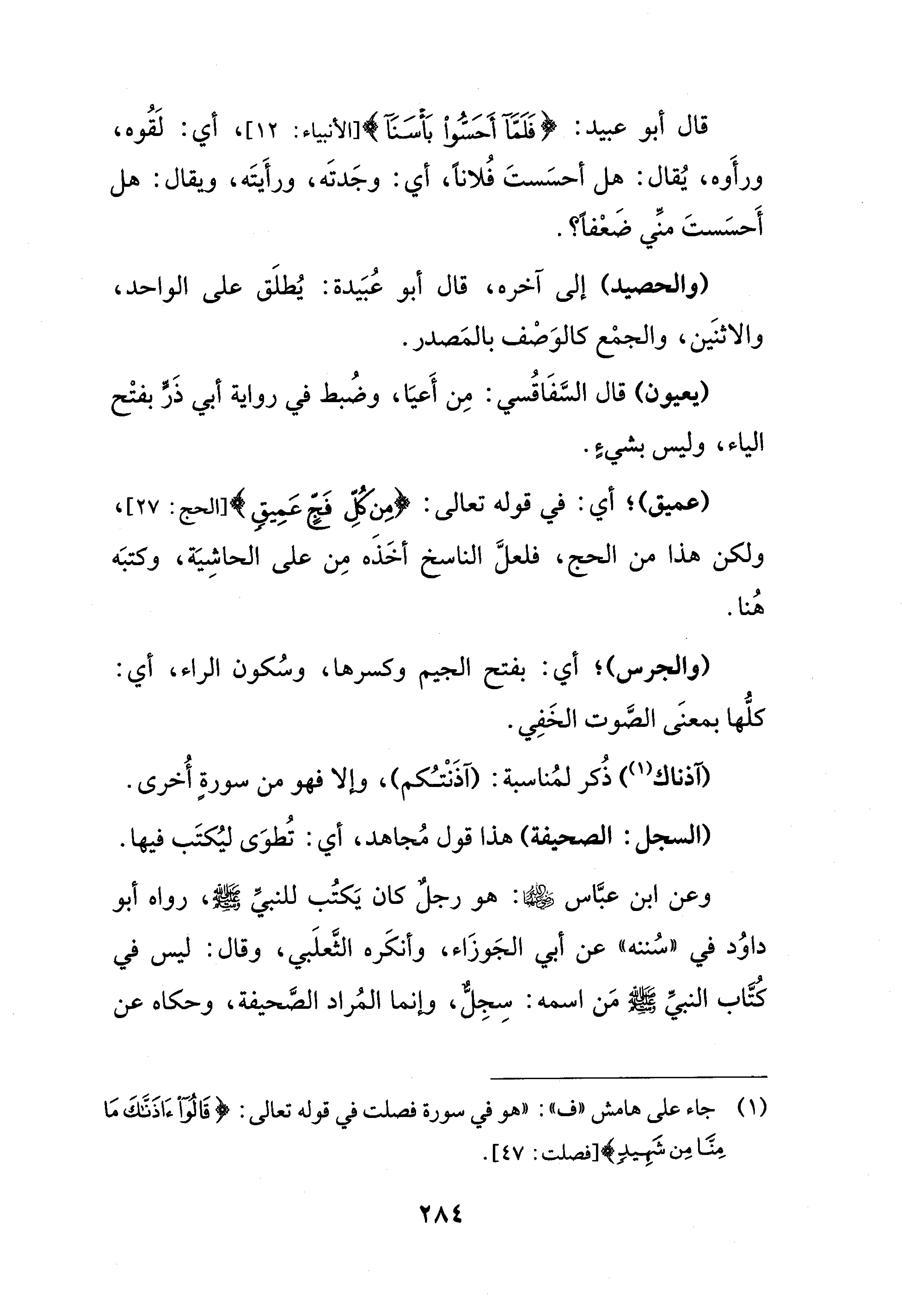 قال أبو عبيد: {فَلَما أَحسوْا بَأسَنَا} [الأنبياء: 12]، أي: لَقُوه، ورأَوه، يُقال: هل أحسَستَ فُلانًا، أي: وجَدتَه، ورأَيتَه، ويقال: هل أَحسَستَ منِّي ضَعْفًا؟.