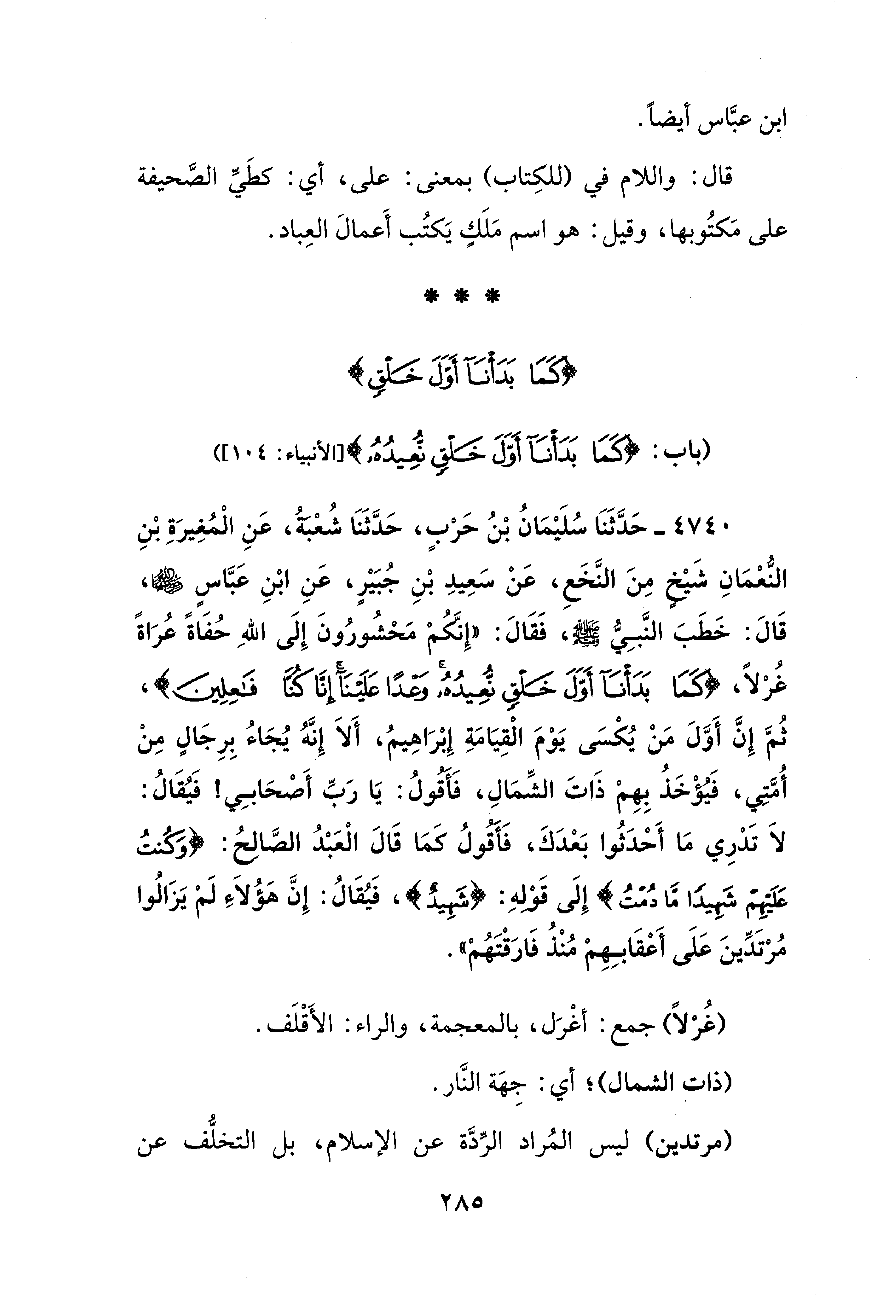 4740 - حَدَّثَنَا سُلَيْمَانُ بْنُ حرْبٍ، حَدَّثَنَا شُعبةُ، عَنِ الْمُغِيرَةِ بْنِ النُّعمَانِ شَيخٍ مِنَ النَّخَعِ، عَنْ سَعِيدِ بْنِ جُبَيْرٍ، عَنِ ابْنِ عَبَّاسٍ - رضي الله عنهما -، قَالَ: خَطَبَ النَّبِيُّ - صلى الله عليه وسلم -، فَقَالَ: "إِنَّكمْ مَحْشُورُونَ إِلَى اللهِ حُفَاةً عُرَاةً غُرْلًا، {كَمَا بَدَأْنَا أَوَّلَ خَلْقٍ نُعِيدُهُ وَعْدًا عَلَيْنَا إِنَّا كُنَّا فَاعِلِينَ}، ثُمَّ إِنَّ أَوَّلَ مَنْ يُكْسَى يَوْمَ الْقِيَامَةِ إِبْرَاهِيمُ، أَلاَ إِنَّهُ يُجَاءُ بِرِجَالٍ مِنْ أُمَّتِي، فَيُؤْخَذُ بِهِم ذَاتَ الشِّمَالِ، فَأَقُولُ: يَا رَبِّ أَصْحَابِي! فَيُقَالُ: لَا تَدرِي مَا أَحْدَثُوا بَعْدَكَ، فَأقولُ كَمَا قَالَ الْعَبْدُ الصَّالح: {كنتُ عَلَيهم شَهِيدًا مَّا دُمْتُ} إِلَى قَوْلهِ: {شَهِيدٌ}، فَيُقَالُ: إِنَّ هؤُلاَءِ لَم يَزَالُوا مُرتَدِّينَ عَلَى أَعْقَابِهمْ مُنْذُ فَارَقْتَهُمْ".