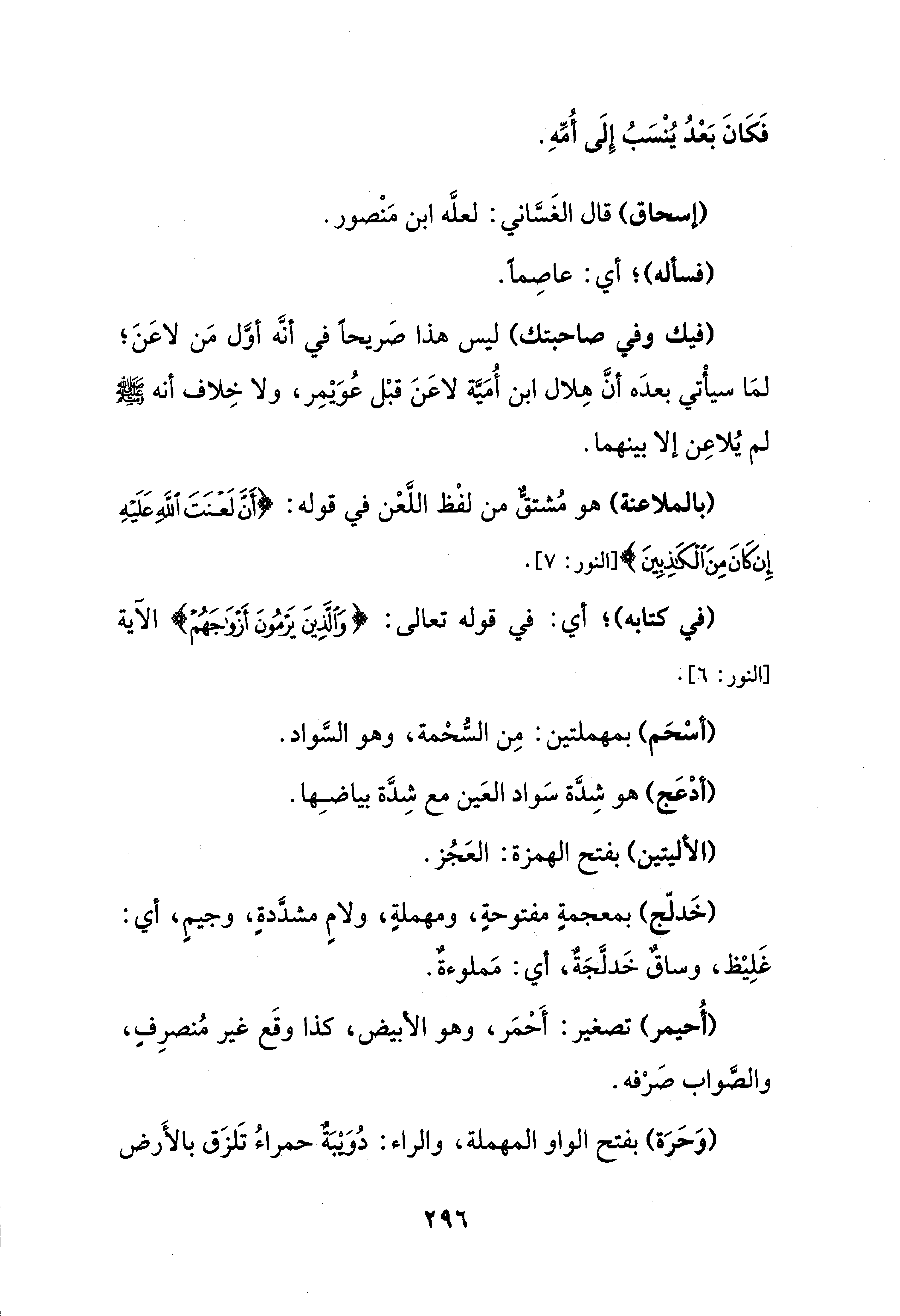 (بالملاعنة) هو مُشتقٌّ من لفْظ اللَّعْن في قوله: {أَنَّ لَعْنَتَ اللَّهِ عَلَيْهِ إِنْ كَانَ مِنَ الْكَاذِبِينَ} [النور: 7].