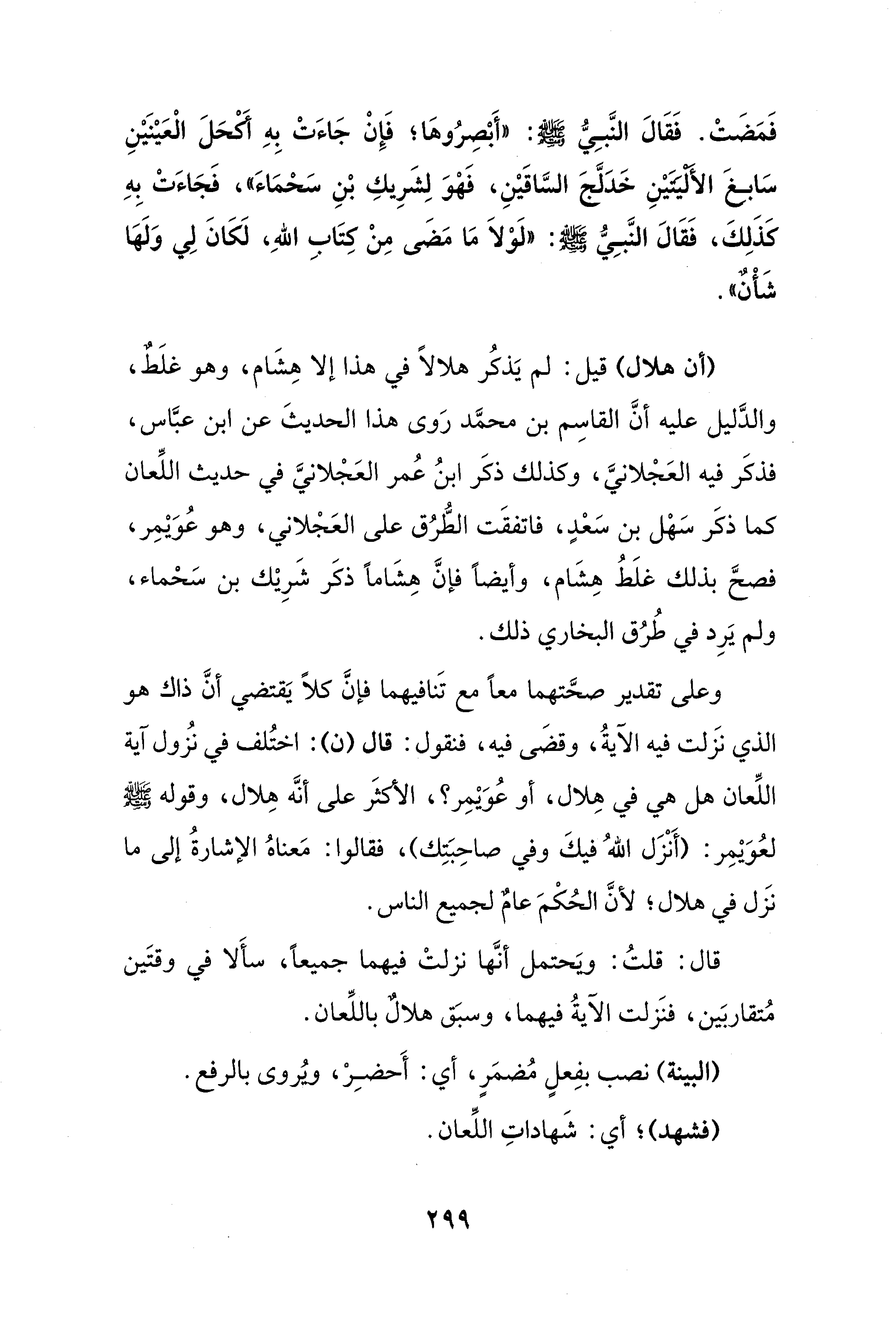 (أن هلال) قيل: لم يَذكُر هلالًا في هذا إلا هِشَام، وهو غلَطٌ، والدَّليل عليه أنَّ القاسِم بن محمَّد رَوى هذا الحديثَ عن ابن عبَّاس، فذكَر فيه العَجْلانيَّ، وكذلك ذكَر ابنُ عُمر العَجْلانيَّ في حديث اللِّعان كما ذكَر سَهْل بن سَعْدٍ، فاتفقَت الطُّرُق على العَجْلاني، وهو عُوَيْمِر، فصحَّ بذلك غلَطُ هِشَام، وأيضَا فإنَّ هِشَامًا ذكَر شَرِيْك بن سَحْماء، ولم يَرِد في طُرُق البخاري ذلك.