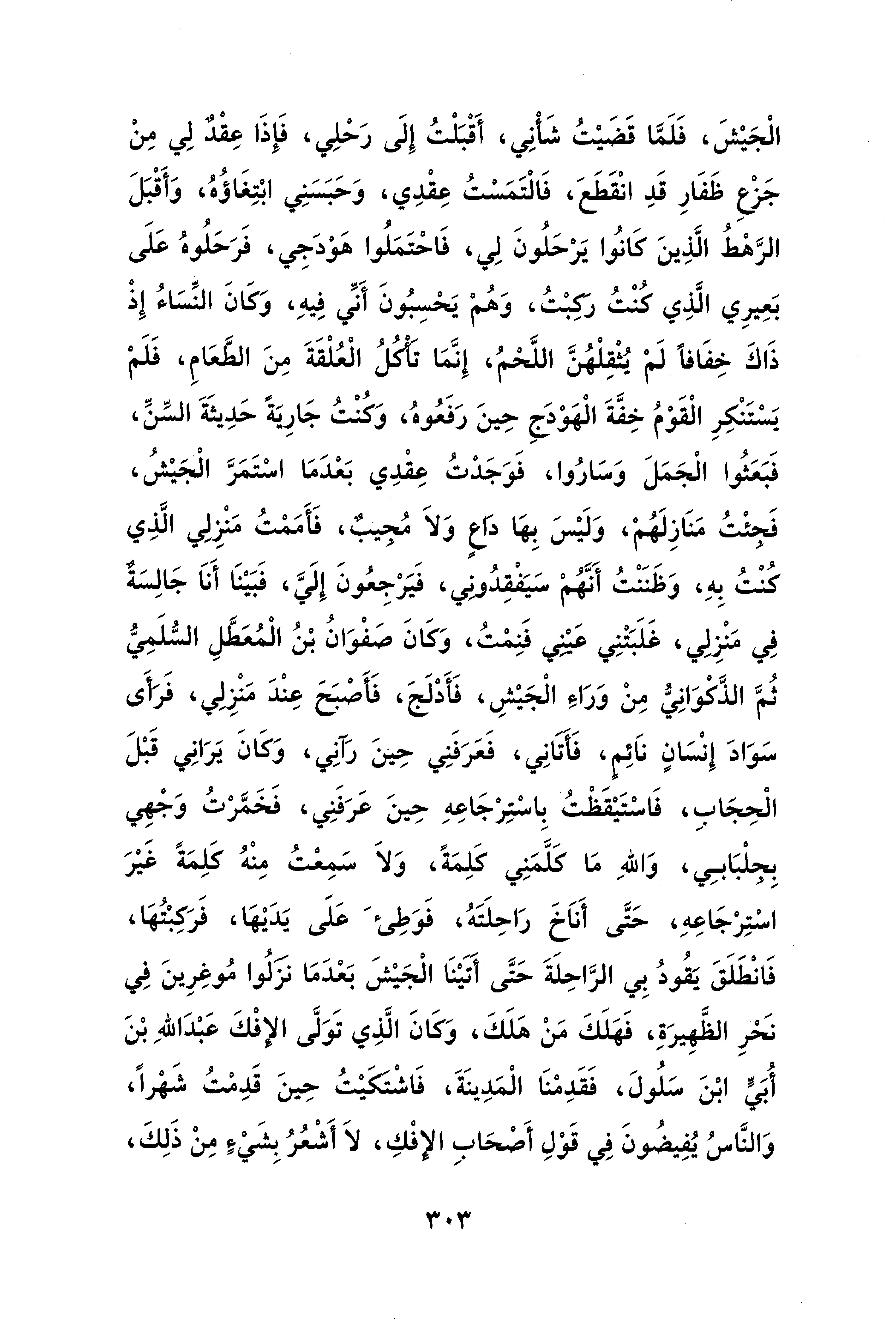 الْجَيْشَ، فَلَمَّا قَضَيْتُ شَأْنِي، أَقْبَلْتُ إِلَى رَحْلِي، فَإِذَا عِقْدٌ لِي مِنْ جَزْعِ ظَفَارِ قَدِ انْقَطَعَ، فَالْتَمَسْتُ عِقْدِي، وَحَبَسَنِي ابْتِغَاؤُهُ، وَأَقْبَلَ الرَّهْطُ الَّذِينَ كَانُوا يَرْحَلُونَ لِي، فَاحْتَمَلُوا هَوْدَجِي، فَرَحَلُوهُ عَلَى بَعِيرِي الَّذِي كُنْتُ رَكِبْتُ، وَهُمْ يَحْسِبُونَ أَنِّي فِيهِ، وَكَانَ النِّسَاءُ إِذْ ذَاكَ خِفَافًا لَمْ يُثْقِلْهُنَّ اللَّحْمُ، إِنَّمَا تأْكُلُ الْعُلْقَةَ مِنَ الطَّعَامِ، فَلَمْ يَسْتَنْكِرِ الْقَوْمُ خِفَّةَ الْهَوْدجَ حِينَ رَفَعُوهُ، وَكُنْتُ جَارِيَةً حَدِيثَةَ السِّنِّ، فَبَعَثُوا الْجَمَلَ وَسَارُوا، فَوَجَدْتُ عِقْدِي بَعْدَمَا اسْتَمَرَّ الْجَيْشُ، فَجئْتُ مَنَازِلَهُمْ، وَلَيْسَ بِهَا دَاعٍ وَلَا مُجيبٌ، فَأَمَمْتُ مَنْزِلِي الَّذِي كُنْتُ بِهِ، وَظَنَنْتُ أَنَّهُمْ سَيَفْقِدُوني، فَيَرْجِعُونَ إِلَيَّ، فَبَيْنَا أَنَا جَالِسَةٌ فِي مَنْزِلِي، غَلَبَتْنِي عَيْنِي فَنِمْتُ، وَكَانَ صَفْوَانُ بْنُ الْمُعَطَلِ السُّلَمِيُّ ثُمَّ الذَّكْوَانِيُّ مِنْ وَرَاءِ الْجَيْشِ، فَأَدْلَجَ، فَأَصْبَحَ عِنْدَ مَنْزِلِي، فَرَأَى سَوَادَ إِنْسَانٍ نَائِمٍ، فَأَتَانِي، فَعَرَفَنِي حِينَ رَآنِي، وَكَانَ يَرَانِي قَبْلَ الْحِجَابِ، فَاسْتَيْقَظْتُ بِاسْتِرْجَاعِهِ حِينَ عَرَفَنِي، فَخَمَّرْتُ وَجْهِي بِجلْبَابِي، وَاللهِ مَا كلَّمَنِي كلِمَةً، وَلَا سَمِعْتُ مِنْهُ كلِمَةً غَيْرَ اسْتِرْجَاعِهِ، حَتَّى أَناَخَ رَاحِلَتَهُ، فَوَطِئَ عَلَى يَدَيْهَا، فَرَكِبْتُهَا، فَانْطَلَقَ يَقُودُ بِي الرَّاحِلَةَ حَتَّى أَتَيْنَا الْجَيْشَ بَعْدَمَا نزَلُوا مُوغِرِينَ فِي نَحْرِ الظَّهِيرَةِ، فَهَلَكَ مَنْ هَلَكَ، وَكَانَ الَّذِي تَوَلَّى الإفْكَ عَبْدَ اللهِ بْنَ أُبَيٍّ بْنَ سَلُولَ، فَقَدِمْنَا الْمَدِينَةَ، فَاشْتكَيْتُ حِينَ قَدِمْتُ شَهْرًا، وَالنَّاسُ يُفِيضُونَ فِي قَوْلِ أَصْحَابِ الإِفْكِ، لَا أَشْعُرُ بِشَيْءٍ مِنْ ذَلِكَ،
