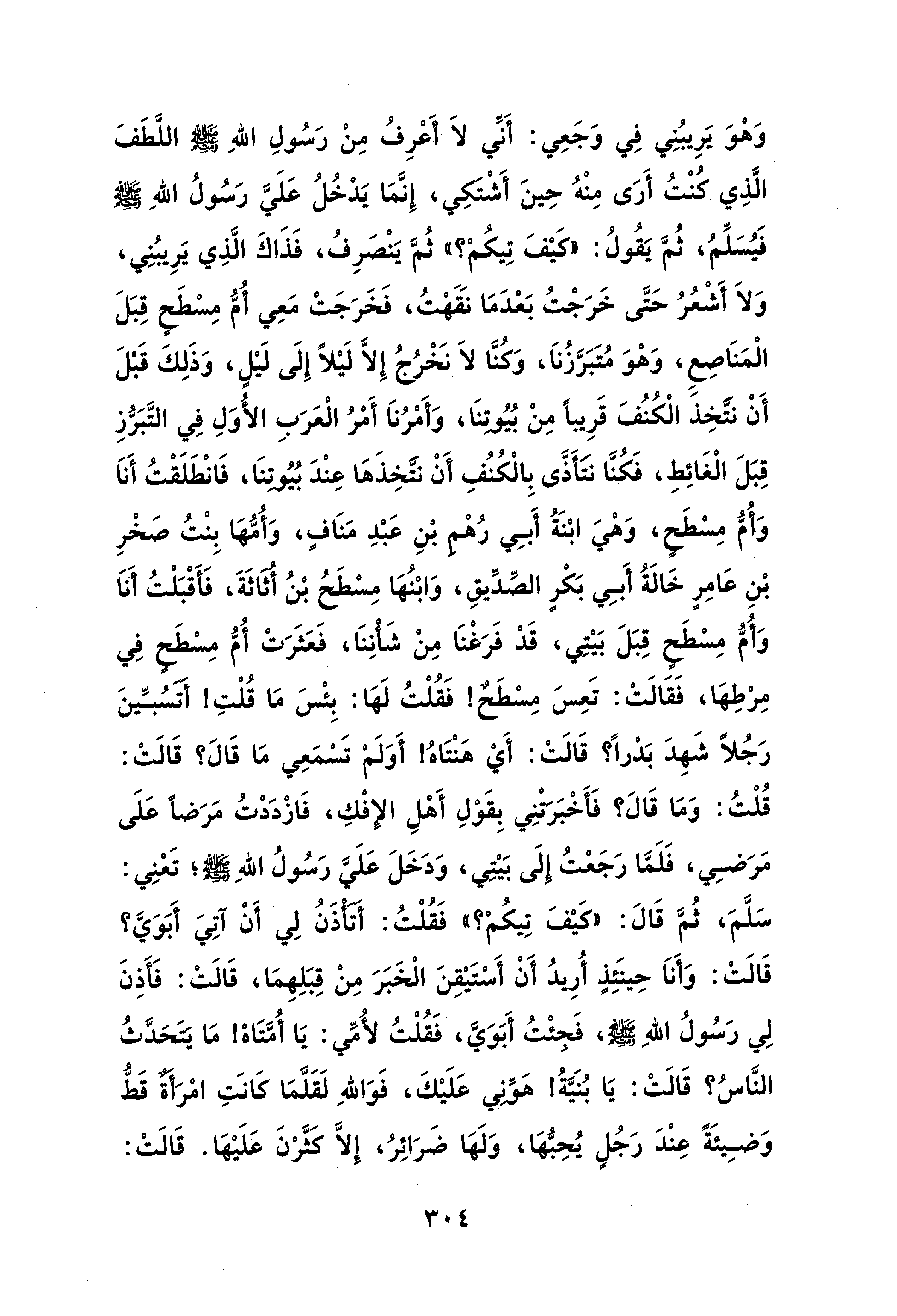 وَهْوَ يَرِيبُنِي فِي وَجَعِي: أَنِّي لَا أَعْرِفُ مِنْ رَسُولِ اللهِ - صلى الله عليه وسلم - اللَّطَفَ الَّذِي كُنْتُ أَرَى مِنْهُ حِينَ أَشْتكِي، إِنَّمَا يَدْخُل عَلَيَّ رَسُولُ اللهِ - صلى الله عليه وسلم - فَيُسَلِّمُ، ثُمَّ يَقُولُ: "كَيْفَ تِيكُمْ؟ " ثُمَّ يَنْصَرِفُ، فَذَاكَ الَّذِي يَرِيبُنِي، وَلَا أَشْعُرُ حَتَّى خَرَجْتُ بَعْدَمَا نَقَهْتُ، فَخَرَجَتْ مَعِي أُمُّ مِسْطَحٍ قِبَلَ الْمَنَاصِعِ، وَهْوَ مُتَبَرَّزُنَا، وَكُنَّا لَا نَخْرُجُ إِلَّا لَيْلًا إِلَى لَيْلٍ، وَذَلِكَ قَبْلَ أَنْ نتَّخِذَ الْكُنُفَ قَرِيبًا مِنْ بُيُوتنَا، وَأَمْرُنَا أَمْرُ الْعَرَبِ الأُوَلِ فِي التَّبَرُّزِ قِبَلَ الْغَائِطِ، فَكُنَّا نتَأَذَّى بِالْكُنُفِ أَنْ نتَّخِذَهَا عِنْدَ بُيُوتنَا، فَانْطَلَقْتُ أَنَا وَأُمُّ مِسْطَحٍ، وَهْيَ ابْنَةُ أَبِي رُهْمِ بْنِ عَبْدِ مَنَافٍ، وَأمُّهَا بِنْتُ صَخْرِ بْنِ عَامِرٍ خَالَةُ أَبِي بَكْرٍ الصِّدِّيقِ، وَابْنُهَا مِسْطَحُ بْنُ أُثَاثَةَ، فَأَقْبَلْتُ أَنَا وَأُمُّ مِسْطَحٍ قِبَلَ بَيْتِي، قَدْ فَرَغْنَا مِنْ شَأْنِنَا، فَعَثَرَتْ أُمُّ مِسْطَحٍ فِي مِرْطِهَا، فَقَالَتْ: تَعِسَ مِسْطَحٌ! فَقُلْتُ لَهَا: بِئْسَ مَا قُلْتِ! أتسُبِّينَ رَجُلًا شَهِدَ بَدْرًا؟ قَالَتْ: أَيْ هَنْتَاهُ! أَوَلَمْ تَسْمَعِي مَا قَالَ؟ قَالَتْ: قُلْتُ: وَمَا قَالَ؟ فَأَخْبَرَتْنِي بِقَوْلِ أَهْلِ الإفْكِ، فَازْدَدْتُ مَرَضًا عَلَى مَرَضِي، فَلَمَّا رَجَعْتُ إِلَى بَيْتِي، وَدَخَلَ عَلَيَّ رَسُولُ اللهِ - صلى الله عليه وسلم -؛ تَعْنِي: سَلَّمَ، ثُمَّ قَالَ: "كَيْفَ تِيكُمْ؟ " فَقُلْتُ: أتَأْذَنُ لِي أَنْ آتِيَ أَبَوَيَّ؟ قَالَتْ: وَأَنَا حِينَئِذٍ أُرِيدُ أَنْ أَسْتَيْقِنَ الْخَبَرَ مِنْ قِبَلِهِمَا، قَالَتْ: فَأَذِنَ لِي رَسُولُ اللهِ - صلى الله عليه وسلم -، فَجئْتُ أَبَوَيَّ، فَقُلْتُ لأُمِّي: يَا أُمَّتَاهْ! مَا يَتَحَدَّثُ النَّاسُ؟ قَالَتْ: يَا بُنَيَّةُ! هَوِّنِي عَلَيْكَ، فَوَاللهِ لَقَلَّمَا كَانَتِ امْرَأةٌ قَطُّ وَضِيئَةً عِنْدَ رَجُلٍ يُحِبُّهَا، وَلَهَا ضَرَائِرُ، إِلَّا كَثَّرْنَ عَلَيْهَا. قَالَتْ: