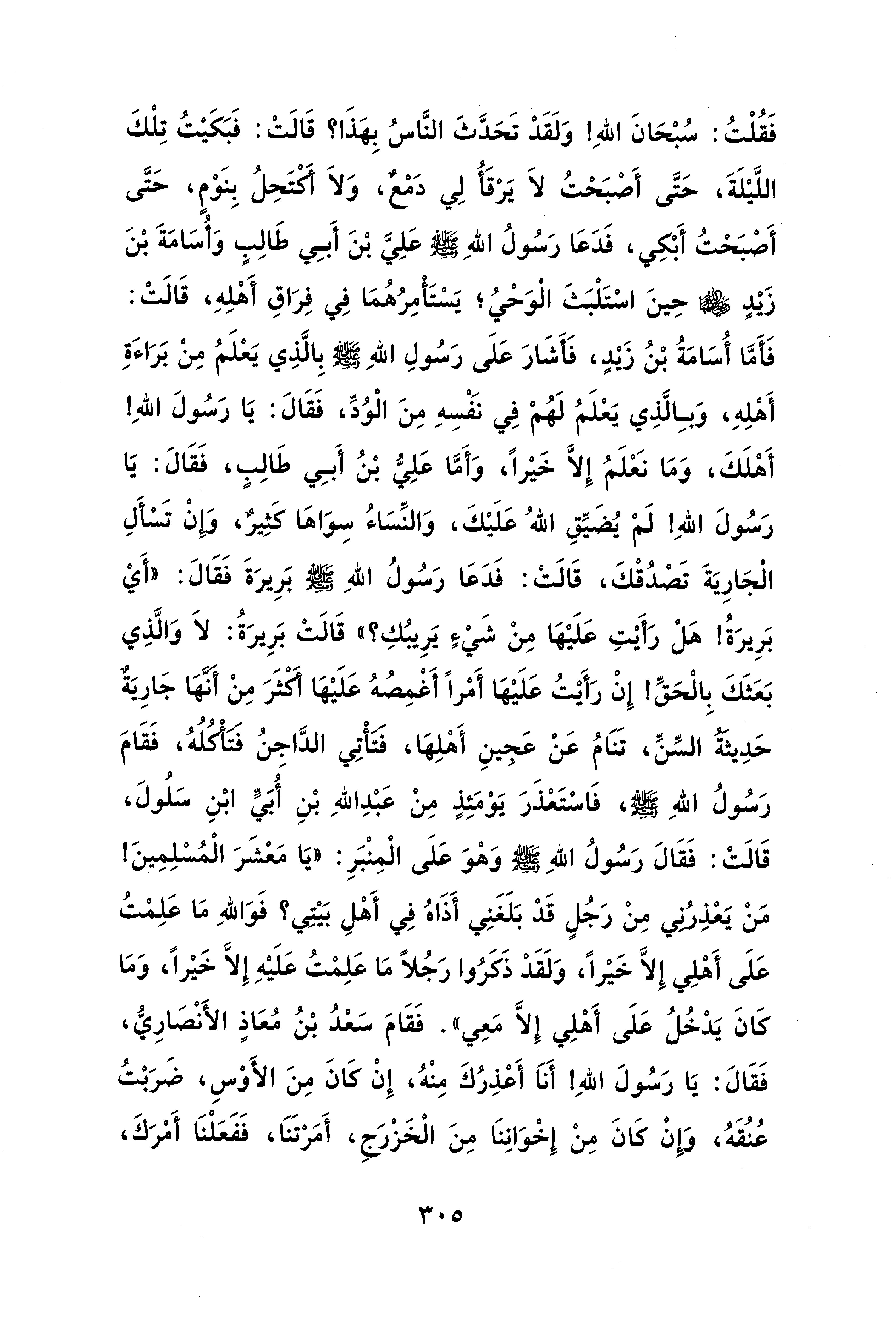 فَقُلْتُ: سُبْحَانَ اللهِ! وَلَقَدْ تَحَدَّثَ النَّاسُ بِهَذَا؟ قَالَتْ: فَبَكَيْتُ تِلْكَ اللَّيْلَةَ، حَتَّى أَصْبَحْتُ لَا يَرْقَأُ لِي دَمْعٌ، وَلَا أَكْتَحِلُ بِنَوْمٍ، حَتَّى أَصْبَحْتُ أَبْكِي، فَدَعَا رَسُولُ اللهِ - صلى الله عليه وسلم - عَلِيَّ بْنَ أَبِي طَالِبٍ وَأُسَامَةَ بْنَ زَيْدٍ - رضي الله عنهما - حِينَ اسْتَلْبَثَ الْوَحْيُ؛ يَسْتَأْمِرُهُمَا فِي فِرَاقِ أَهْلِهِ، قَالَتْ: فَأَمَّا أُسَامَةُ بْنُ زَيْدٍ، فَأَشَارَ عَلَى رَسُولِ اللهِ - صلى الله عليه وسلم - بِالَّذِي يَعْلَمُ مِنْ بَرَاءَةِ أَهْلِهِ، وَبِالَّذِي يَعْلَمُ لَهُمْ فِي نفسِهِ مِنَ الْوُدِّ، فَقَالَ: يَا رَسُولَ اللهِ! أَهْلَكَ، وَمَا نَعْلَمُ إِلَّا خَيْرًا، وَأَمَّا عَلِيُّ بْنُ أَبِي طَالِبٍ، فَقَالَ: يَا رَسُولَ اللهِ! لَمْ يُضَيِّقِ اللهُ عَلَيْكَ، وَالنِّسَاءُ سِوَاهَا كثِيرٌ، وَإِنْ تَسْأَلِ الْجَارِيَةَ تَصْدُقْكَ، قَالَتْ: فَدَعَا رَسُولُ اللهِ - صلى الله عليه وسلم - بَرِيرَةَ فَقَالَ: "أَيْ بَرِيرَةُ! هَلْ رَأَيْتِ عَلَيْهَا مِنْ شَيْءِ يَرِيبُكِ؟ " قَالَتْ بَرِيرَةُ: لَا وَالَّذِي بَعَثَكَ بِالْحَقِّ! إِنْ رَأَيْتُ عَلَيْهَا أَمْرًا أَغْمِصُهُ عَلَيْهَا أكثَرَ مِنْ أَنَّهَا جَارِيَةٌ حَدِيثَةُ السِّنِّ، تَنَامُ عَنْ عَجينِ أَهْلِهَا، فتأَتِي الدَّاجِنُ فَتَأْكلُهُ، فَقَامَ رَسُولُ اللهِ - صلى الله عليه وسلم -، فَاسْتَعْذَرَ يَوْمَئِذٍ مِنْ عَبْدِ اللهِ بْنِ أُبَيٍّ بْنِ سَلُولَ، قَالَتْ: فَقَالَ رَسُولُ اللهِ - صلى الله عليه وسلم - وَهْوَ عَلَى الْمِنْبَرِ: "يَا مَعْشَرَ الْمُسْلِمِينَ! مَنْ يَعْذِرُنِي مِنْ رَجُلٍ قَدْ بَلَغَنِي أَذَاهُ فِي أَهْلِ بَيْتِي؟ فَوَاللهِ مَا عَلِمْتُ عَلَى أَهْلِي إِلَّا خَيْرًا، وَلَقَدْ ذَكَرُوا رَجُلًا مَا عَلِمْتُ عَلَيْهِ إِلَّا خَيْرًا، وَمَا كَانَ يَدْخُلُ عَلَى أَهْلِي إِلَّا مَعِي". فَقَامَ سَعْدُ بْنُ مُعَاذٍ الأَنْصَارِيُّ، فَقَالَ: يَا رَسُولَ اللهِ! أَنَا أَعْذِرُكَ مِنْهُ، إِنْ كَانَ مِنَ الأَوْسِ، ضَرَبْتُ عُنُقَهُ، وَإِنْ كَانَ مِنْ إِخْوَانِنَا مِنَ الْخَزْرجِ، أَمَرْتَنَا، فَفَعَلْنَا أَمْرَكَ،