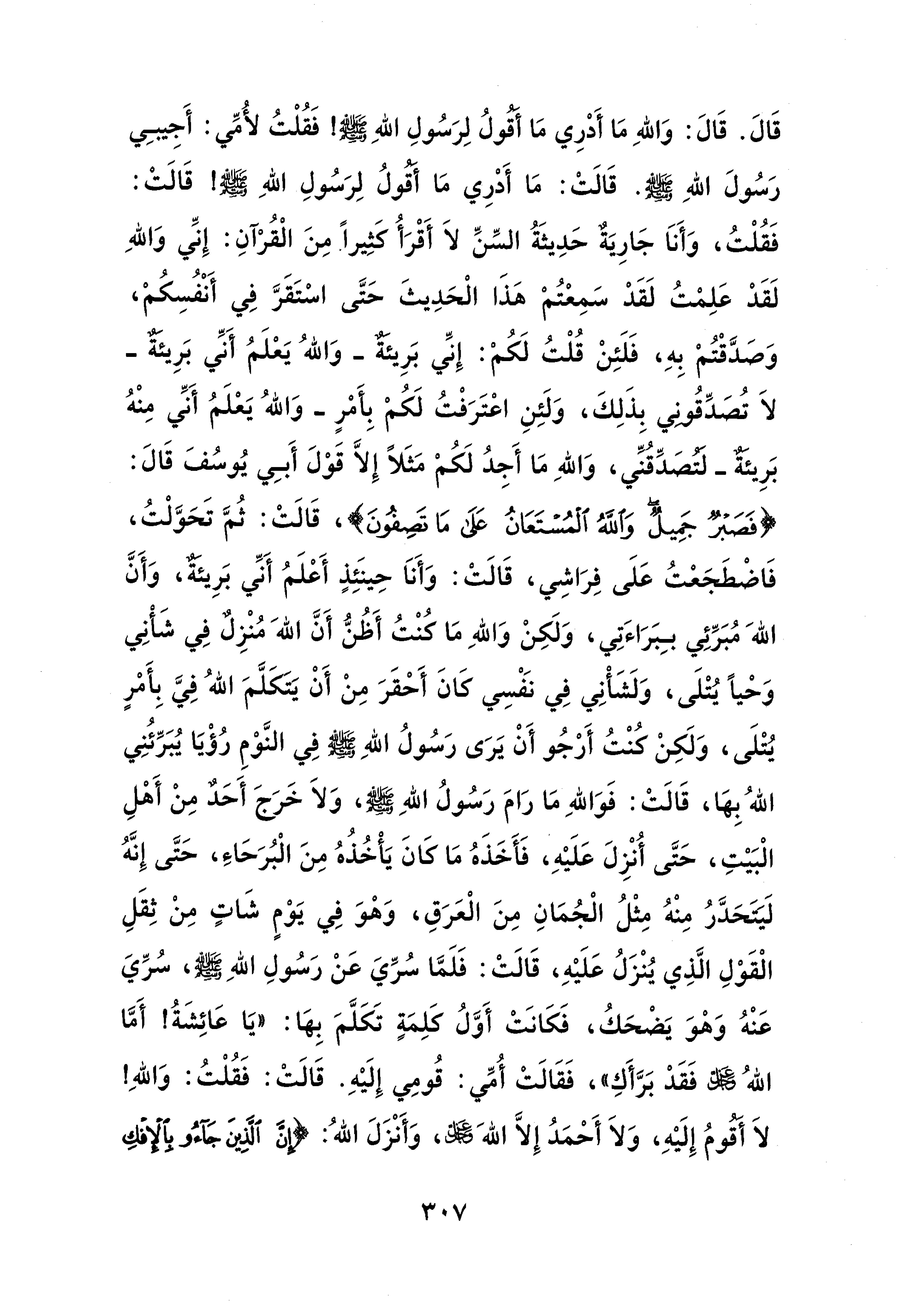 قَالَ. قَالَ: وَاللهِ مَا أَدْرِي مَا أَقُولُ لِرَسُولِ اللهِ - صلى الله عليه وسلم - فَقُلْتُ لأُمِّي: أَجِيبِي رَسُولَ اللهِ - صلى الله عليه وسلم -. قَالَتْ: مَا أَدْرِي مَا أَقُولُ لِرَسُولِ اللهِ - صلى الله عليه وسلم -! قَالَتْ: فَقُلْتُ، وَأَنَا جَارِيَةٌ حَدِيثَةُ السِّنِّ لَا أَقْرَأُ كَثِيرًا مِنَ الْقُرْآنِ: إِنِّي وَاللهِ لَقَدْ عَلِمْتُ لَقَدْ سَمِعْتُمْ هَذَا الْحَدِيثَ حَتَّى اسْتَقَرَّ فِي أَنْفُسِكُمْ، وَصَدَّقْتُمْ بِهِ، فَلَئِنْ قُلْتُ لَكُمْ: إِنِّي بَرِيئَةٌ -وَاللهُ يَعْلَمُ أَنِّي بَرِيئَةٌ- لَا تُصَدِّقُونِي بِذَلِكَ، وَلَئِنِ اعْتَرَفْتُ لَكُمْ بِأَمْرٍ -وَاللهُ يَعْلَمُ أَنِّي مِنْهُ بَرِيئَةٌ- لتصَدِّقُنِّي، وَاللهِ مَا أَجِدُ لَكُمْ مَثَلًا إِلَّا قَوْلَ أَبِي يُوسُفَ قَالَ: {فَصَبْرٌ جَمِيلٌ وَاللَّهُ الْمُسْتَعَانُ عَلَى مَا تَصِفُونَ} قَالَتْ: ثُمَّ تَحَوَّلْتُ، فَاضْطَجَعْتُ عَلَى فِرَاشِي، قَالَتْ: وَأَنَا حِينَئِذٍ أَعْلَمُ أَنِّي بَرِيئَةٌ، وَأَنَّ اللهَ مُبَرِّئِي بِبَرَاءَتِي، وَلَكِنْ وَاللهِ مَا كنْتُ أَظُنُّ أَنَّ اللهَ مُنْزِلٌ فِي شَأْنِي وَحْيًا يُتْلَى، وَلَشَأْنِي فِي نَفْسِي كَانَ أَحْقَرَ مِنْ أَنْ يَتَكَلَّمَ اللهُ فِيَّ بِأَمْرٍ يُتْلَى، وَلَكِنْ كنْتُ أَرْجُو أَنْ يَرَى رَسُولُ اللهِ - صلى الله عليه وسلم - فِي النَّوْمِ رُؤْيَا يُبَرِّئُنِي اللهُ بِهَا، قَالَتْ: فَوَاللهِ مَا رَامَ رَسُولُ اللهِ - صلى الله عليه وسلم -، وَلَا خَرَجَ أَحَدٌ مِنْ أَهْلِ الْبَيْتِ، حَتَّى أُنْزِلَ عَلَيْهِ، فَأَخَذَهُ مَا كَانَ يَأَخُذُهُ مِنَ الْبُرَحَاءِ، حَتَّى إِنَّهُ لَيَتَحَدَّرُ مِنْهُ مِثْلُ الْجُمَانِ مِنَ الْعَرَقِ، وَهْوَ فِي يَوْمٍ شَاتٍ مِنْ ثِقَلِ الْقَوْلِ الَّذِي يُنْزَلُ عَلَيْهِ، قَالَتْ: فَلَمَّا سُرِّيَ عَنْ رَسُولِ اللهِ - صلى الله عليه وسلم -، سُرِّيَ عَنْهُ وَهْوَ يَضْحَكُ، فَكَانَتْ أَوَّلُ كَلِمَةٍ تَكَلَّمَ بِهَا: "يَا عَائِشَةُ! أَمَّا اللهُ عز وجل فَقَدْ بَرَّأَكِ"، فَقَالَتْ أُمِّي: قُومِي إِلَيْهِ. قَالَتْ: فَقُلْتُ: وَاللهِ! لَا أقومُ إِلَيْهِ، وَلَا أَحْمَدُ إِلَّا اللهَ عز وجل، وَأَنْزَلَ اللهُ: {إِنَّ الَّذِينَ جَاءُوا بِالْإِفْكِ