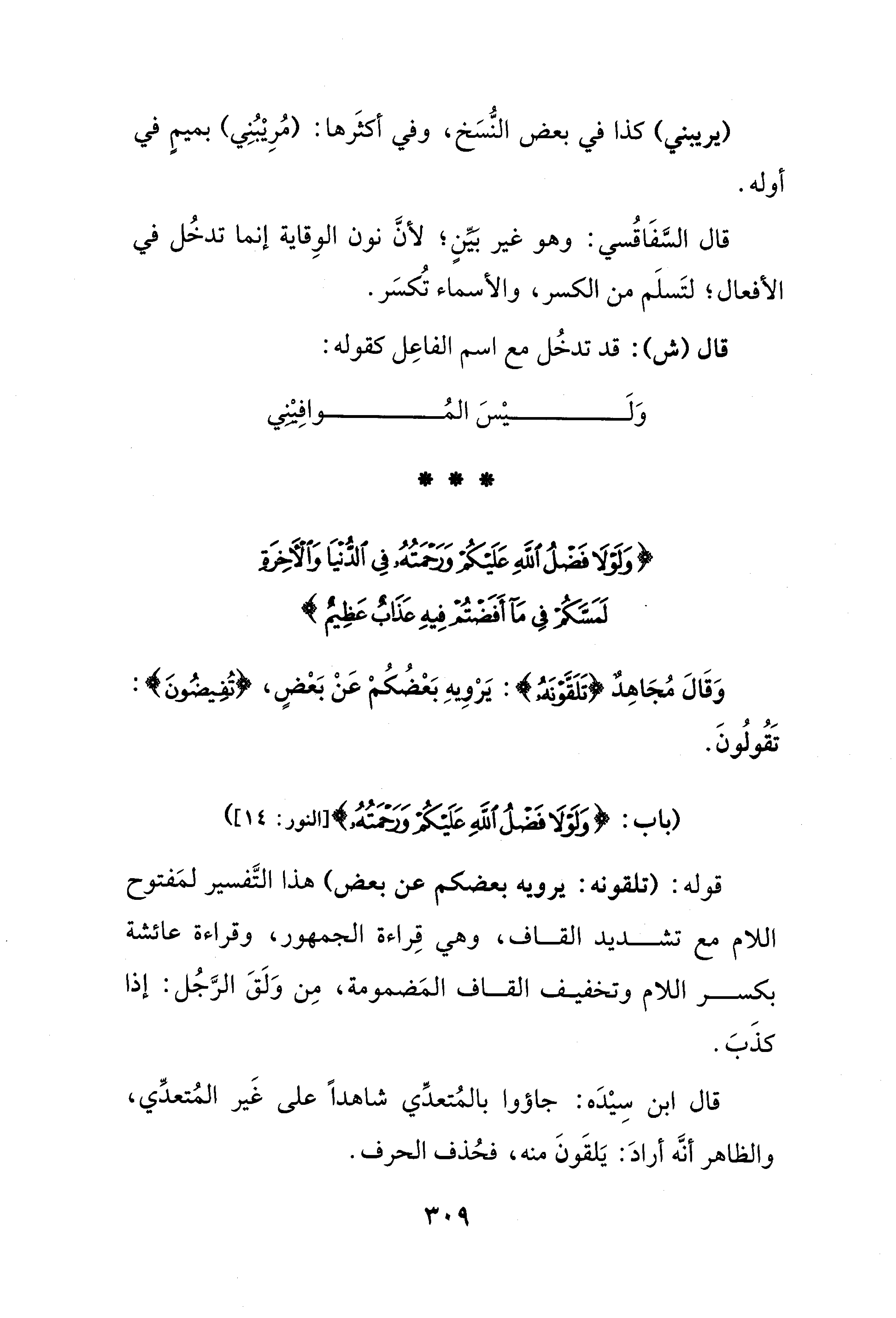 قال السَّفَاقُسي: وهو غير بَيِّنٍ؛ لأنَ نون الوِقاية إنما تدخُل في الأفعال؛ لتَسلَم من الكسر، والأسماء تُكسَر.