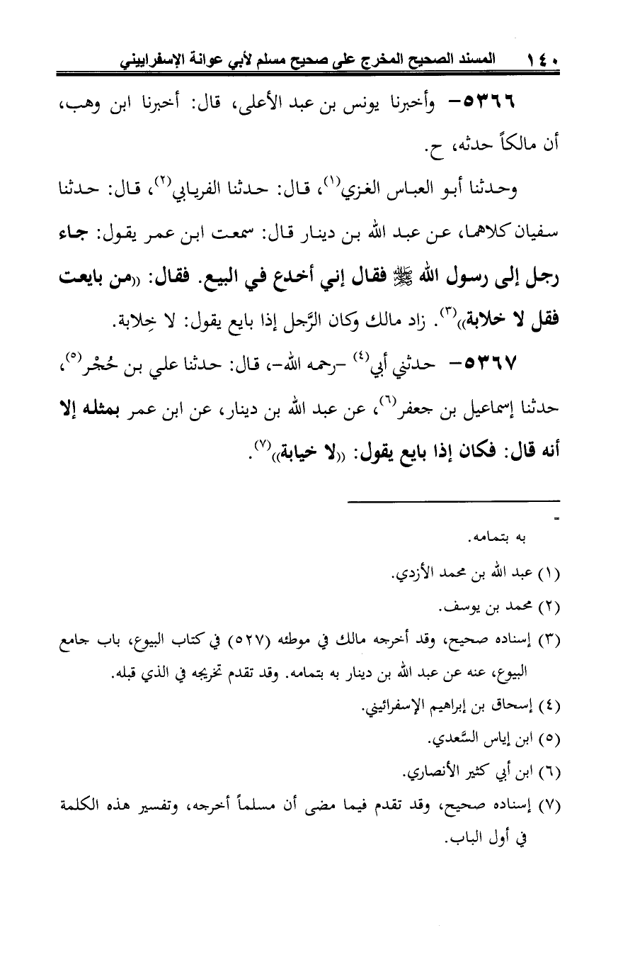 5367 - حدثني أبي (¬1) -رحمه الله-، قال: حدثنا علي بن حُجْر (¬2)، حدثنا إسماعيل بن جعفر (¬3)، عن عبد الله بن دينار، عن ابن عمر بمثله إلا أنه قال: فكان إذا بايع يقول: "لا خيابة" (¬4).