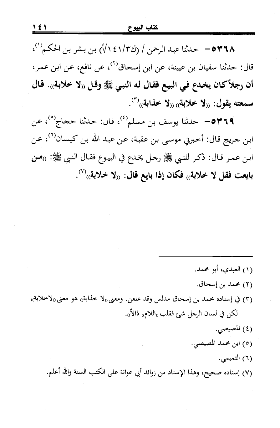5368 - حدثنا عبد الرحمن بن بشر بن الحكم (¬1)، قال: حدثنا سفيان بن عيينة، عن ابن إسحاق (¬2)، عن نافع، عن ابن عمر، أن رجلًا كان يخدع في البيع فقال له النبي -صلى الله عليه وسلم- وقل "لا خلابة". قال سمعته يقول: "لا خلابة" "لا خذابة" (¬3).