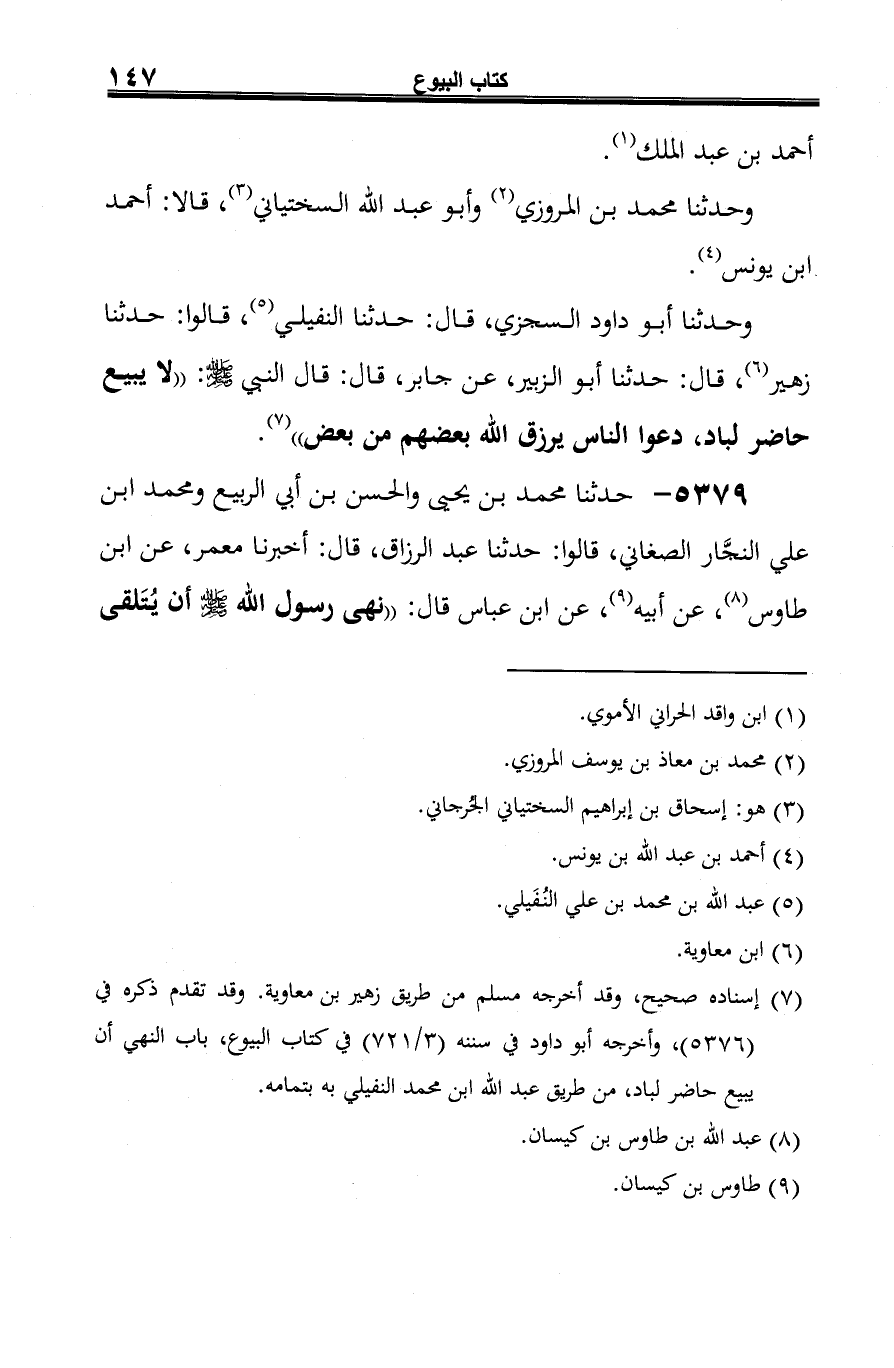 5379 - حدثنا محمد بن يحيى والحسن بن أبي الربيع ومحمد ابن علي النجَّار الصغاني، قالوا: حدثنا عبد الرزاق، قال: أخبرنا معمر، عن ابن طاوس (¬1)، عن أبيه (¬2)، عن ابن عباس قال: "نهى رسول الله -صلى الله عليه وسلم- أن يُتَلقى