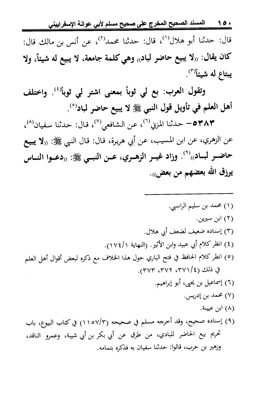 5383 - حدثنا المزني (¬1)، عن الشافعي (¬2)، قال: حدثنا سفيان (¬3)، عن الزهري، عن ابن المسيب، عن أبي هريرة، قال: قال النبي -صلى الله عليه وسلم-: "لا يبيع حاضر لباد" (¬4). وزاد غير الزهري، عن النبي -صلى الله عليه وسلم-: "دعوا الناس يرزق الله بعضهم من بعض".