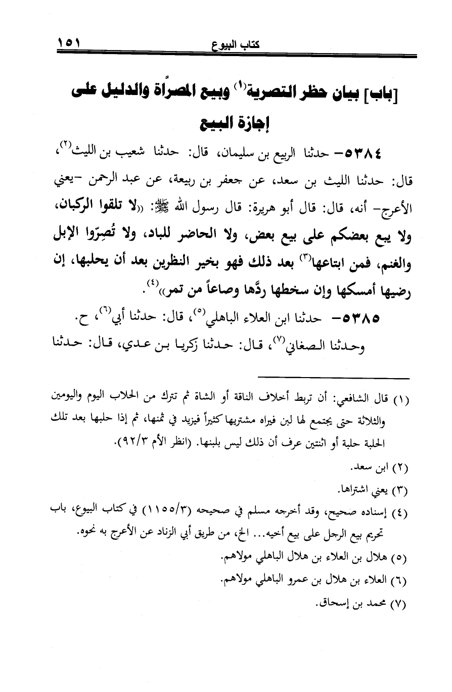 5384 - حدثنا الربيع بن سليمان، قال: حدثنا شعيب بن الليث (¬1)، قال: حدثنا الليث بن سعد، عن جعفر بن ربيعة، عن عبد الرحمن -يعني الأعرج- أنه، قال: قال أبو هريرة: قال رسول الله -صلى الله عليه وسلم-: "لا تلقوا الركبان، ولا يبع بعضكم على بيع بعض، ولا الحاضر للباد، ولا تُصِرّوا الإبل والغنم، فمن ابتاعها (¬2) بعد ذلك فهو بخير النظرين بعد أن يحلبها، إن رضيها أمسكها وإن سخطها ردَّها وصاعًا من تمر" (¬3).
