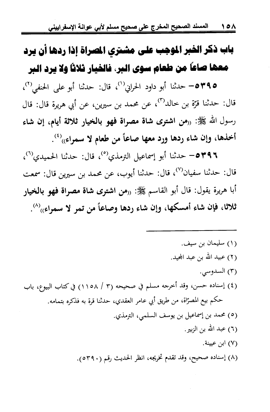 5396 - حدثنا أبو إسماعيل الترمذي (¬1)، قال: حدثنا الحميدي (¬2)، قال: حدثنا سفيان (¬3)، قال: حدثنا أيوب، عن محمد بن سيرين قال: سمعت أبا هريرة يقول: قال أبو القاسم -صلى الله عليه وسلم-: "من اشترى شاة مصراة فهو بالخيار ثلاثا، فإن شاء أمسكها، وإن شاء ردها وصاعًا من تمر لا سمراء" (¬4).