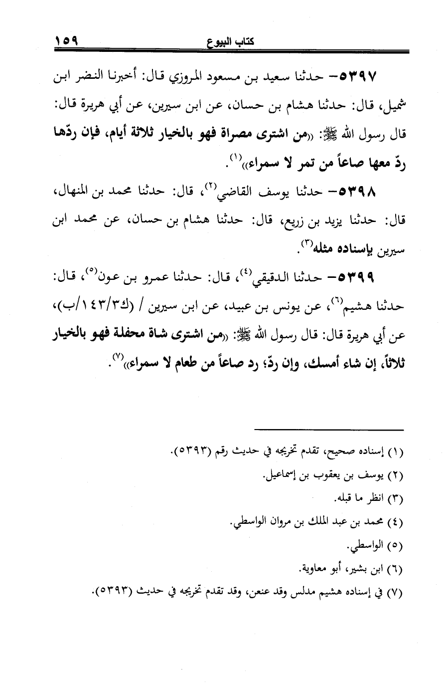 5399 - حدثنا الدقيقي (¬1)، قال: حدثنا عمرو بن عون (¬2)، قال: حدثنا هشيم (¬3)، عن يونس بن عبيد، عن ابن سيرين، عن أبي هريرة قال: قال رسول الله -صلى الله عليه وسلم-: "من اشترى شاة محفلة فهو بالخيار ثلاثًا، إن شاء أمسك، وإن ردّ؛ رد صاعًا من طعام لا سمراء" (¬4).