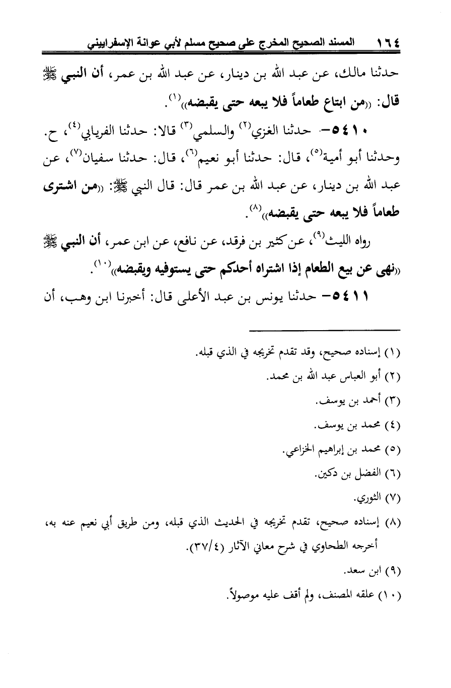 وحدثنا أبو أمية (¬4)، قال: حدثنا أبو نعيم (¬5)، قال: حدثنا سفيان (¬6)، عن عبد الله بن دينار، عن عبد الله بن عمر قال: قال النبي -صلى الله عليه وسلم-: "من اشترى طعامًا فلا يبعه حتى يقبضه" (¬7).